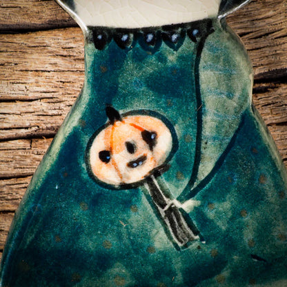 Made with fired glazed ceramics, this little witch, jack-o-lantern and cat is carved with delicate patterns that make each ornament a one of a kind work of art.