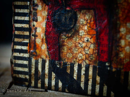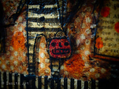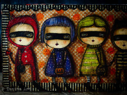 Seeing them walk by inspired me to celebrate them with this 6 x 12 inches original mixed media collage painting on wood, where I used a lot of different media like acrylics, pastels, pencils, oils and collage paper to create an original artwork that captures the whimsical joy of Halloween night when you are a kid.