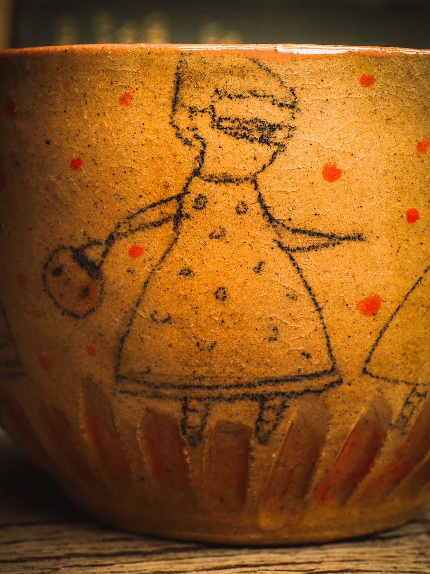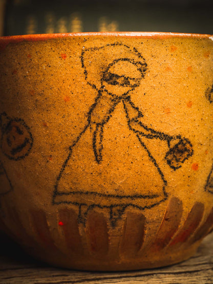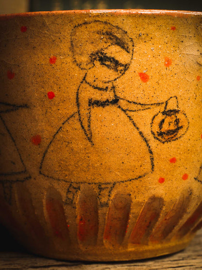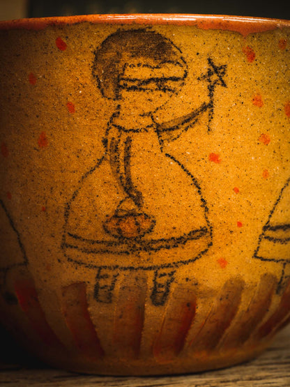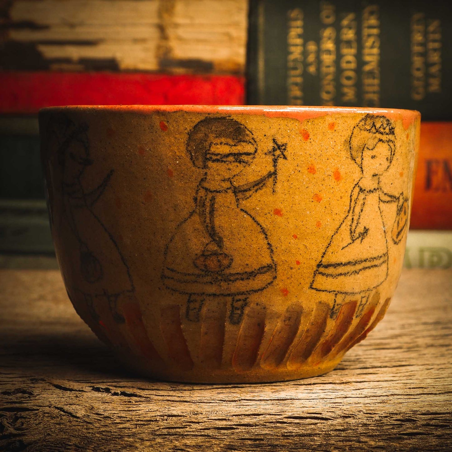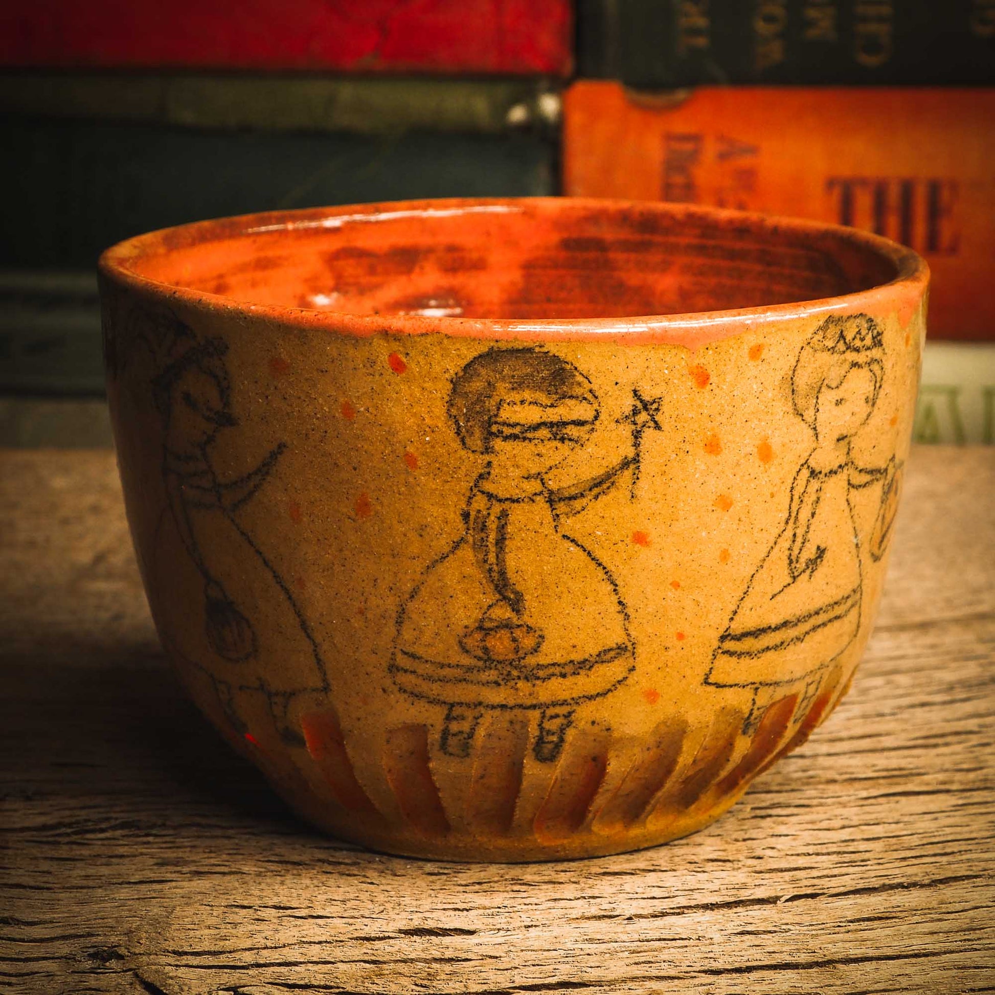 An original ceramic bowl by Idania salcido, the artist behind Danita Art. It measures 4 x 4 x 3 Inches, made with wheel thrown clay, hand decorated and glazed by me with orange tones. The hand drawn witch girls give it a nice, folk art primitive feel to it.