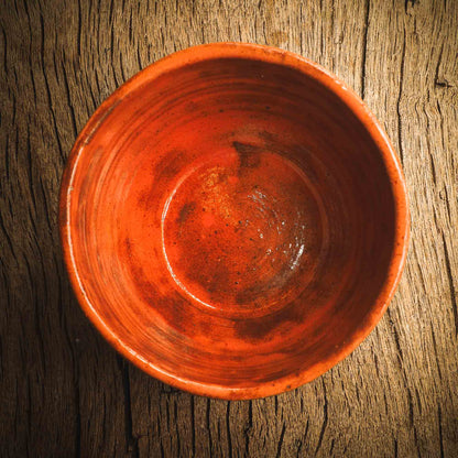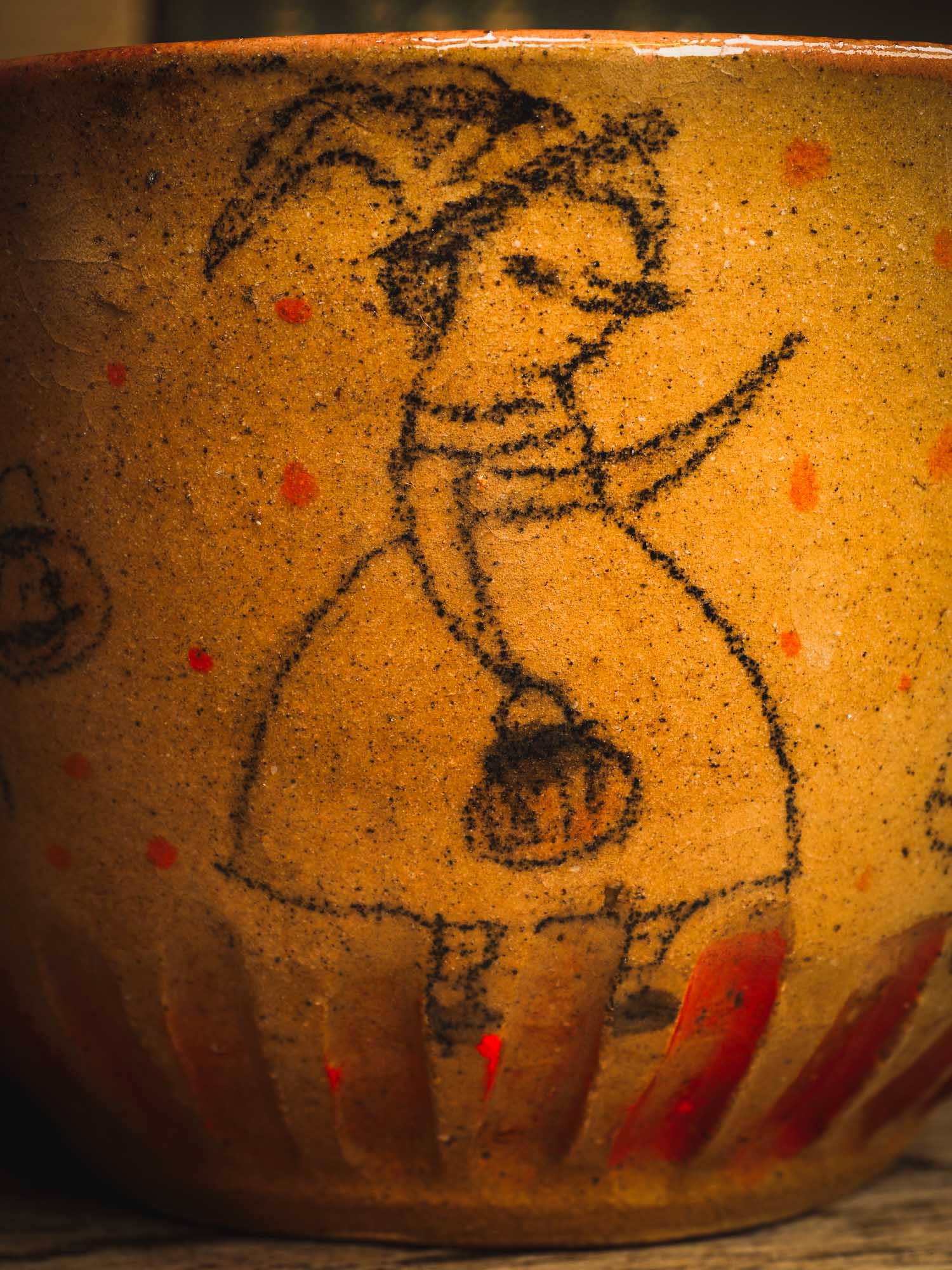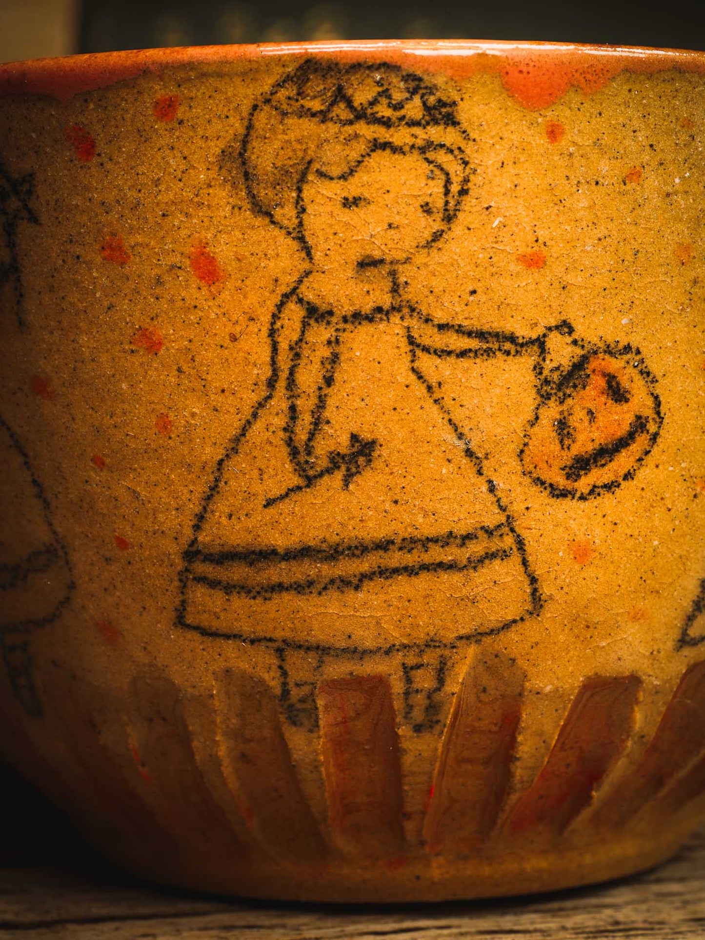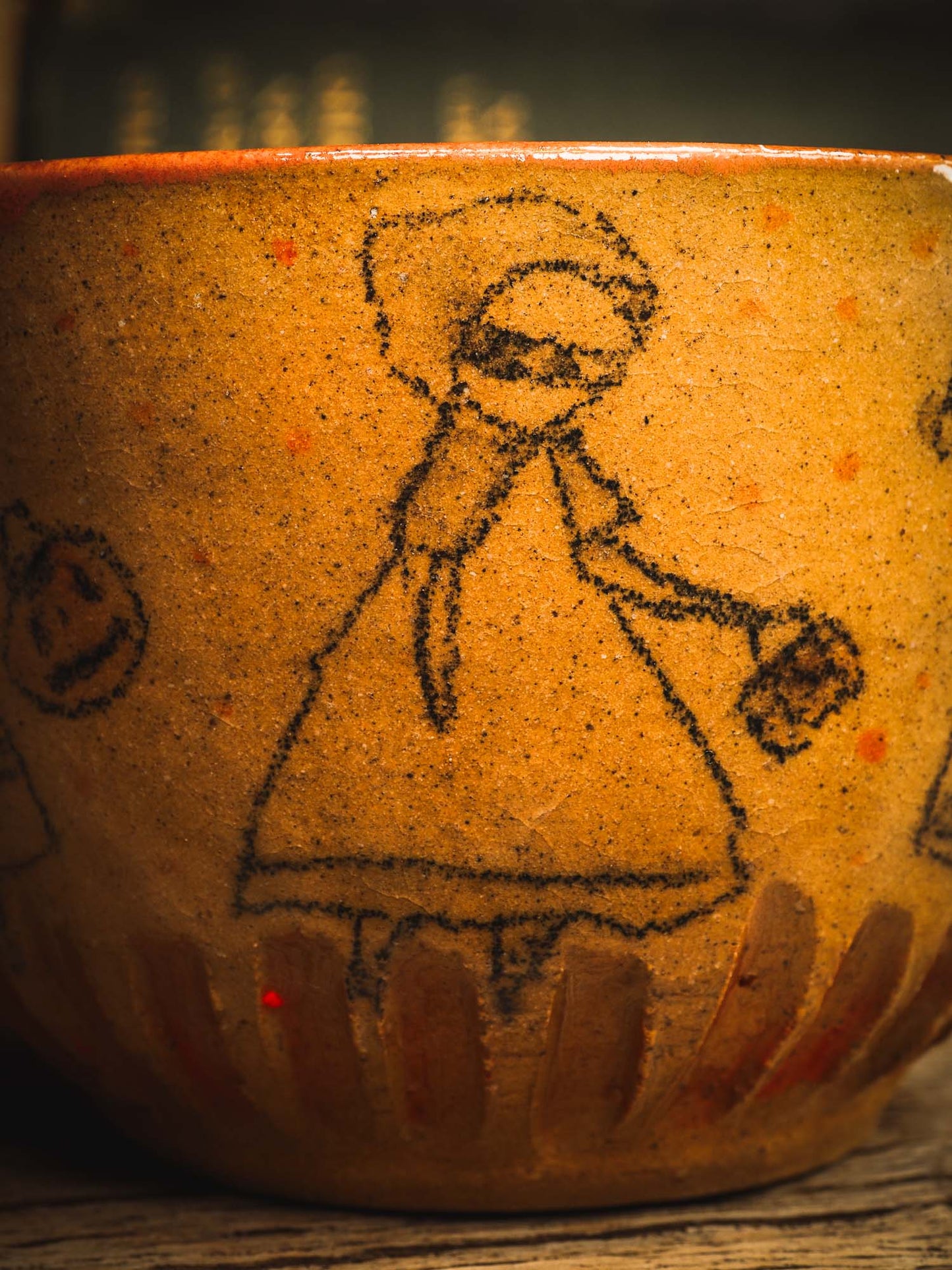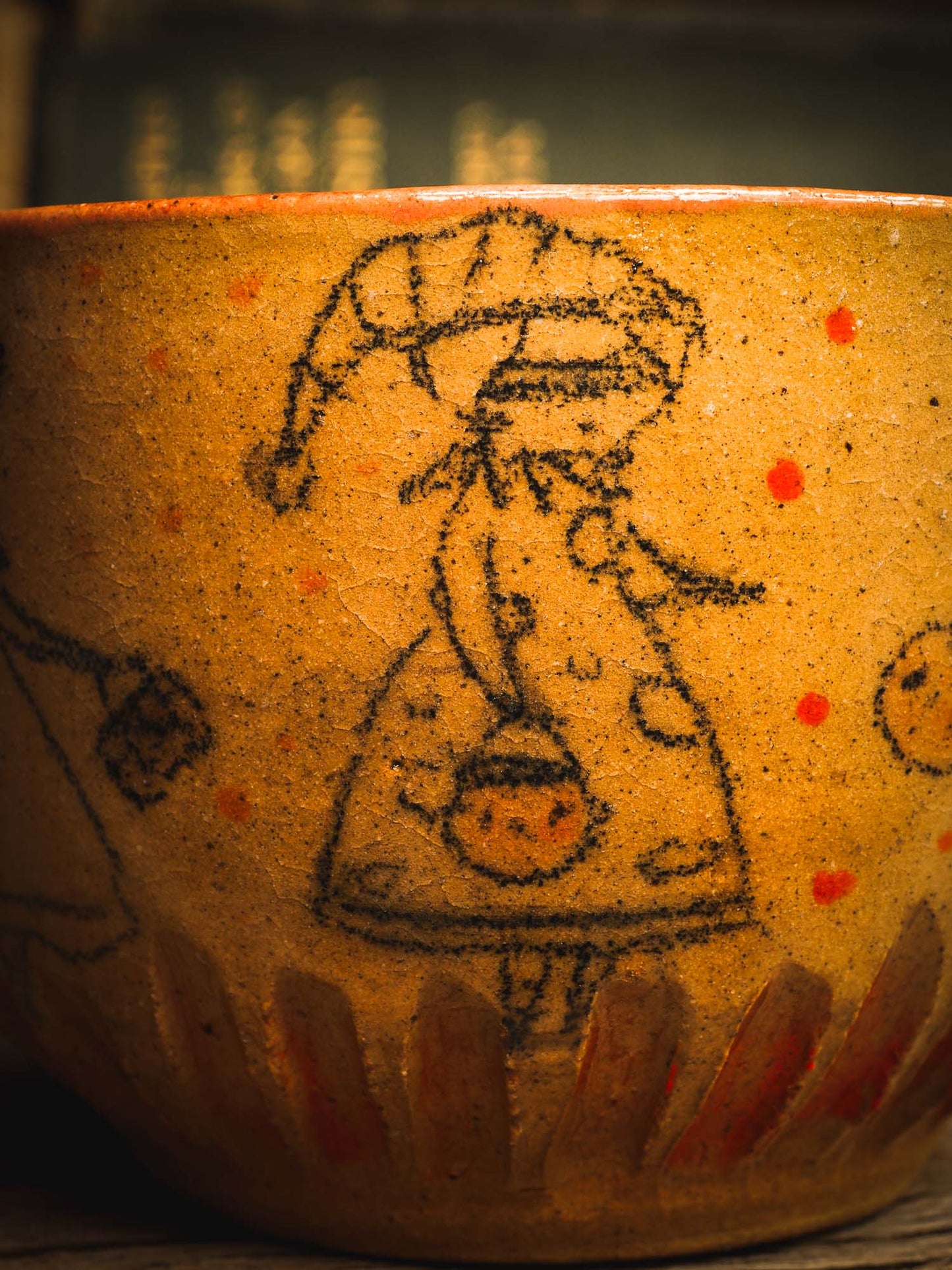 An original ceramic bowl by Idania salcido, the artist behind Danita Art. It measures 4 x 4 x 3 Inches, made with wheel thrown clay, hand decorated and glazed by me with orange tones. The hand drawn witch girls give it a nice, folk art primitive feel to it.
