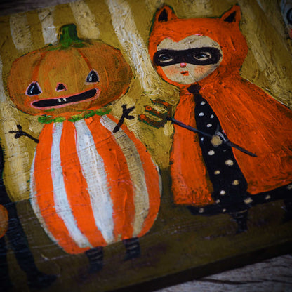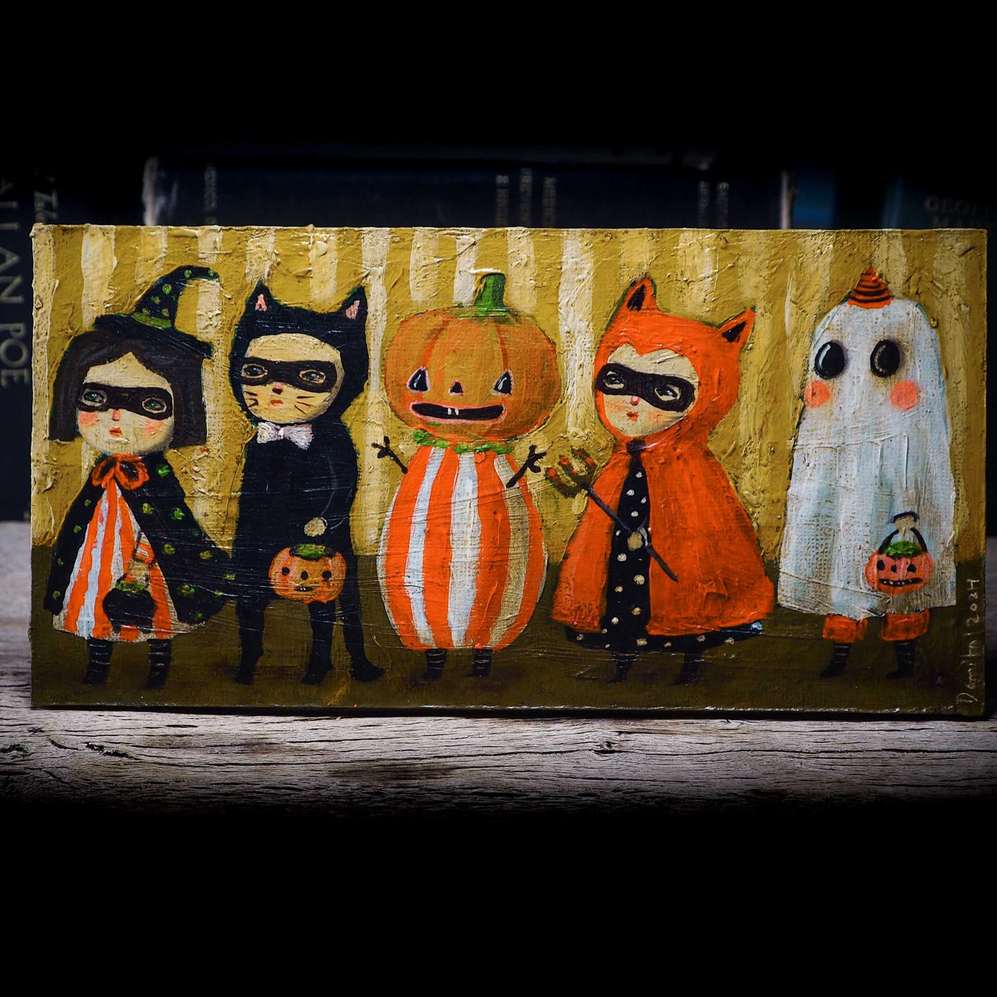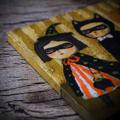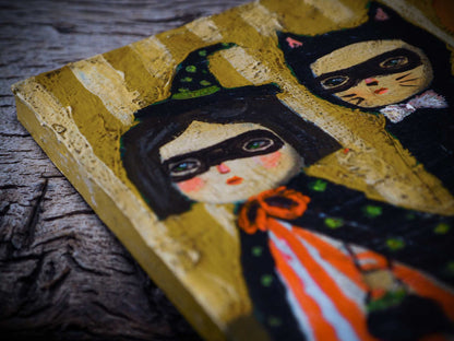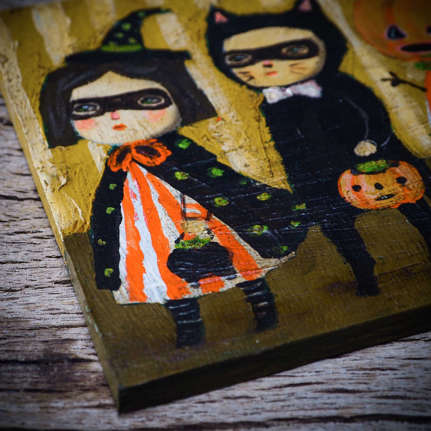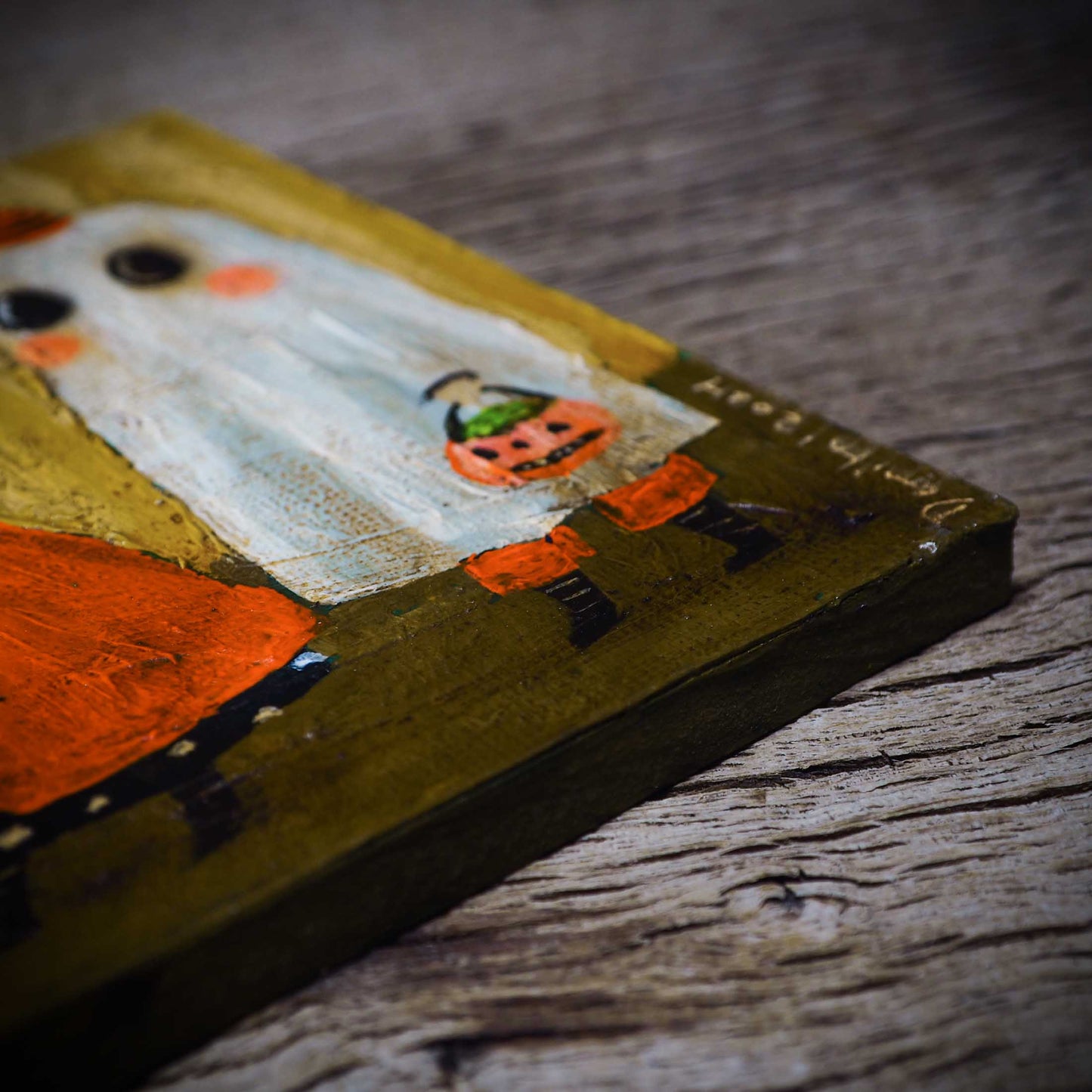 Halloween is coming, and my inspiration has just started! And for my first collection, I create a series of outsider folk art paintings with bright colors and rough textures over a wood block.