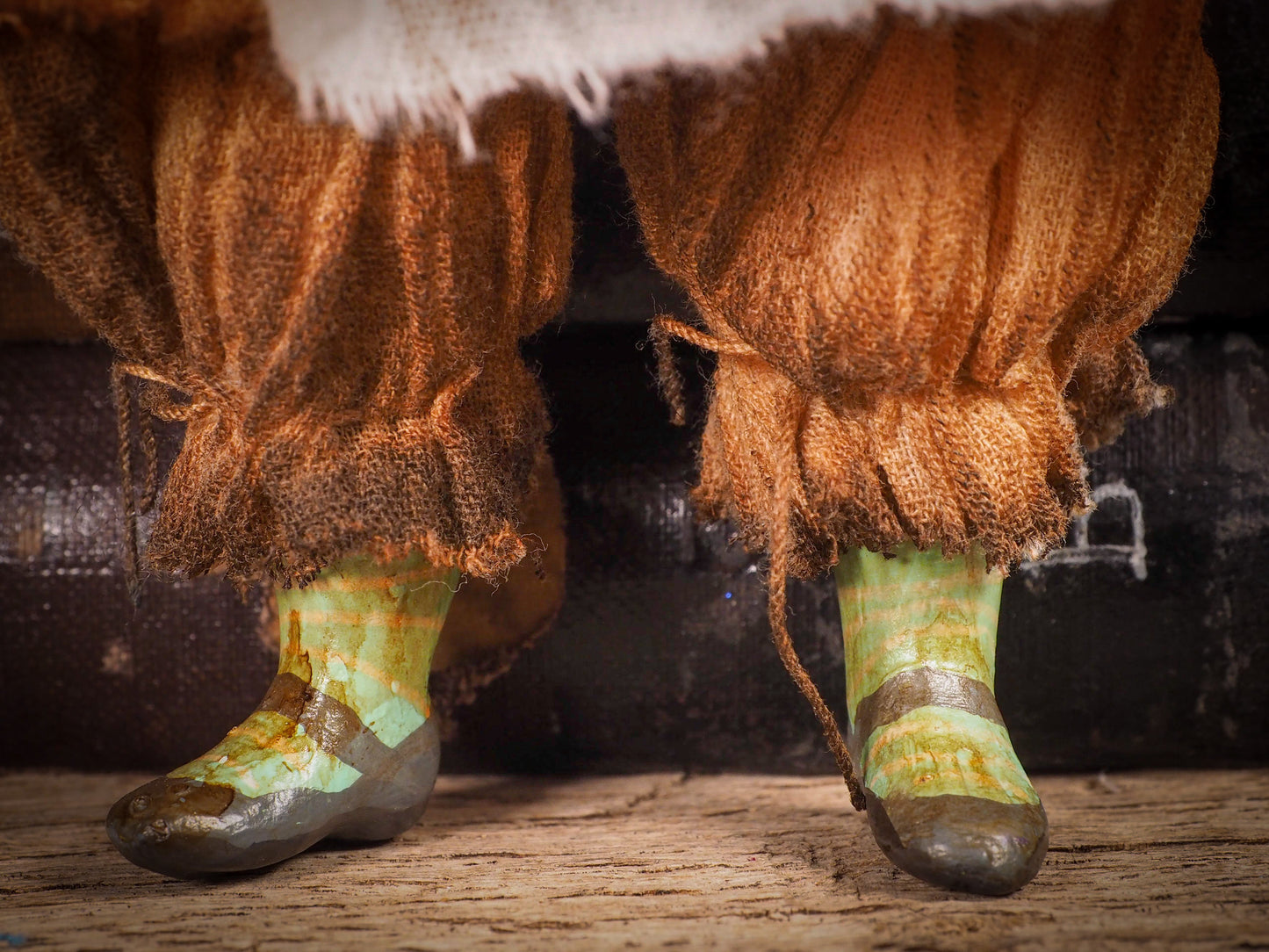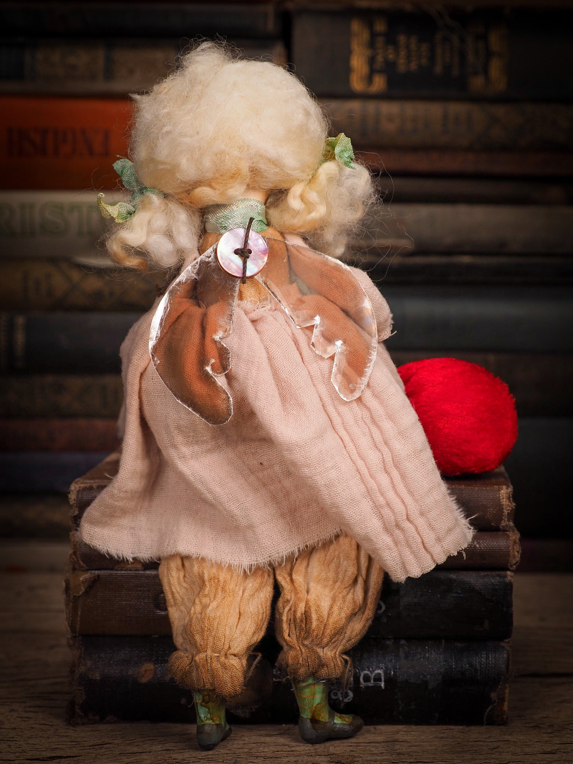 Approximately 8 Inches tall. Original art doll in hand dyed fabric with natural pigments, polymer clay face and mixed media applications.