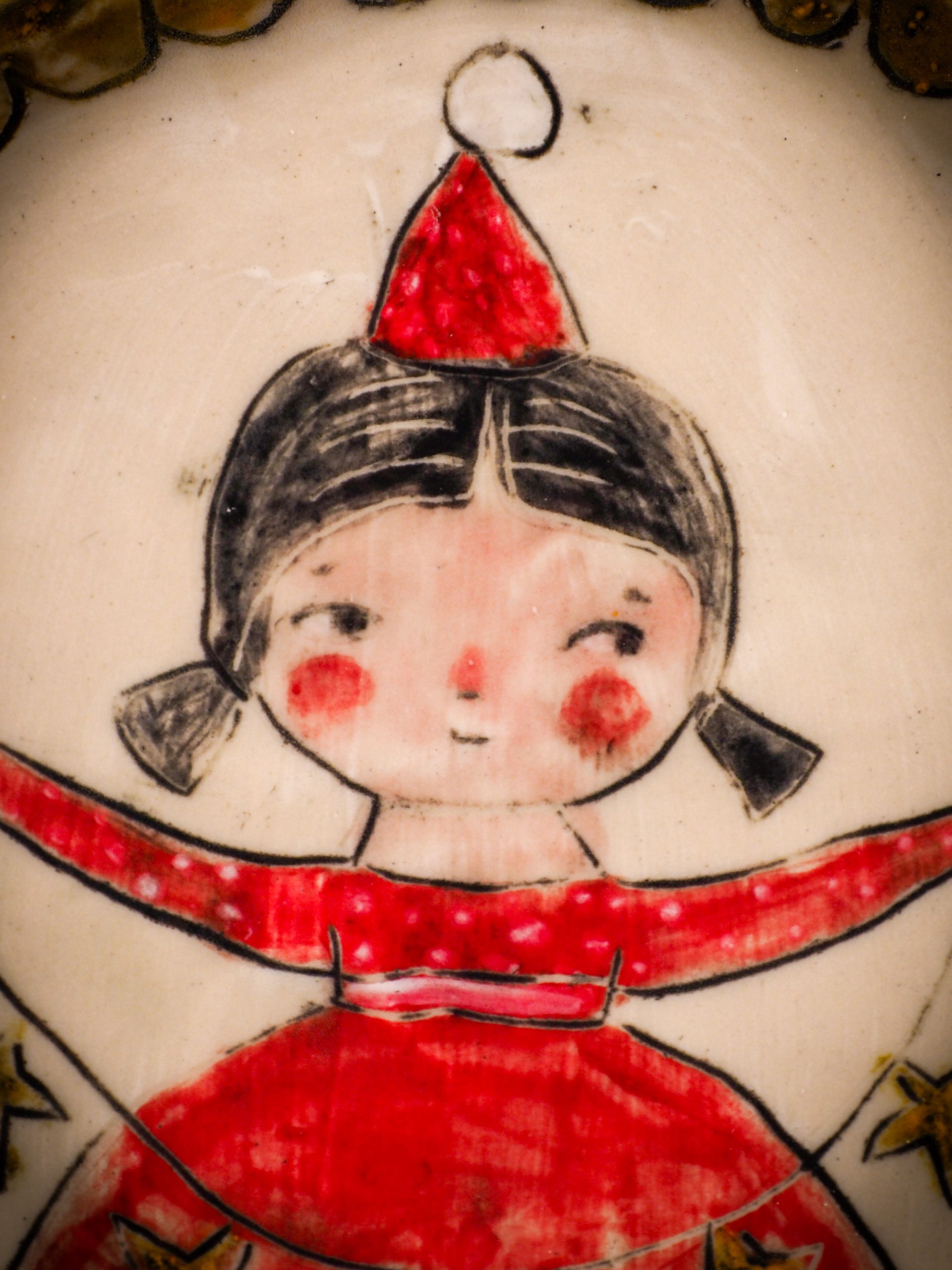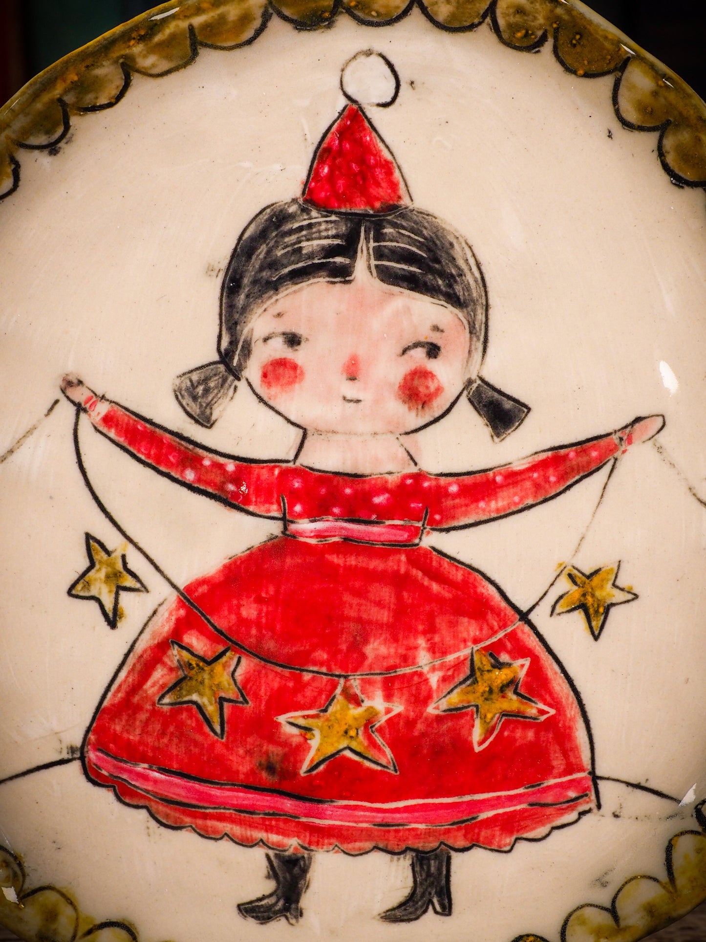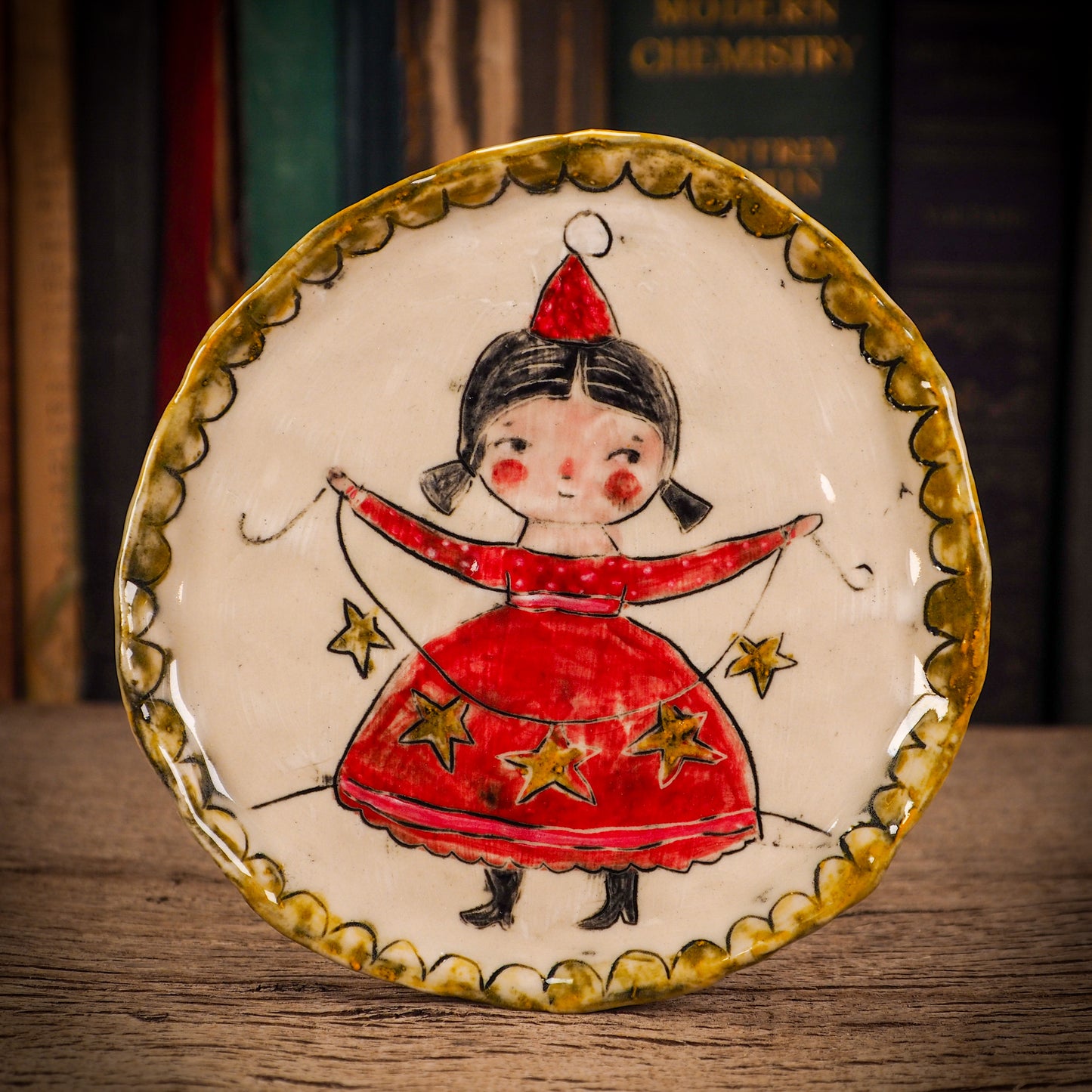 You are looking at original handmade ceramic Christmas Holiday cake plate by Idania Salcido, the artist behind Danita Art. Hand made with glazed stoneware at Idania's ceramic studio, the ornament measures approx. 5 inches diameter, painted and illustrated by the artist.