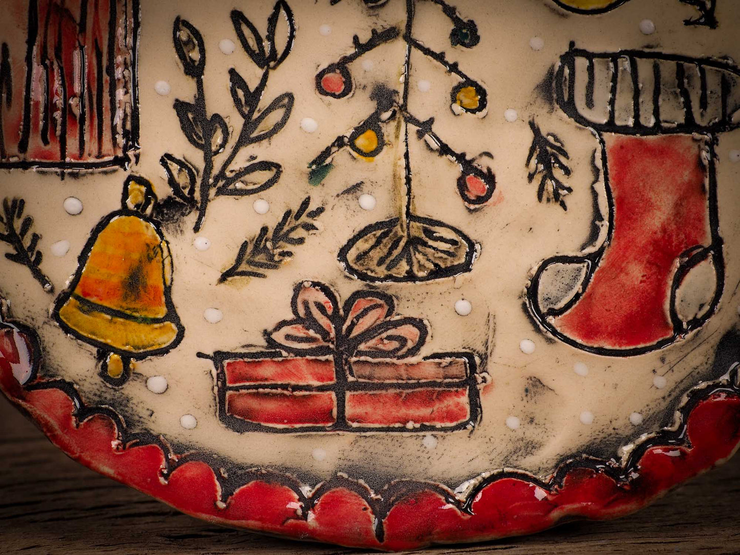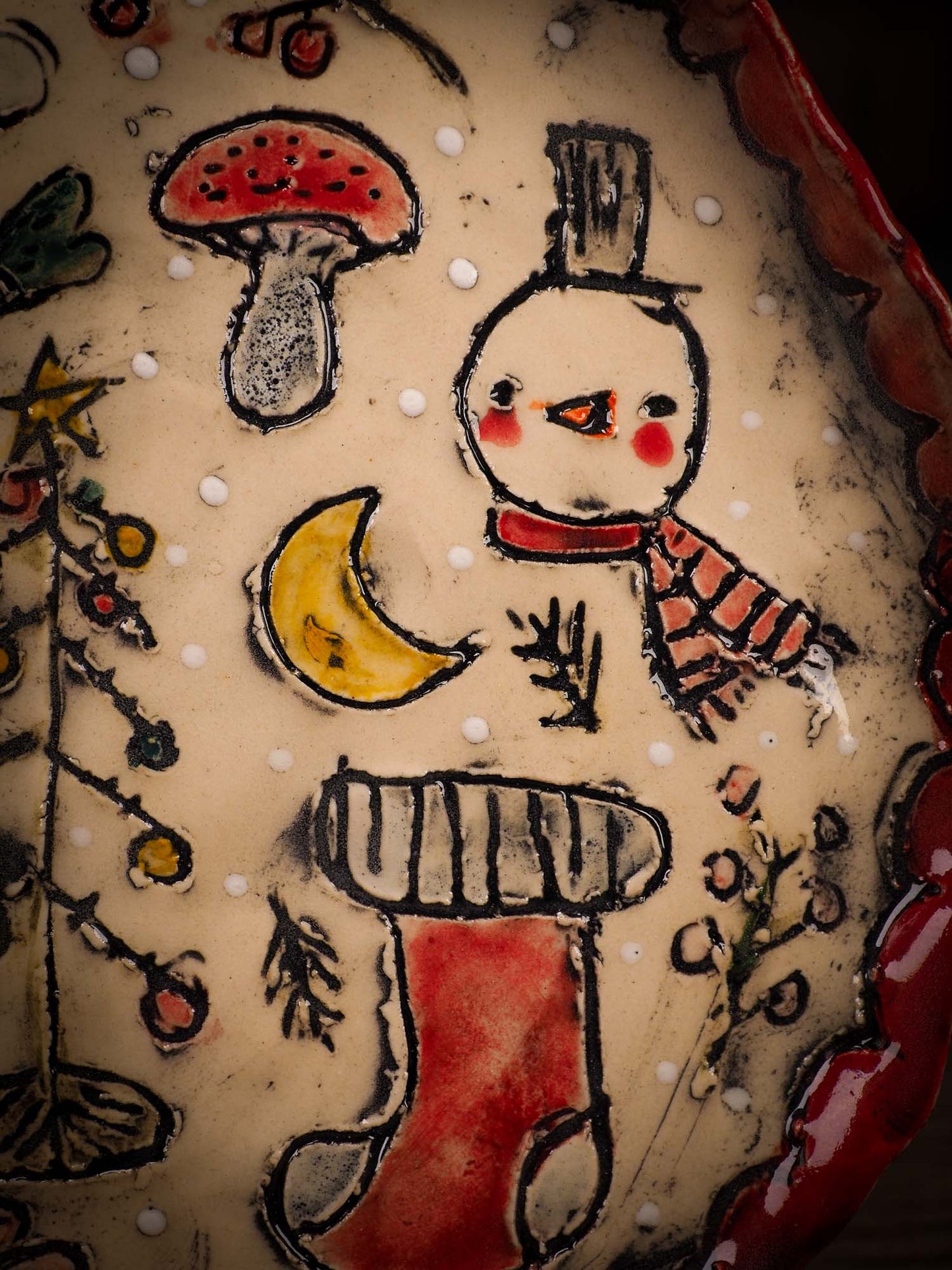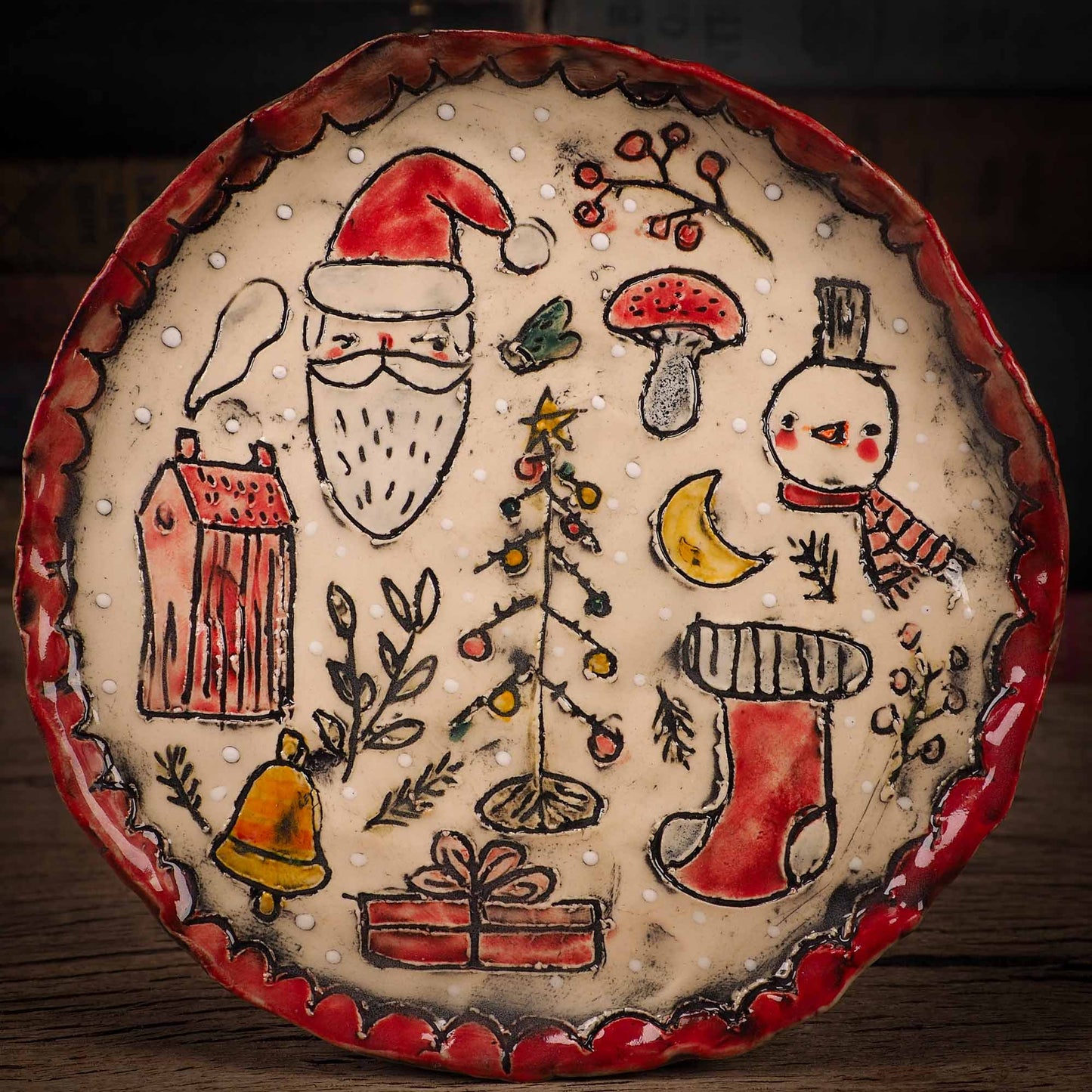 You are looking at original handmade ceramic Christmas Holiday cake dessert plate by Idania Salcido, the artist behind Danita Art. Hand made with glazed stoneware at Idania's ceramic studio, the ornament measures approx. 5 inches diameter, painted and illustrated by the artist.
