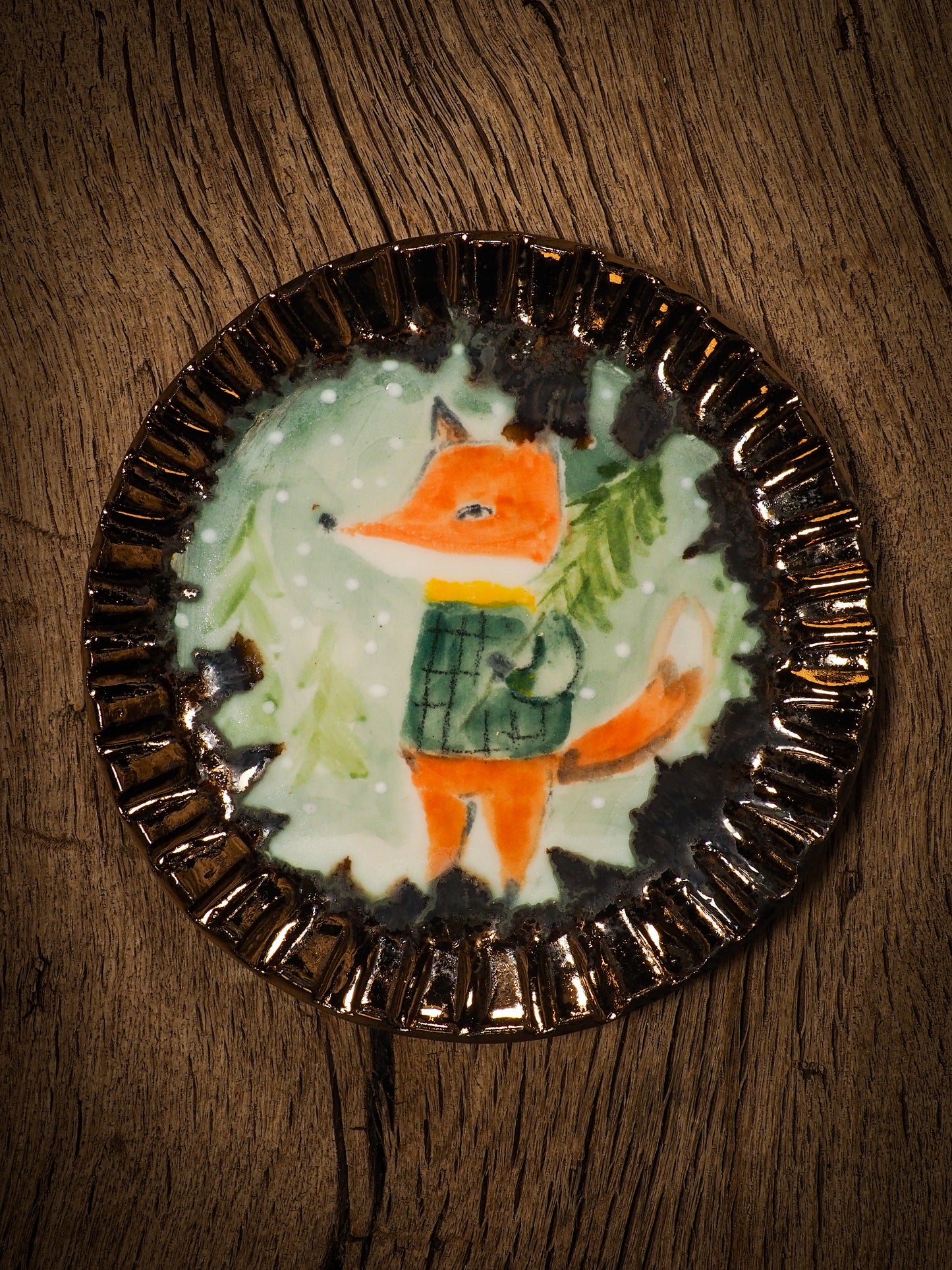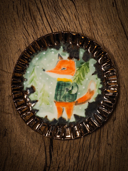 You are looking at original handmade ceramic Christmas Holiday cake dessert plate by Idania Salcido, the artist behind Danita Art. Hand made with glazed stoneware at Idania's ceramic studio, the ornament measures approx. 5 1/2 inches diameter, painted and illustrated by the artist and with a beautiful shimmering gold scalloped rim.