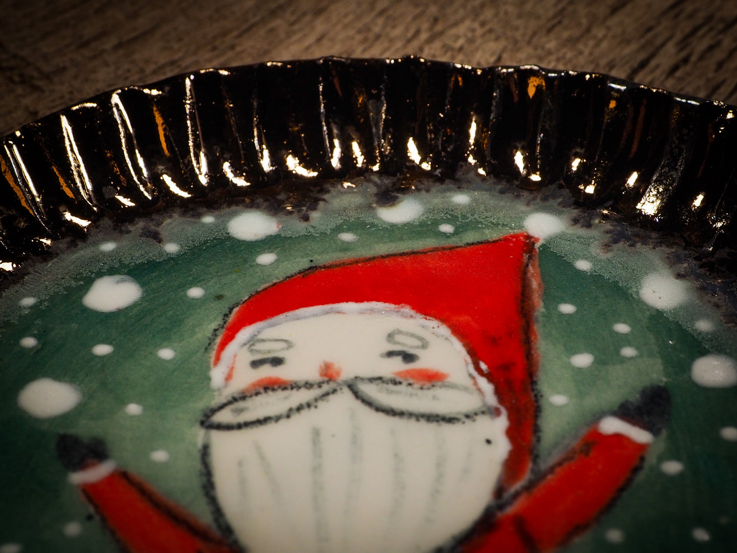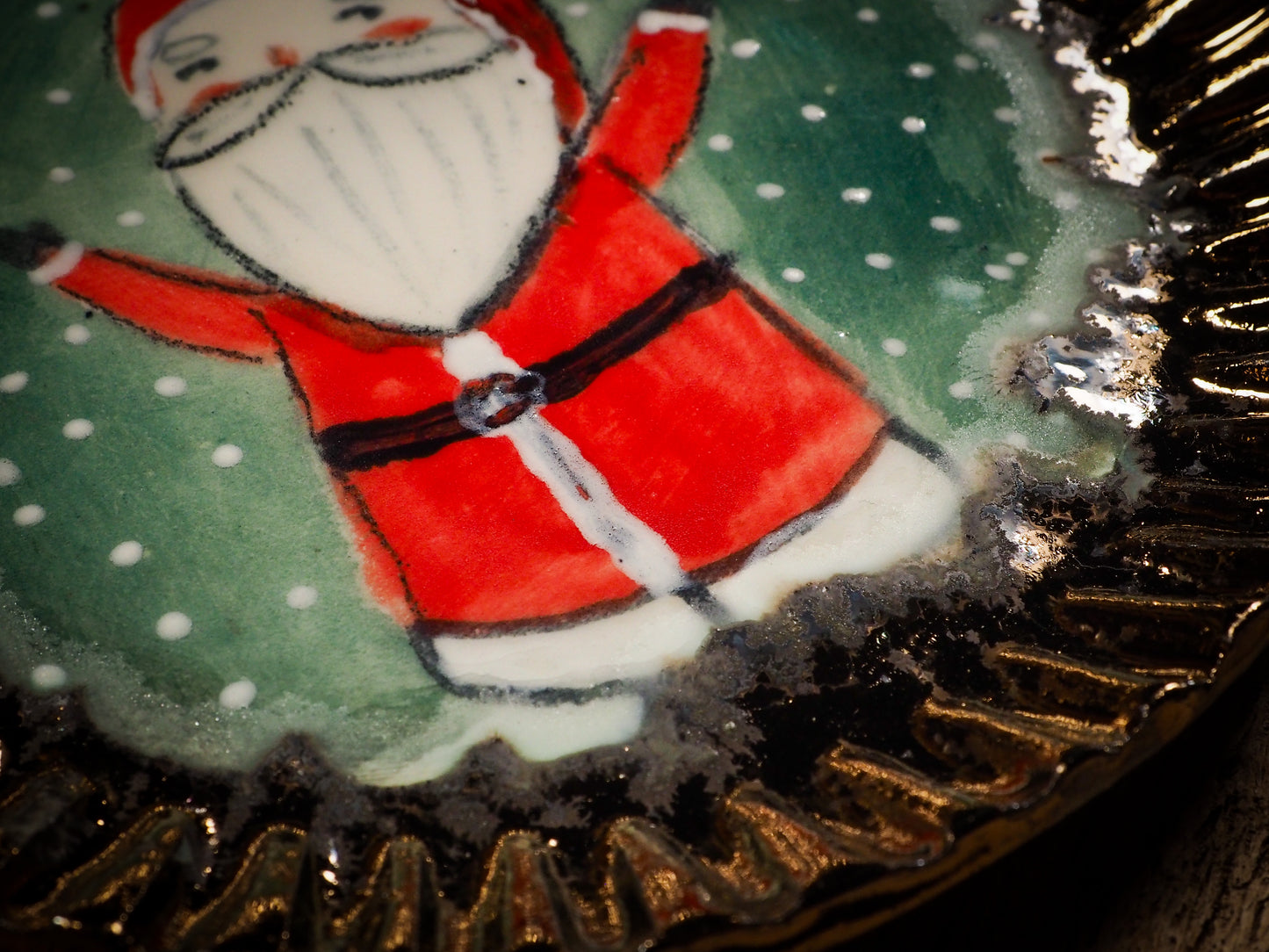 You are looking at original handmade ceramic Christmas Holiday cake dessert plate by Idania Salcido, the artist behind Danita Art. Hand made with glazed stoneware at Idania's ceramic studio, the ornament measures approx. 5 1/2 inches diameter, painted and illustrated by the artist and with a beautiful shimmering gold scalloped rim.