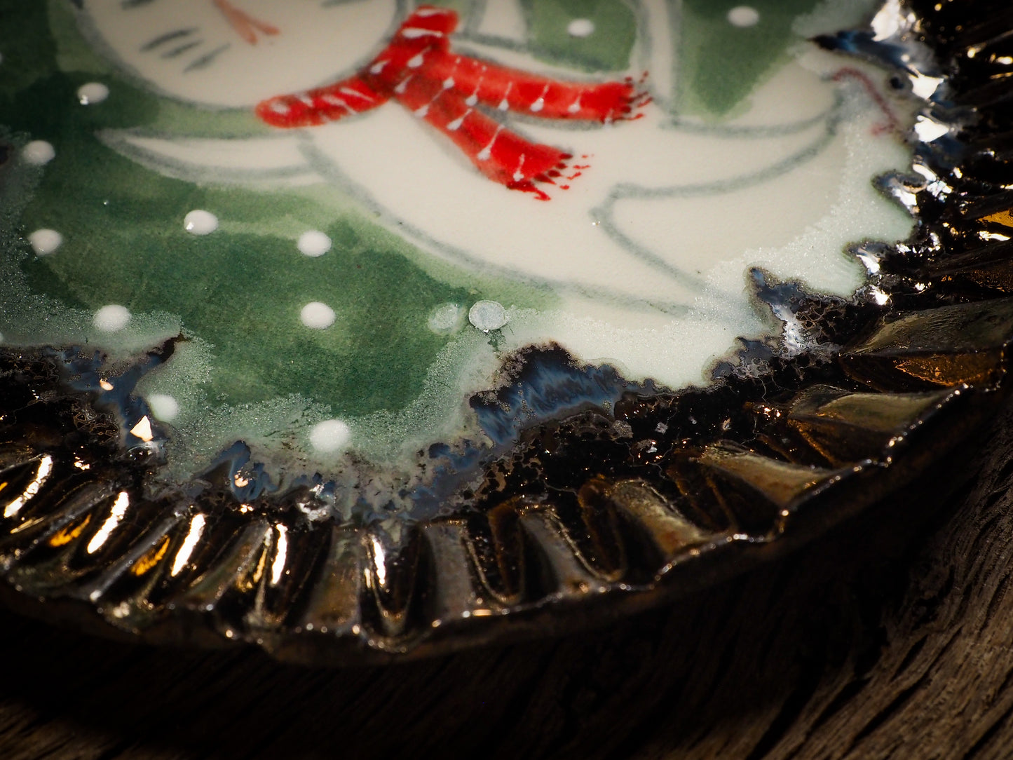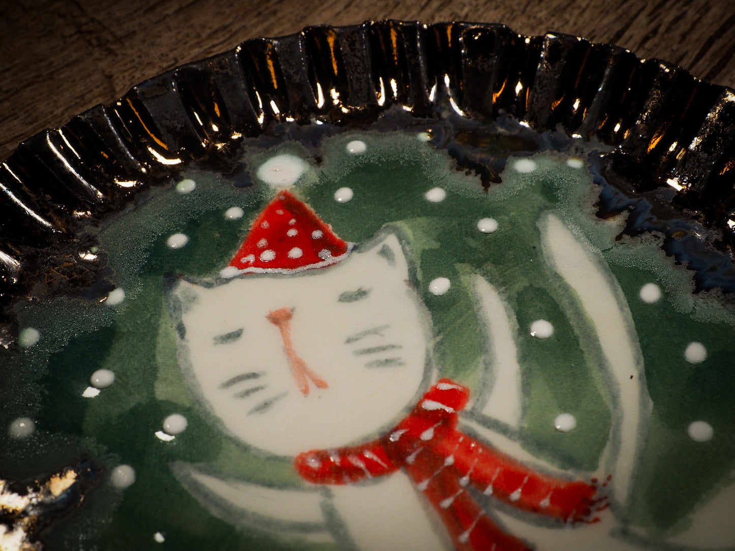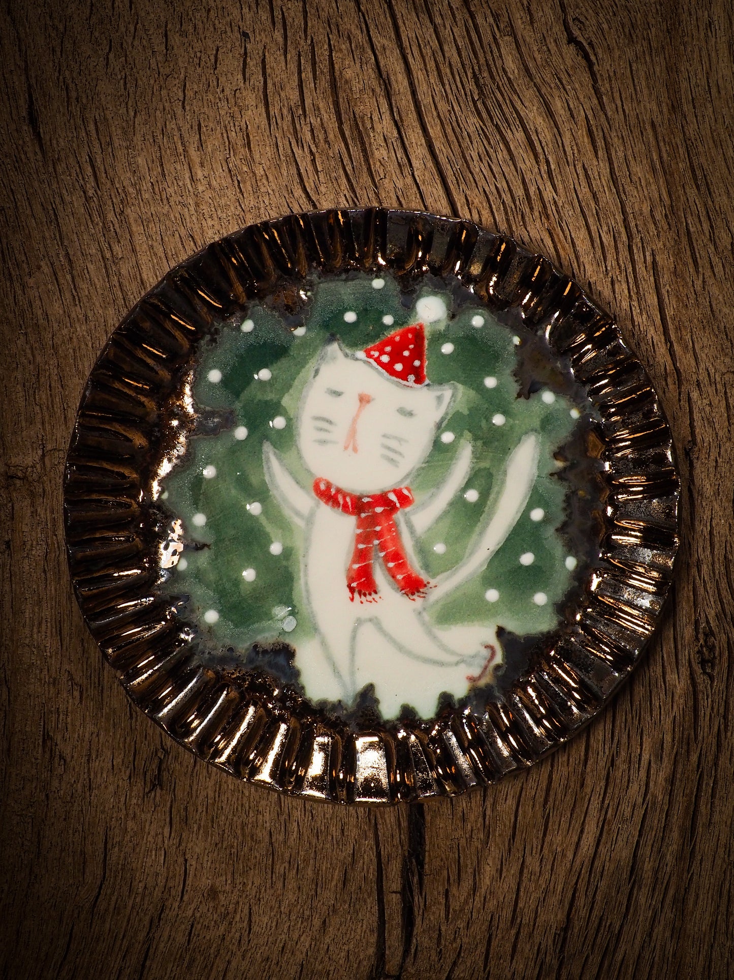 You are looking at original handmade ceramic Christmas Holiday cake dessert plate by Idania Salcido, the artist behind Danita Art. Hand made with glazed stoneware at Idania's ceramic studio, the ornament measures approx. 5 1/2 inches diameter, painted and illustrated by the artist and with a beautiful shimmering gold scalloped rim.