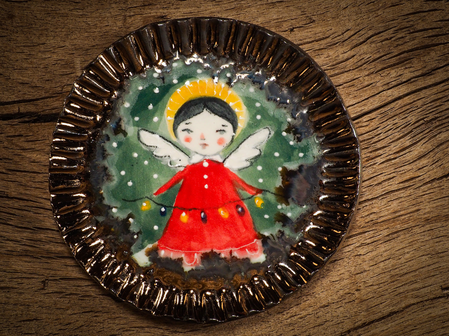 You are looking at original handmade ceramic Christmas Holiday cake dessert plate by Idania Salcido, the artist behind Danita Art. Hand made with glazed stoneware at Idania's ceramic studio, the ornament measures approx. 5 1/2 inches diameter, painted and illustrated by the artist and with a beautiful shimmering gold scalloped rim.