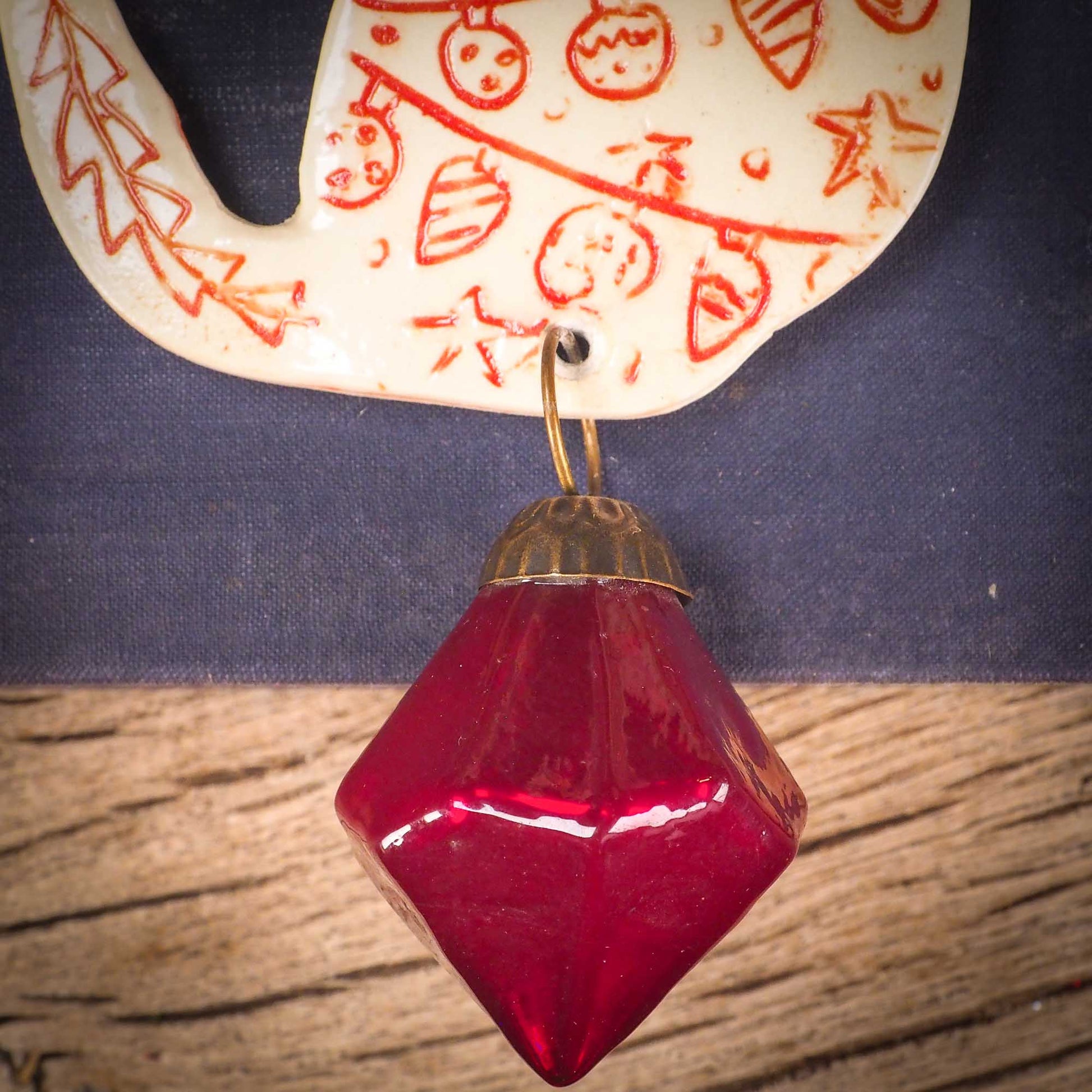 A handmade glass ornament hangs at one end of this beautiful, one of a kind ornament to make it even more special, just like the memories it will help you treasure when you hang on your Christmas tree, year after year.