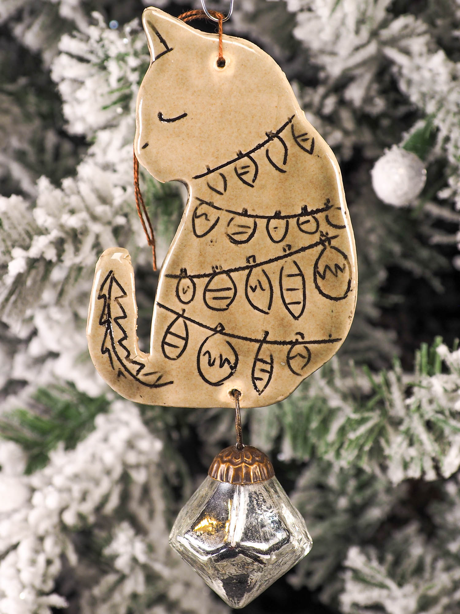 You are looking at original handmade ceramic Christmas and Holiday tree ornament by Idania Salcido, the artist behind Danita Art.Hand made with glazed stoneware at Idania's ceramic studio, the cat ornament measures approx. 6 inches tall and it is hand painted by the artist.