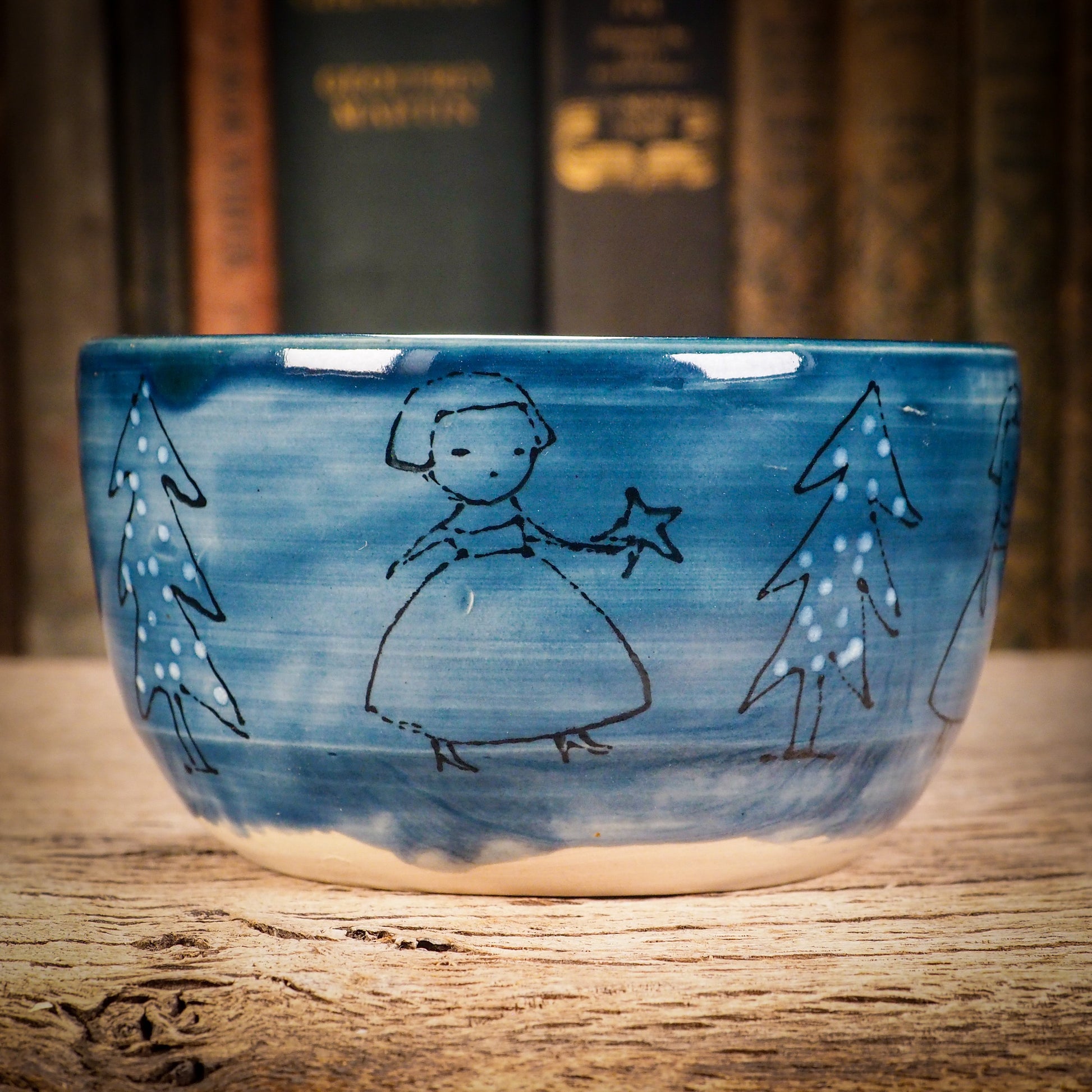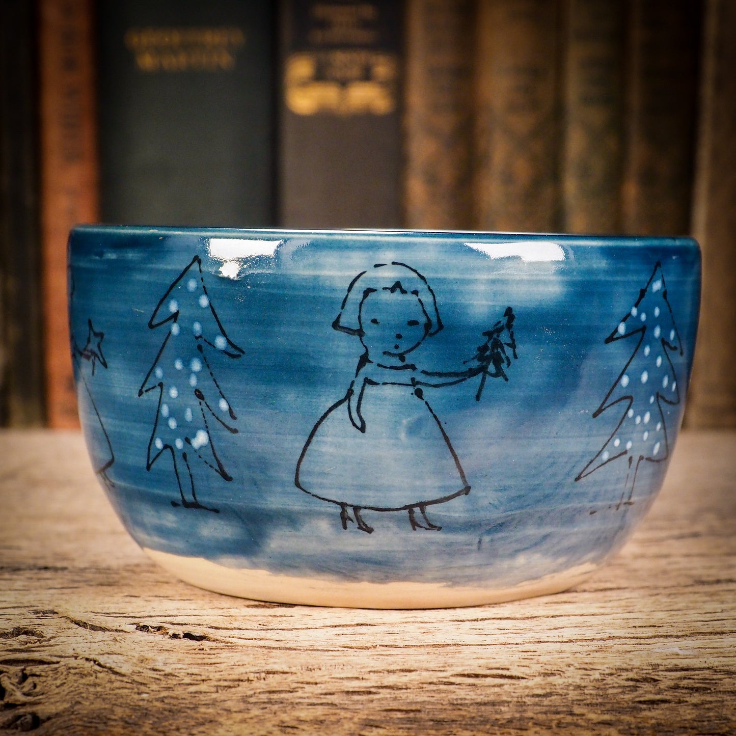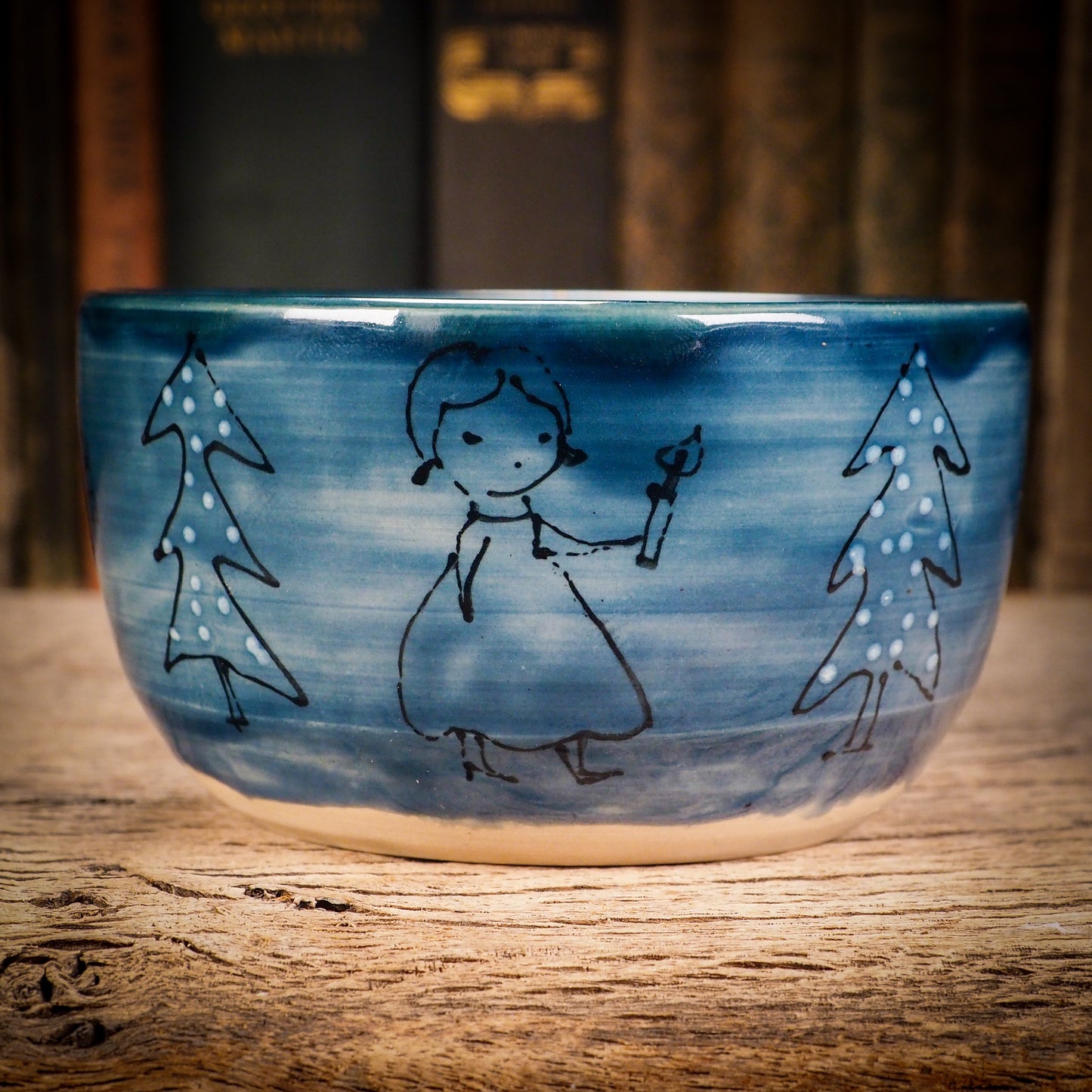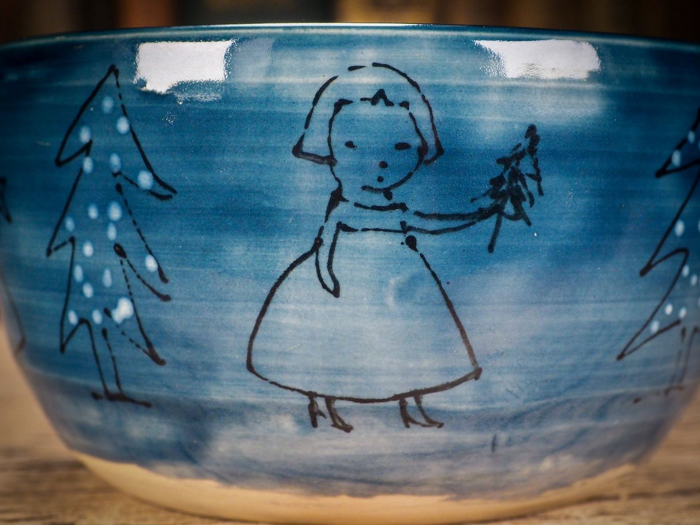 Handmade and fired in Idania’s studio, this glazed ceramic bowl measures 4.5 inches in diameter and it’s hand decorated by the artist with a wonderful winter illustration of three girls walking in the winter forest, just before Christmas.