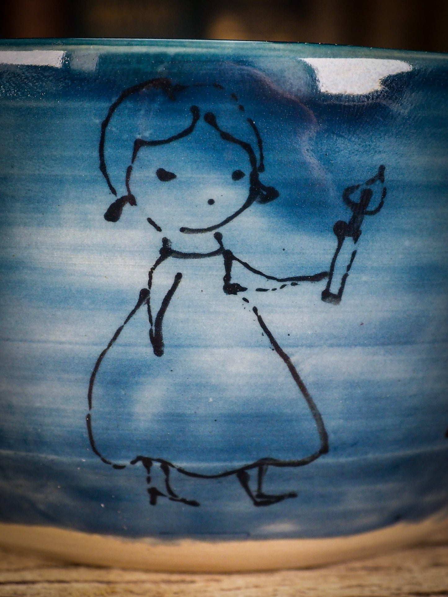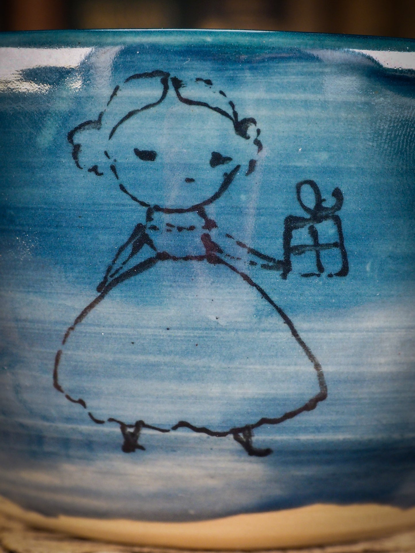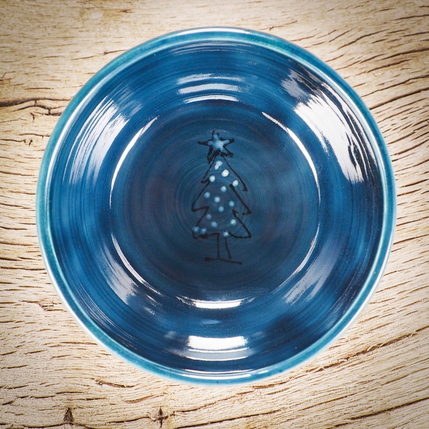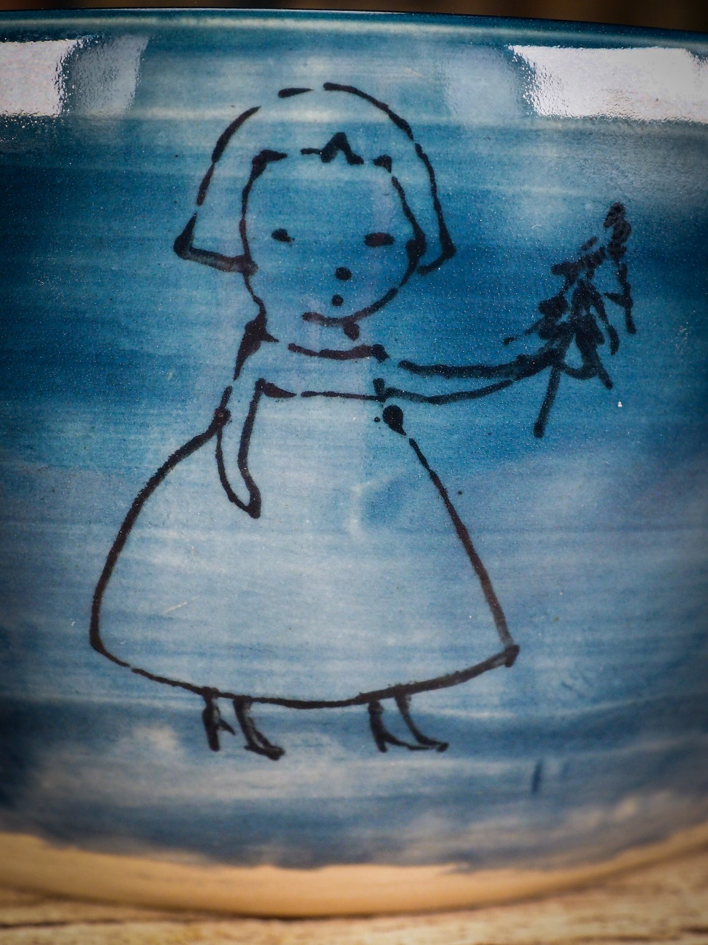 Handmade and fired in Idania’s studio, this glazed ceramic bowl measures 4.5 inches in diameter and it’s hand decorated by the artist with a wonderful winter illustration of three girls walking in the winter forest, just before Christmas.