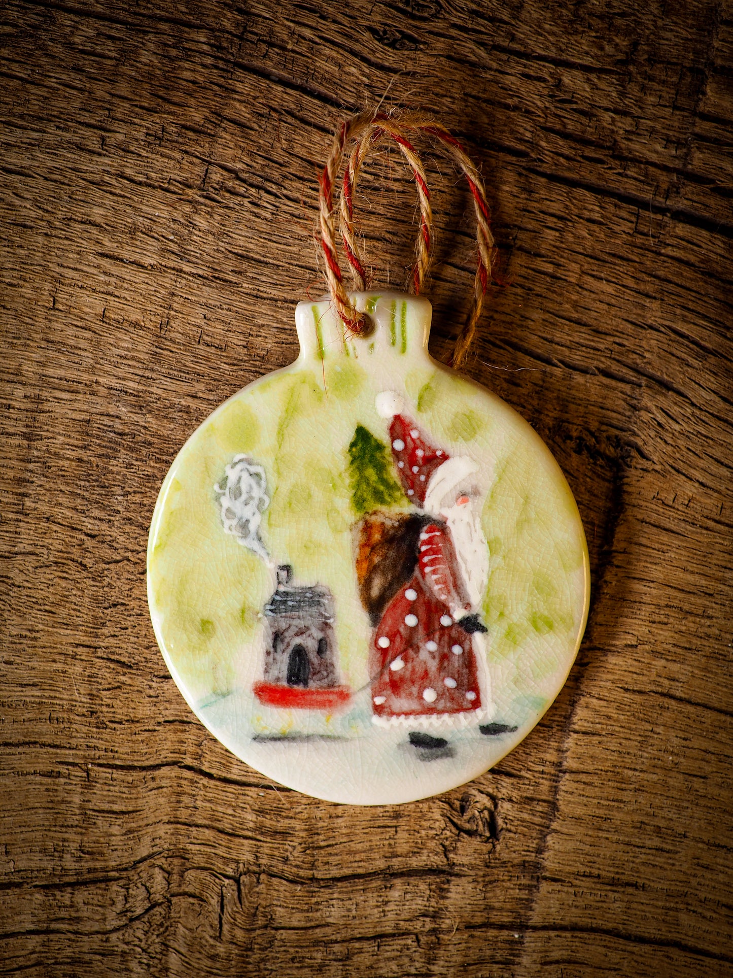 Totally hand made on my studio, each of my ornaments is hand painted, fired twice on a kiln at more than 2000 Degrees, then finished with a beautiful twine hanger.