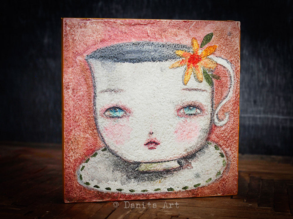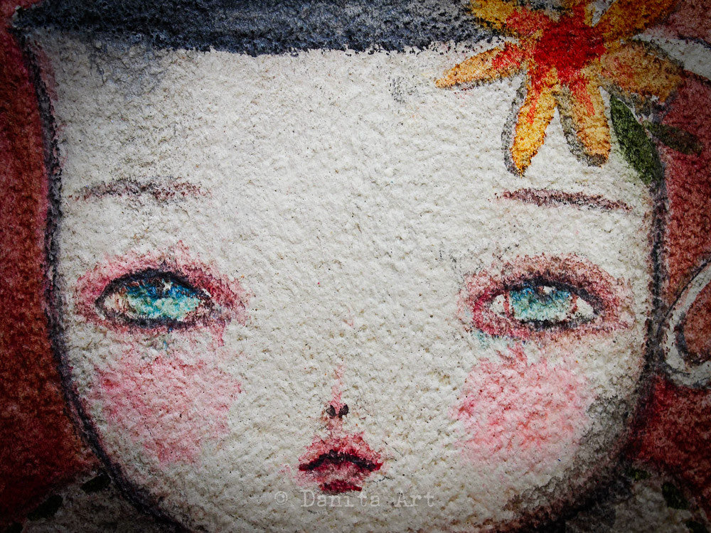 This time I mixed watercolors on wood with a very rough surface and created a series of mini girl portrait paintings.