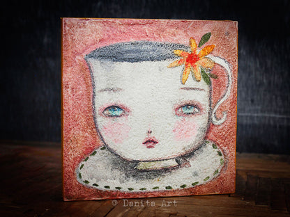 This surreal watercolour portrait measures 5x5 inches on a wood block, and features a female portrait with beautiful and detailed eyes.
