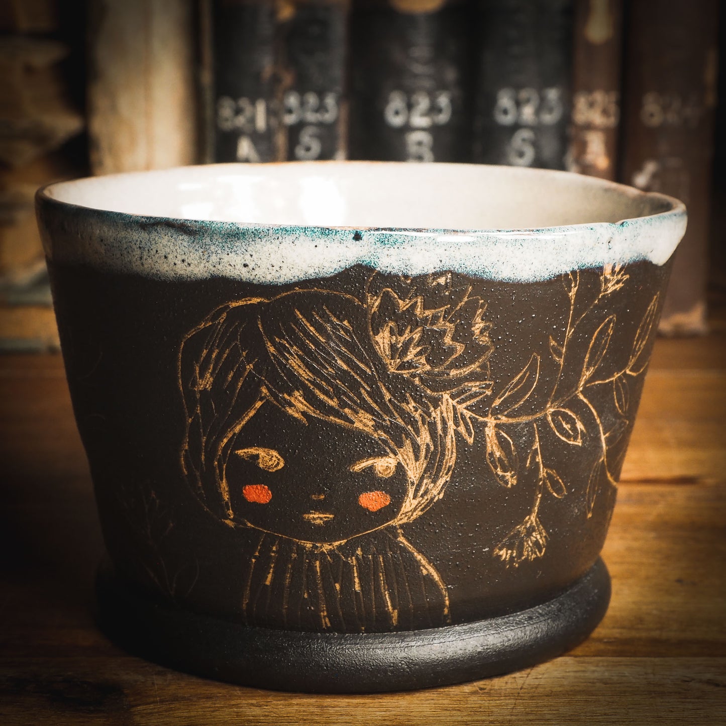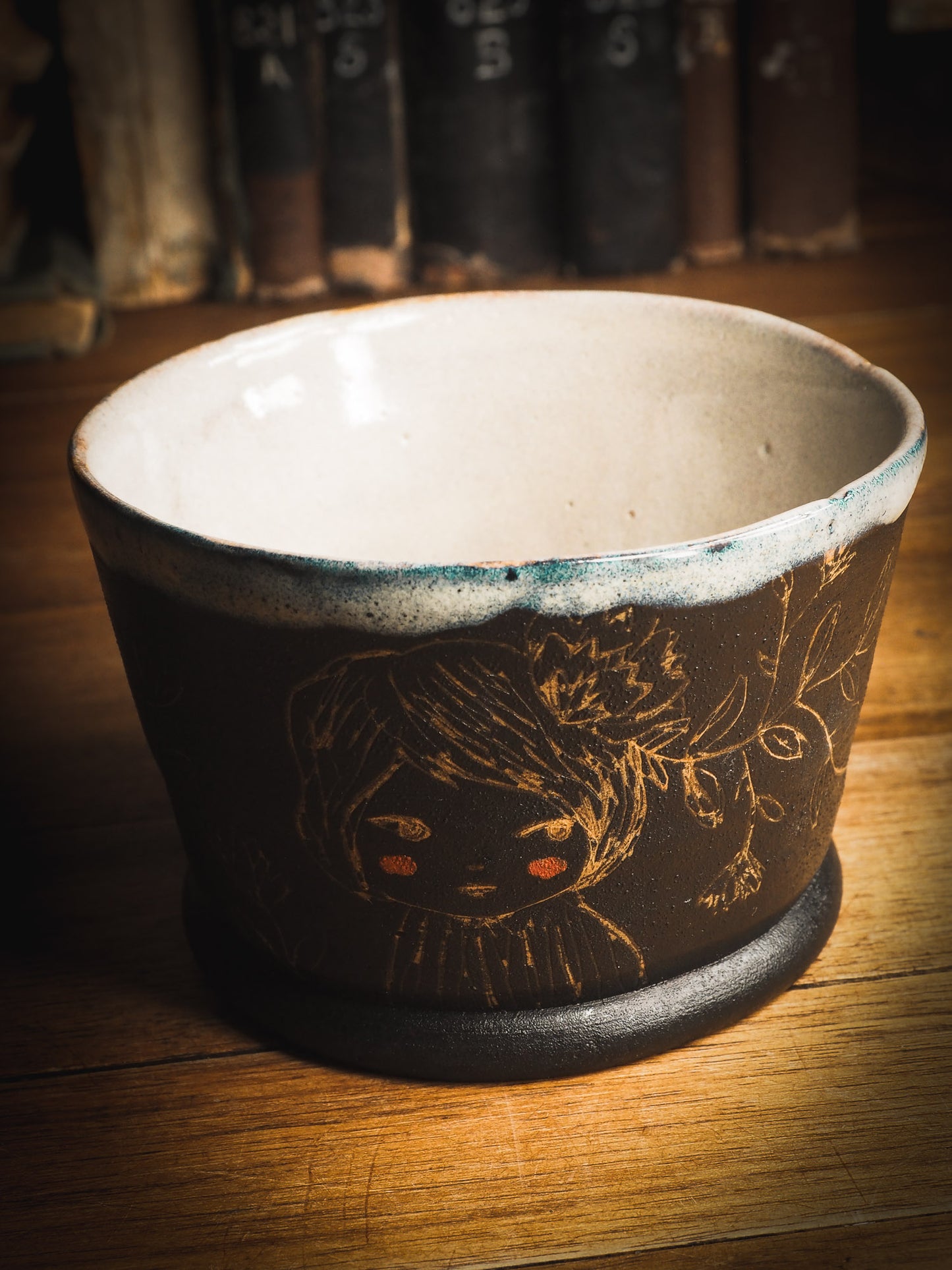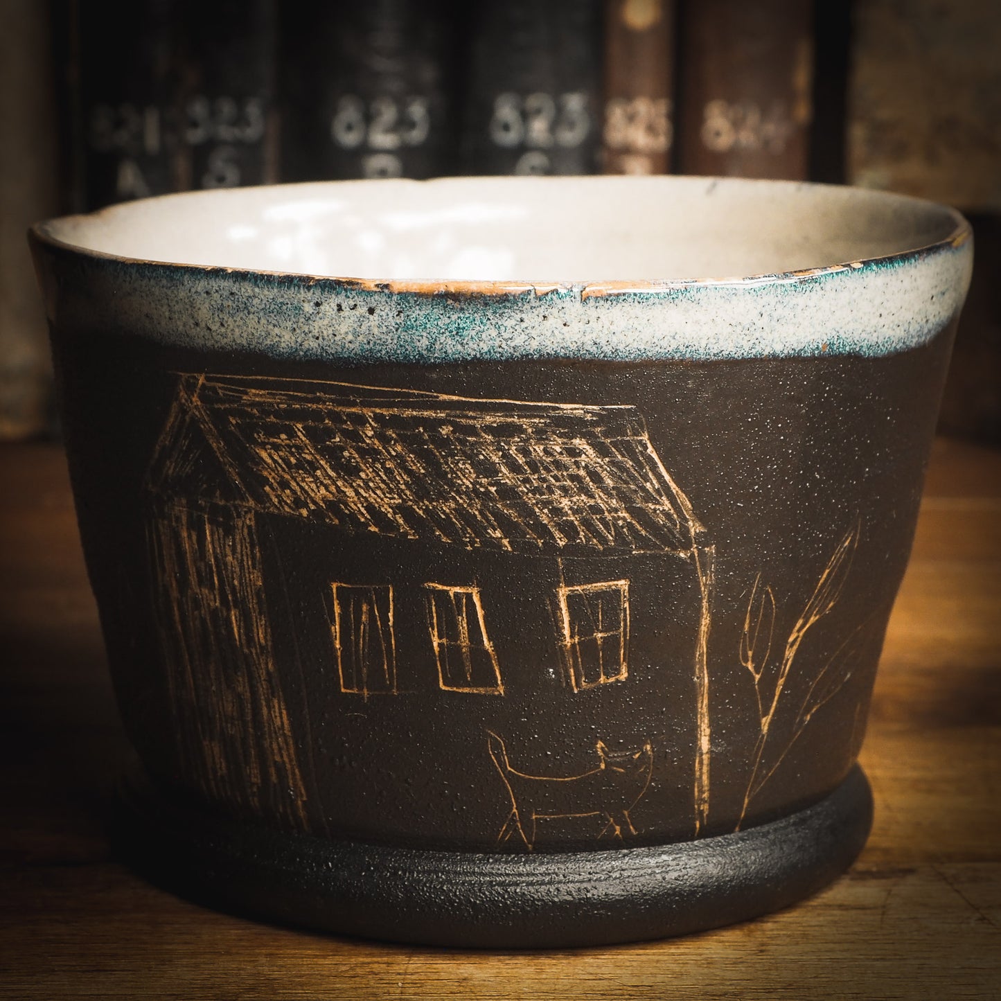 I LOVE This piece, with it's golden drawings of the girl, the cat and the flowers and it's deep black chocolate brown color contrasting with the icy white glaze on top.