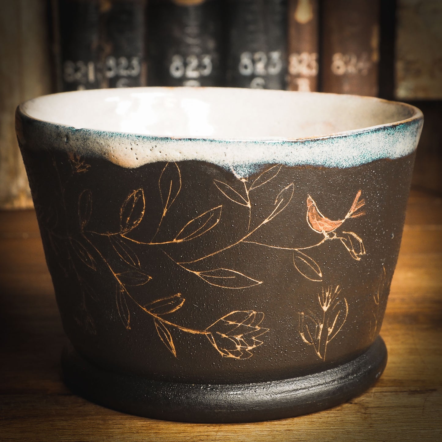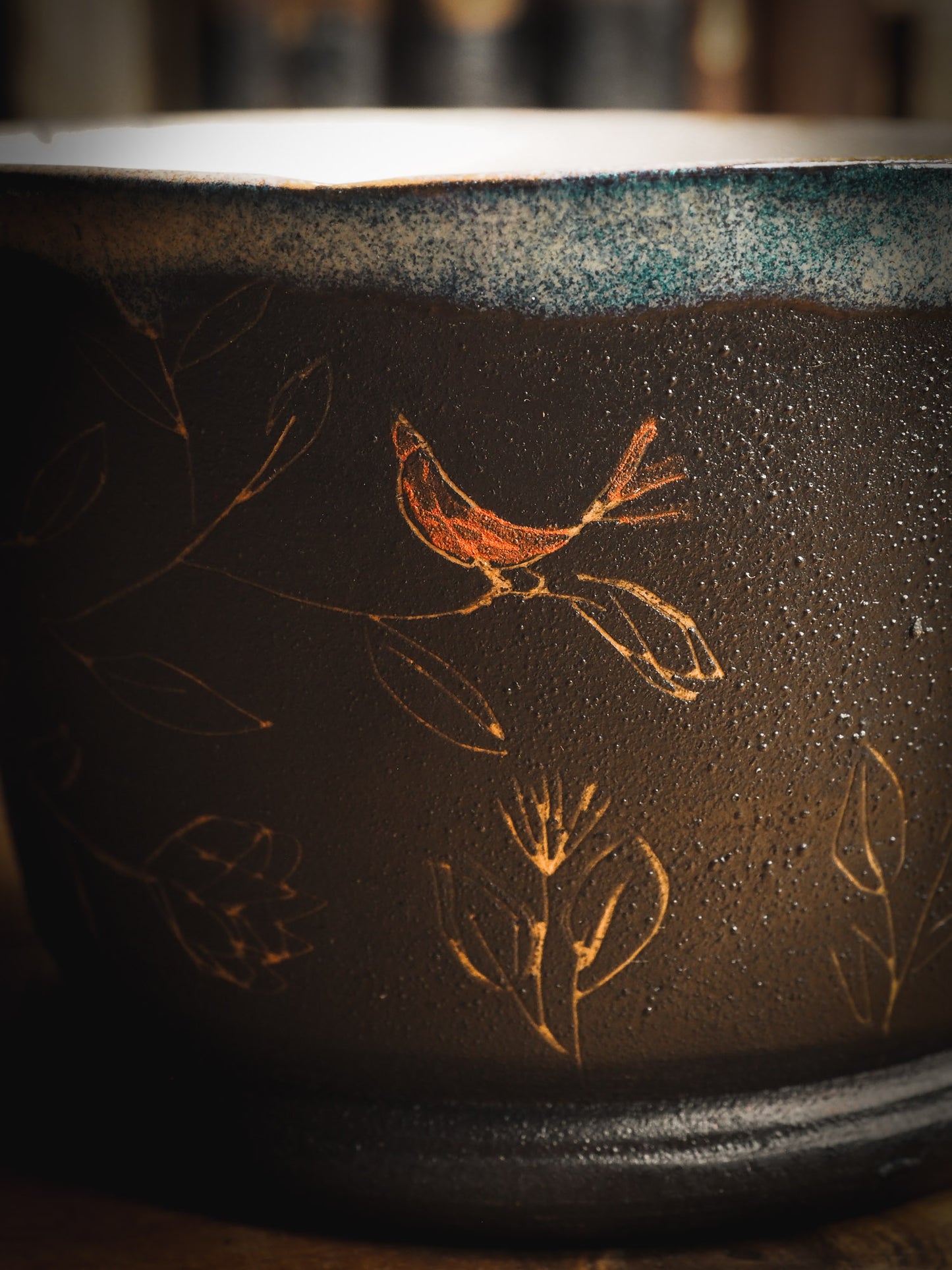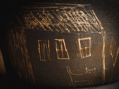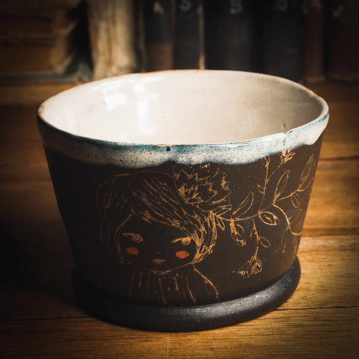 I LOVE This piece, with it's golden drawings of the girl, the cat and the flowers and it's deep black chocolate brown color contrasting with the icy white glaze on top.