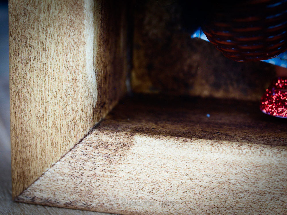Dorothy the bunny is mounted on a wood box that measures 6x8 inches, aged using mixed media techniques and an alchemy of materials that I used on everything you see here, from her aged and distressed spun cotton face, and a spun cotton Dog that is inside her basket.