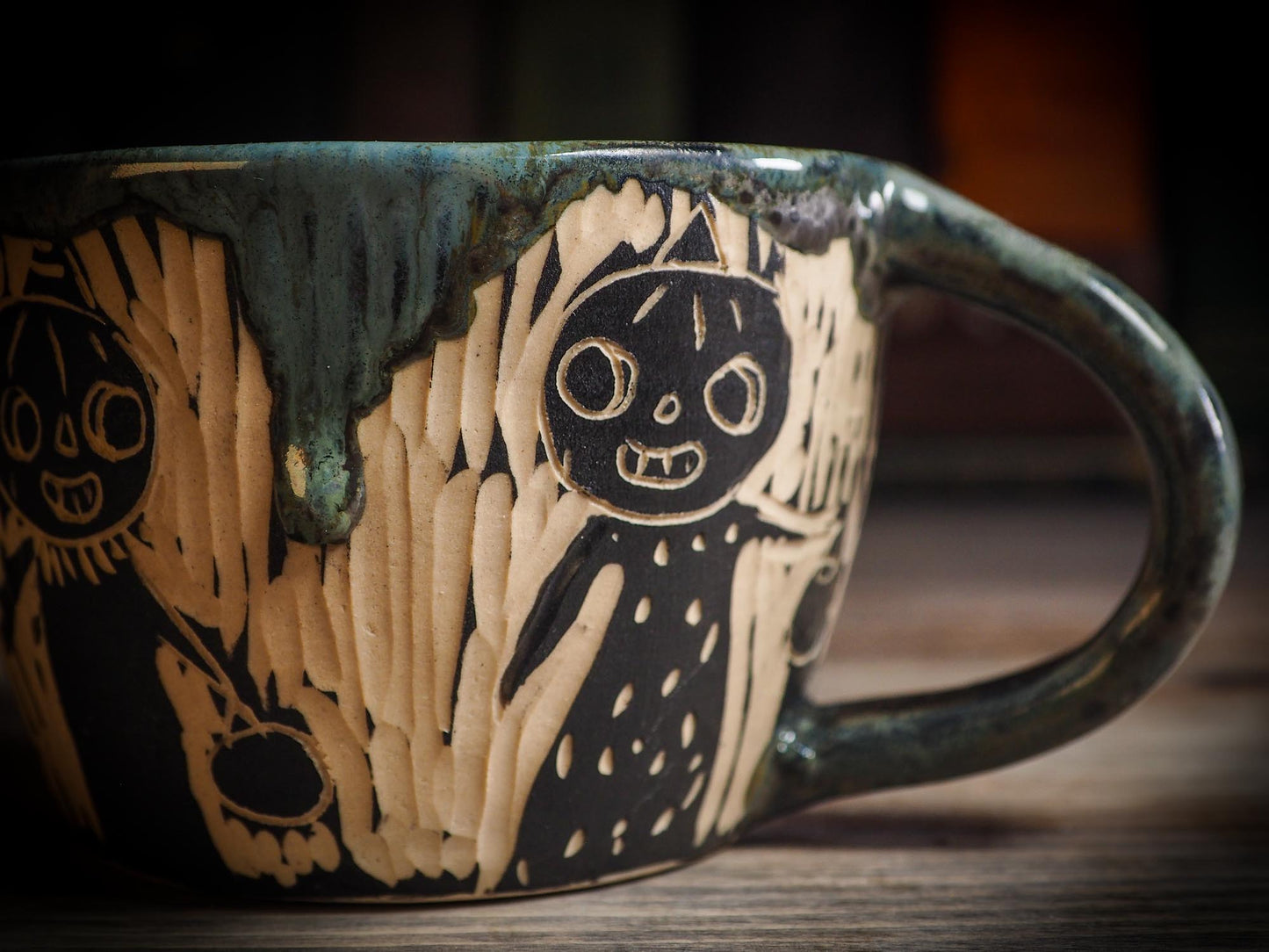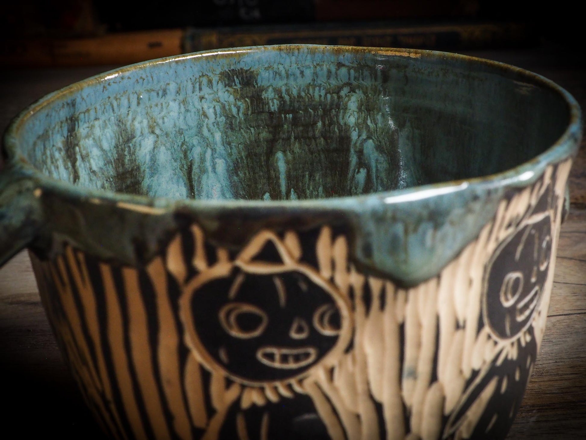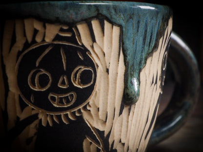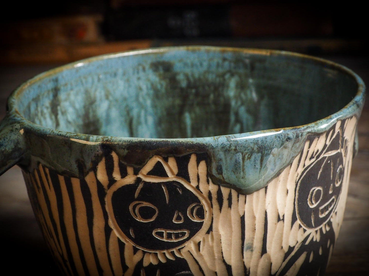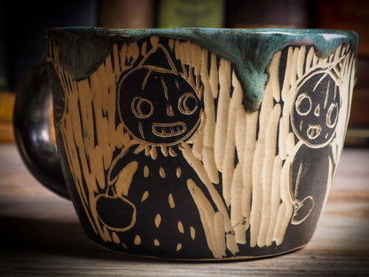 It measures 3 1/2 x 2 1/2 x 2 1/2 Inches, made with wheel thrown clay, hand carved and glazed by me with a dark, gooey glaze on the outside as well as the inside. The carved figures give it a nice, folk art primitive feel to it.
