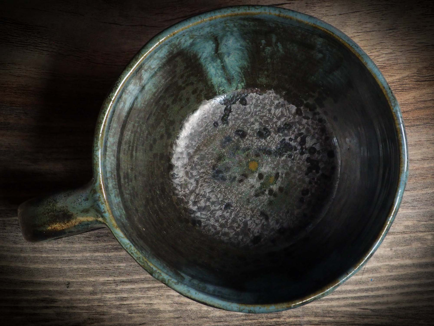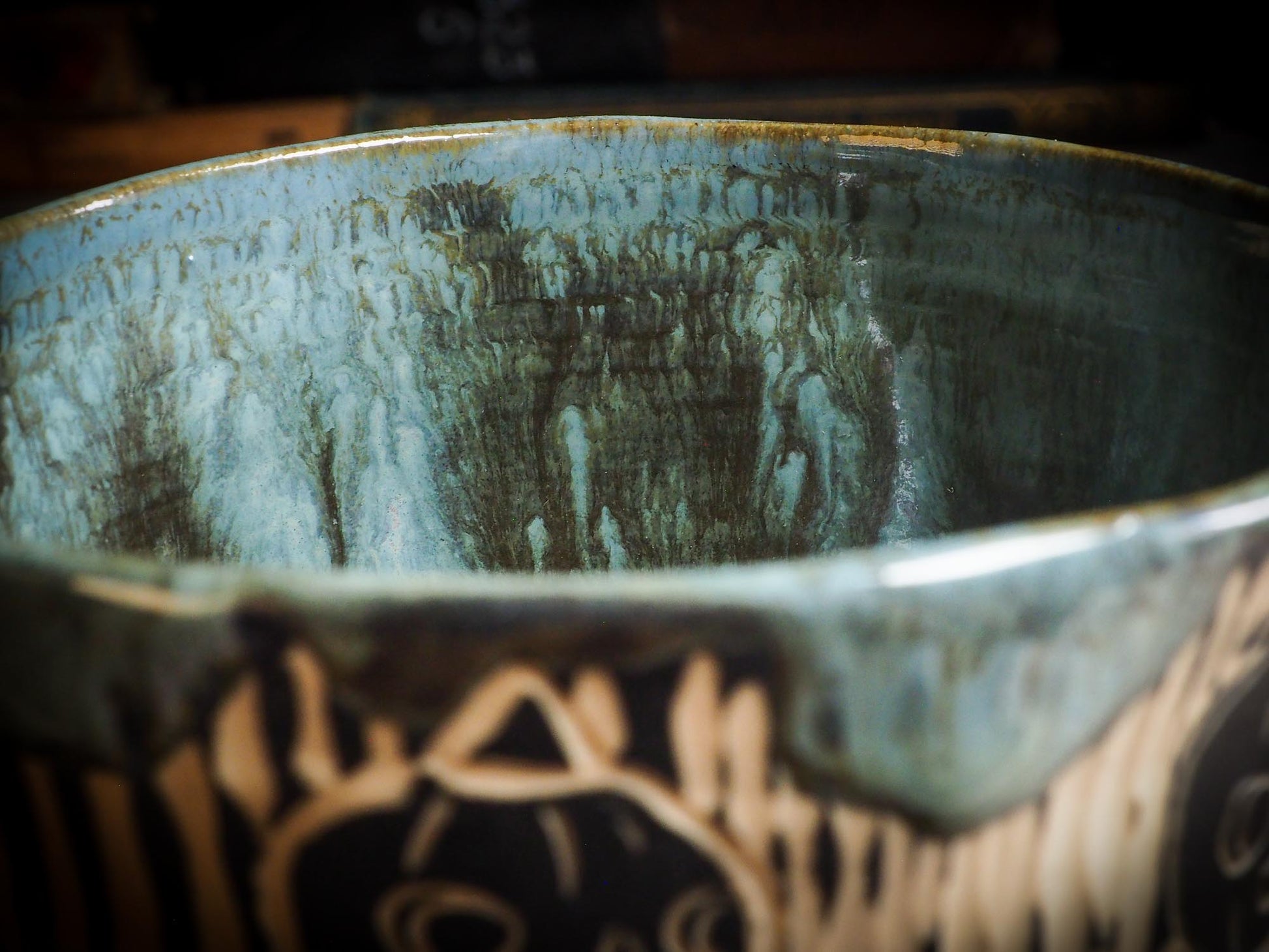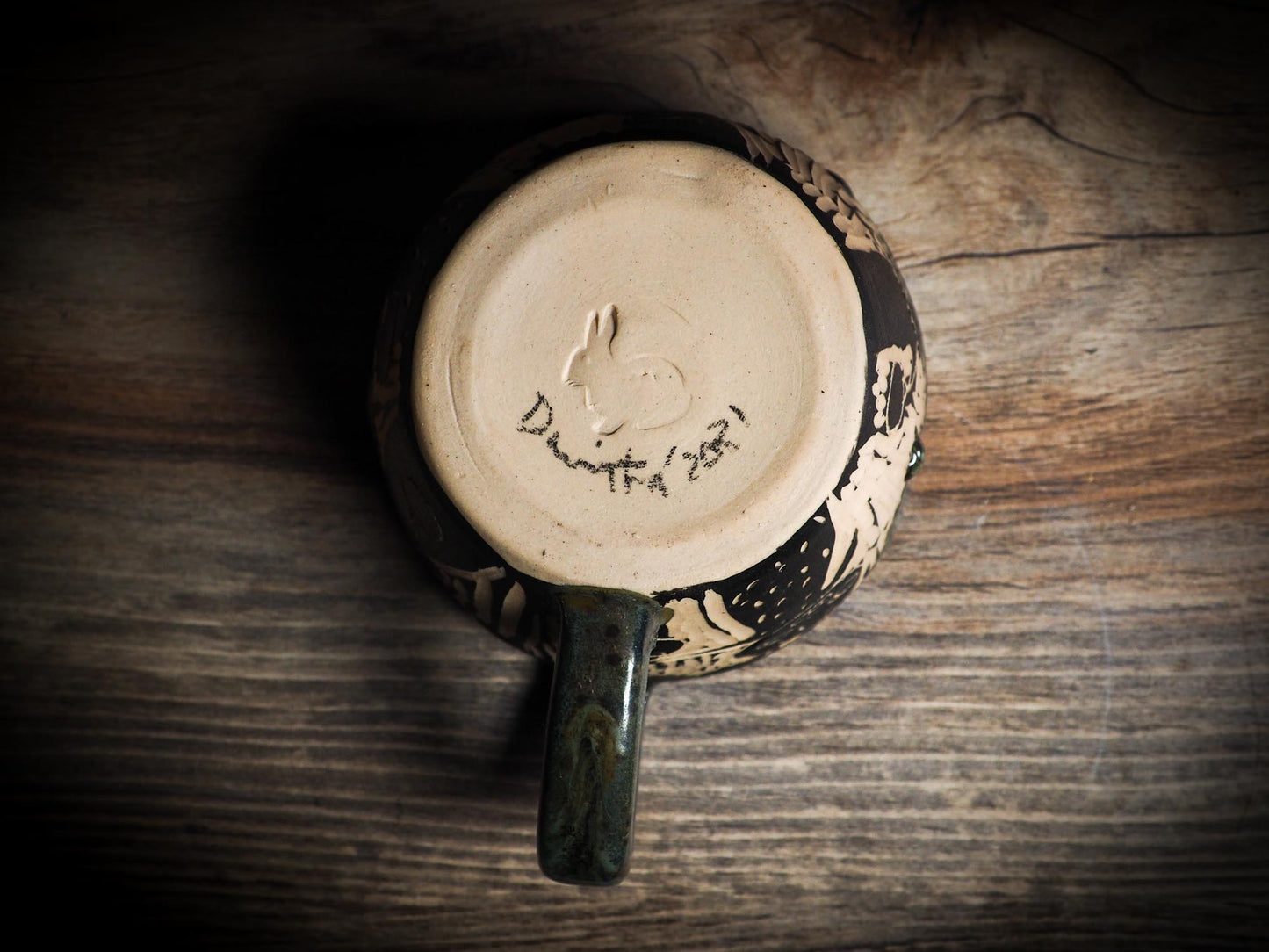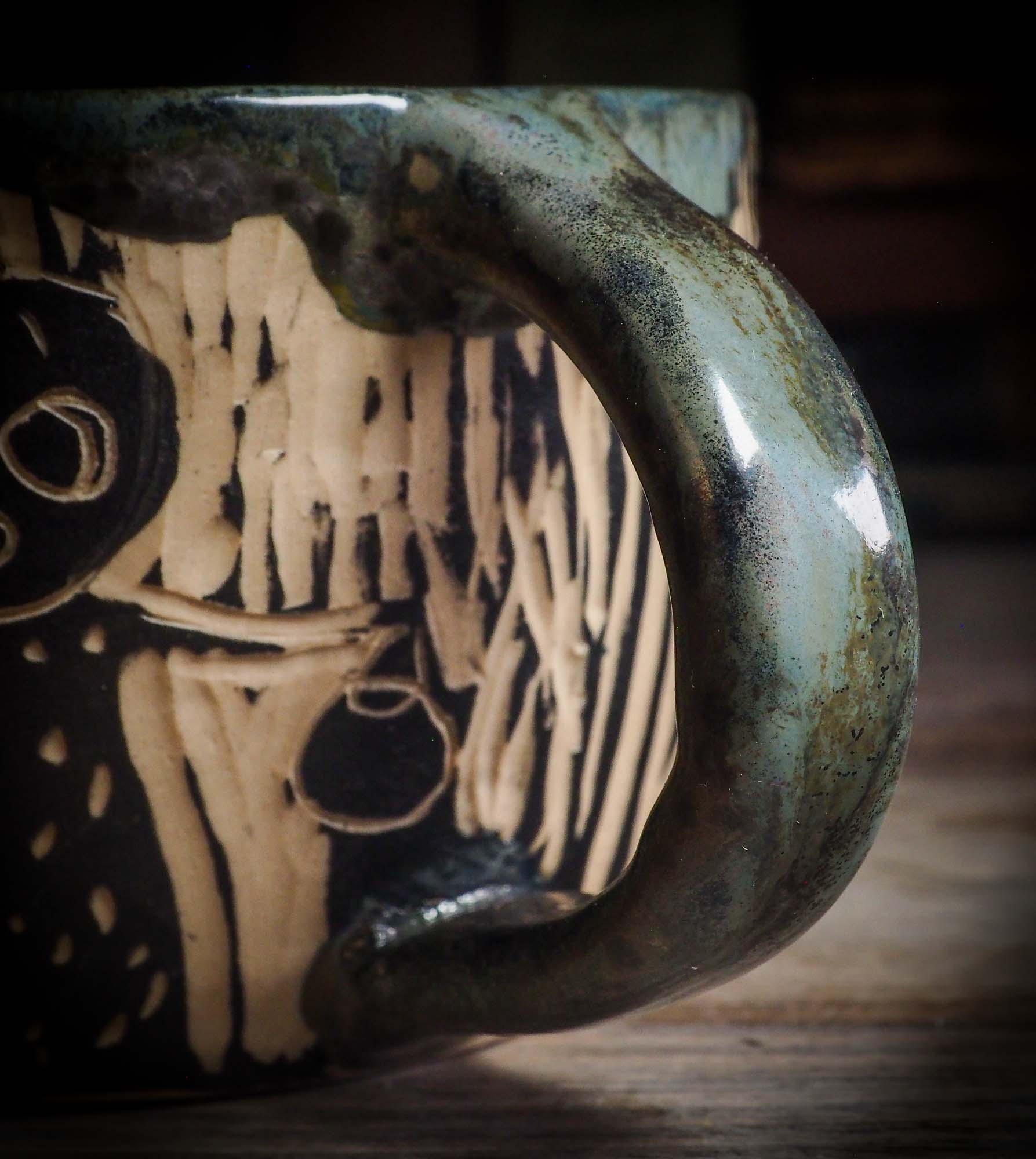 It measures 3 1/2 x 2 1/2 x 2 1/2 Inches, made with wheel thrown clay, hand carved and glazed by me with a dark, gooey glaze on the outside as well as the inside. The carved figures give it a nice, folk art primitive feel to it.