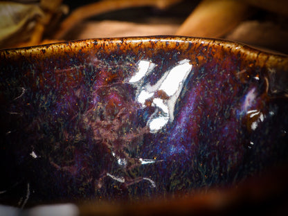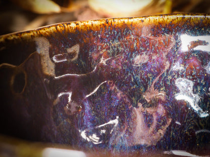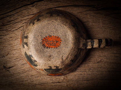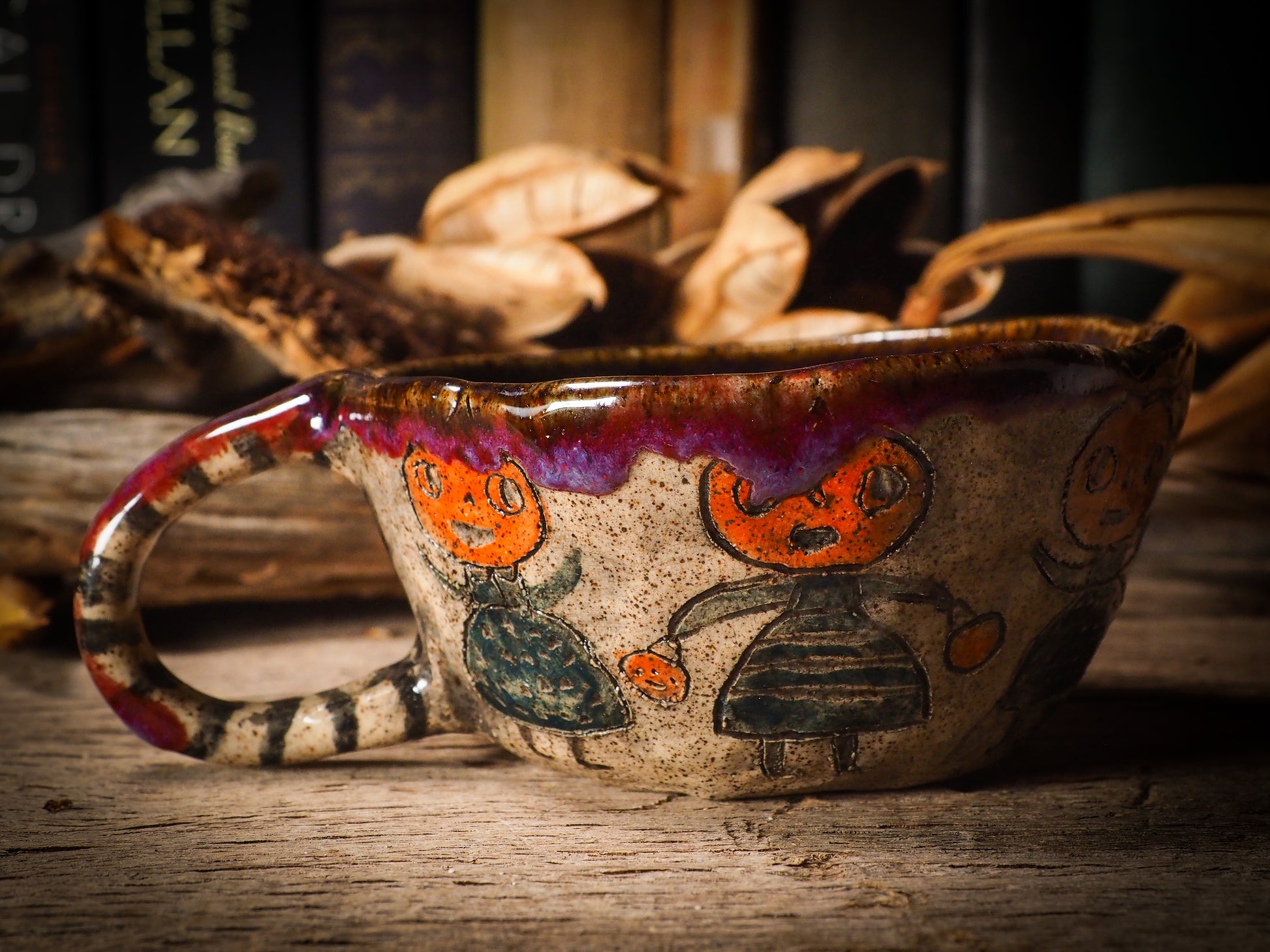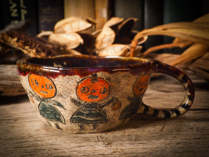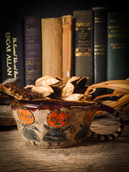 An original, fire glazed ceramic coffee mug by Idania Salcido, Danita Art. Inspired by Halloween, Danita created a beautiful ceramic container for your favorite pumpkin spice coffee, a warm cup of tea or maybe to keep your favorite sweets to enjoy with your favorite trick-or-treaters.