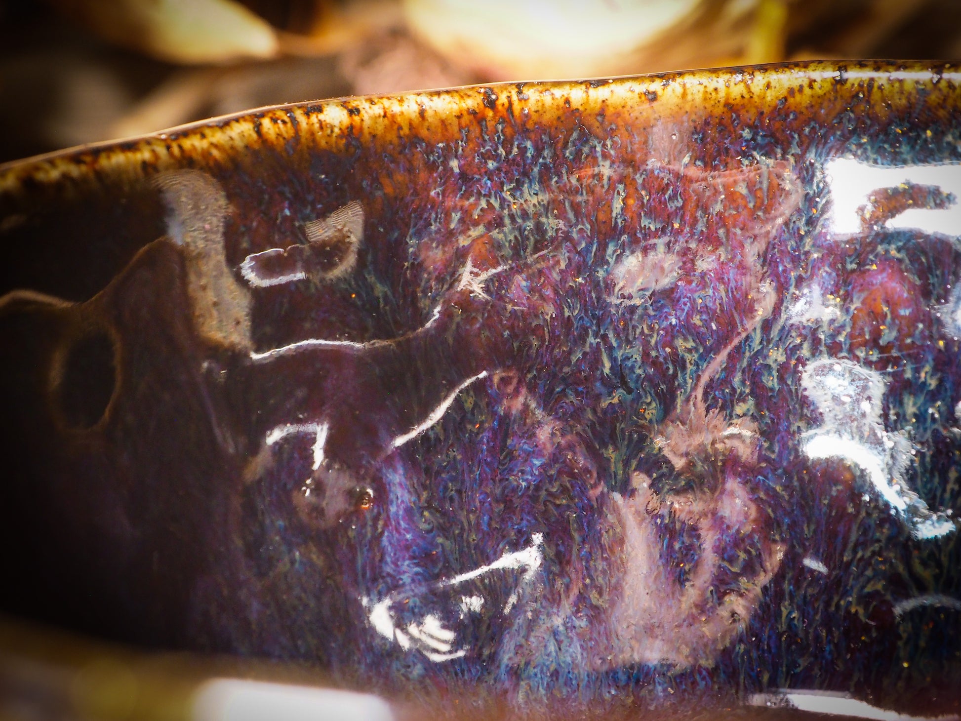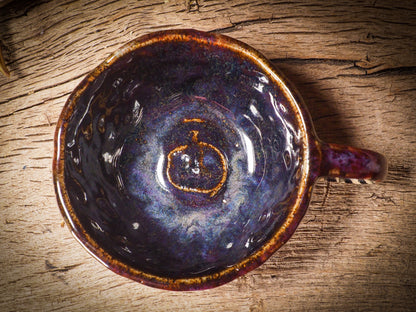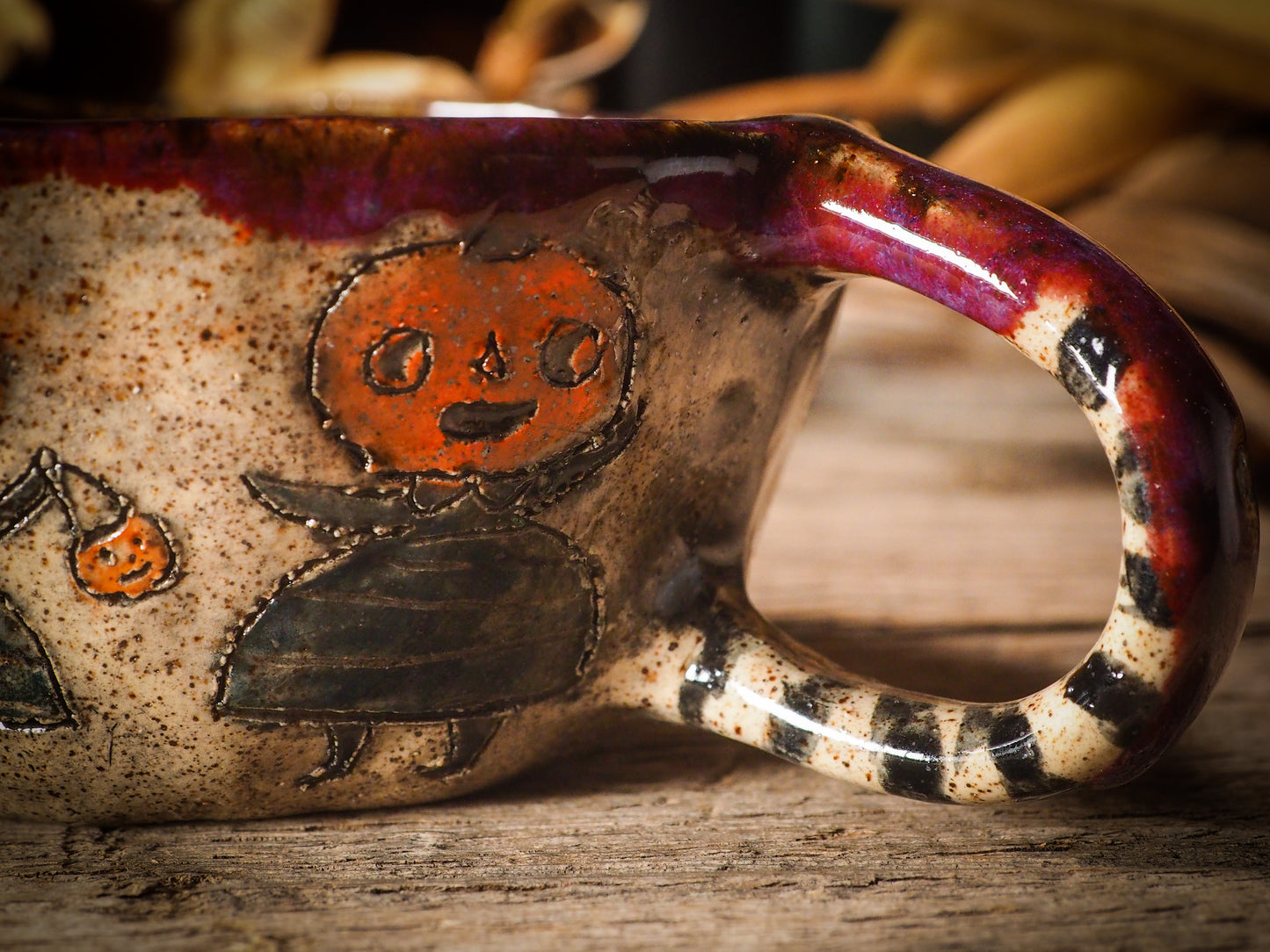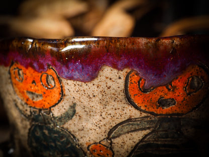 The mug is hand carved with Halloween motives like ghosts, skeletons, witches, ghouls, black cats and more come to life as hand carvings on the sides, with an inside covered in a beautiful food safe glaze with intricate swirls of colors to discover as you enjoy your favorite drink on it.