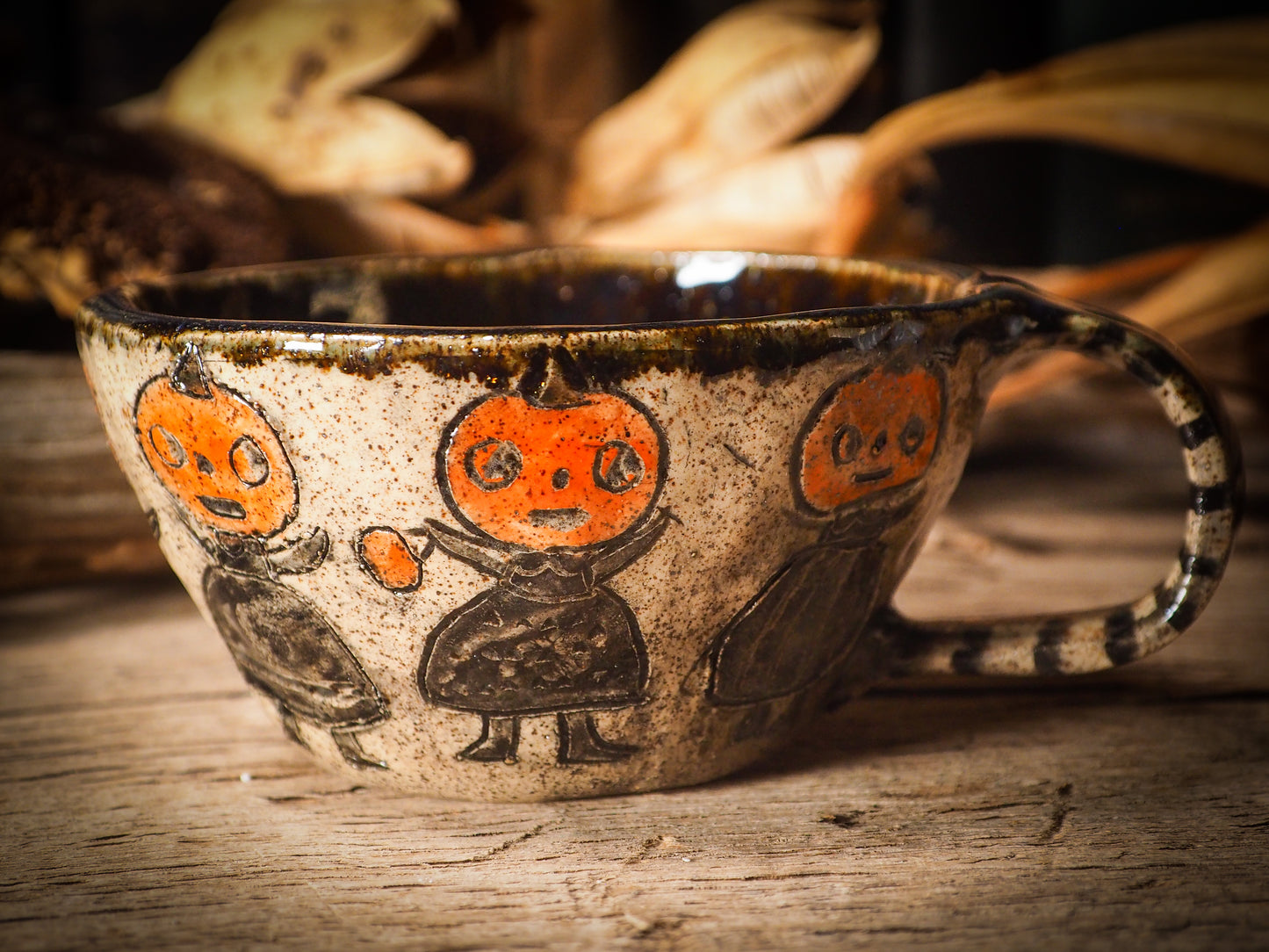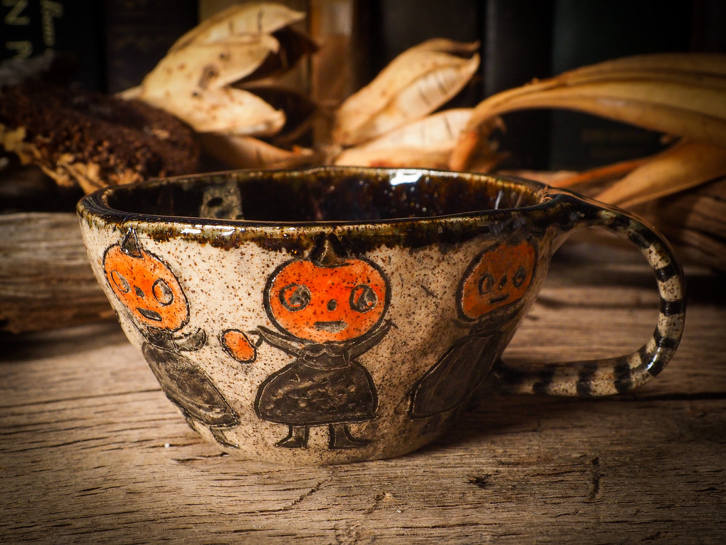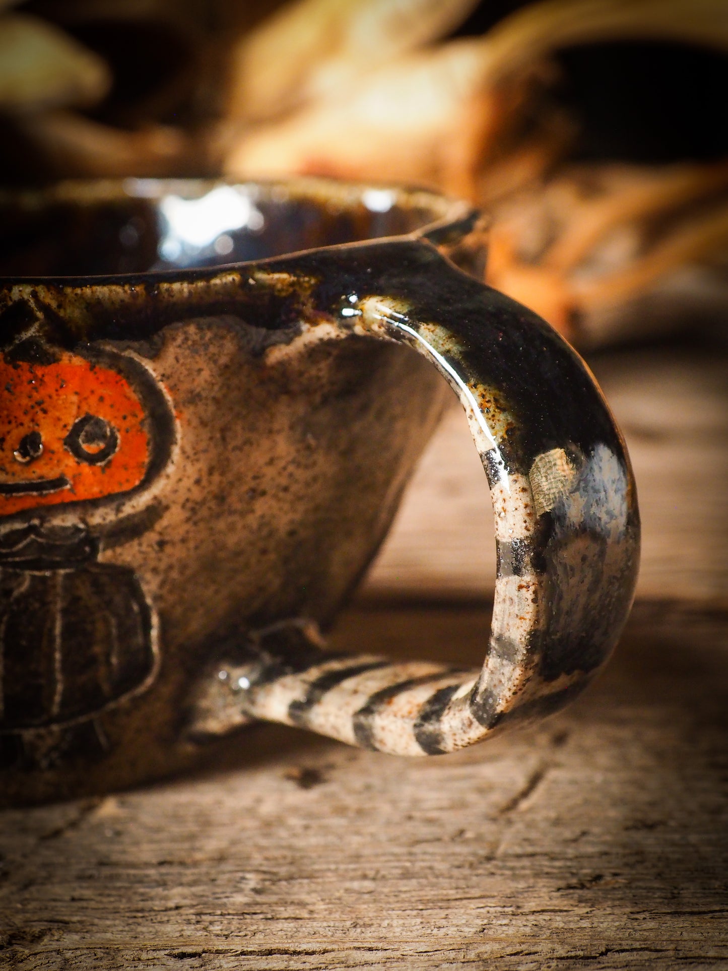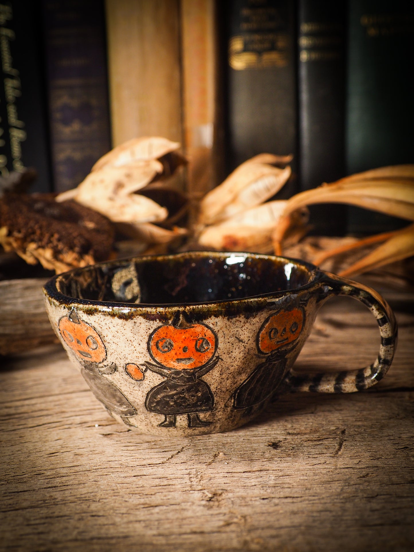 An original, fire glazed ceramic coffee mug by Idania Salcido, Danita Art. Inspired by Halloween, Danita created a beautiful ceramic container for your favorite pumpkin spice coffee, a warm cup of tea or maybe to keep your favorite sweets to enjoy with your favorite trick-or-treaters.
