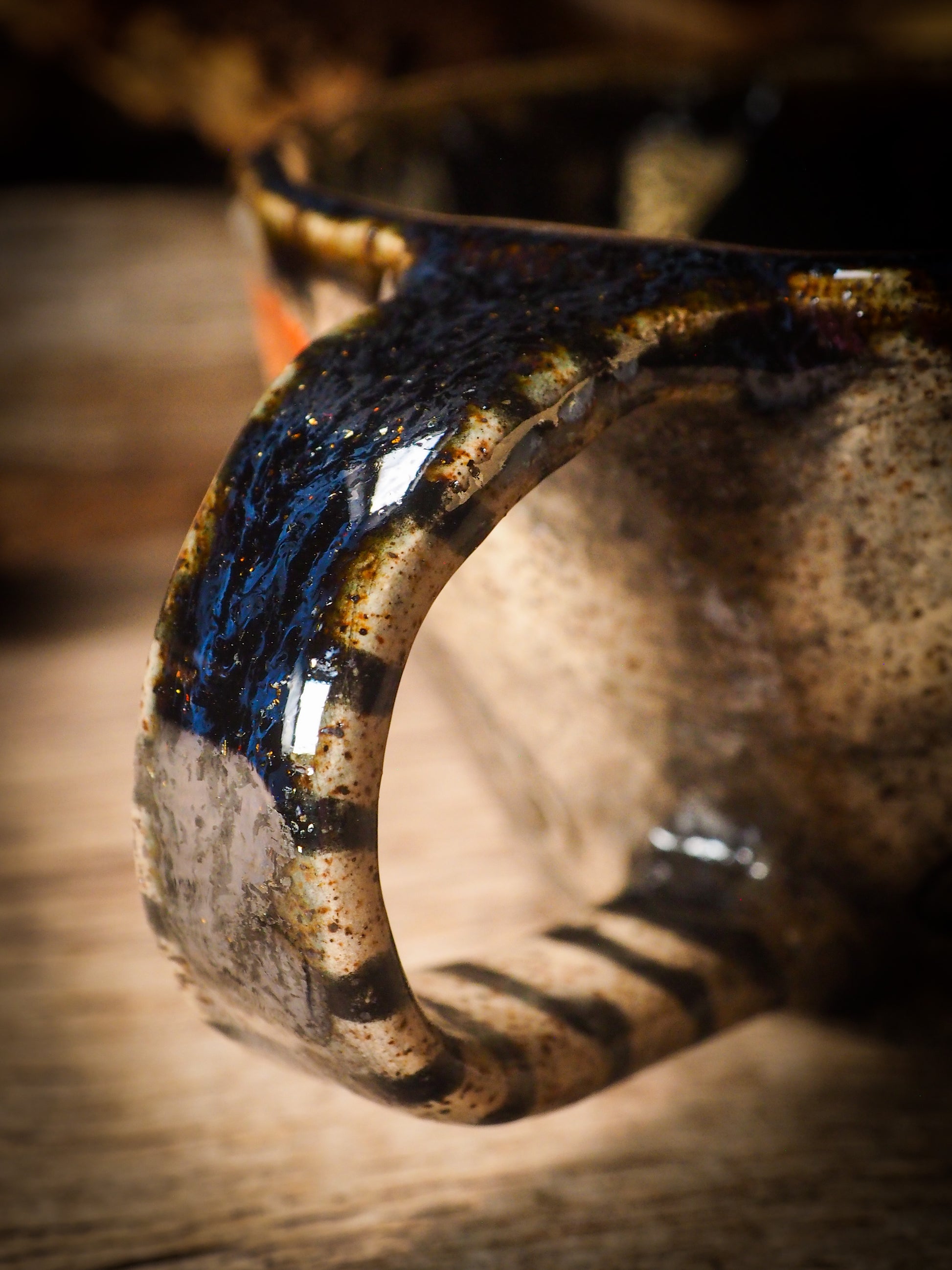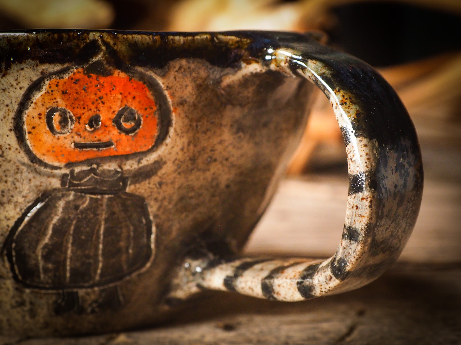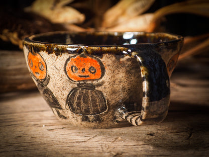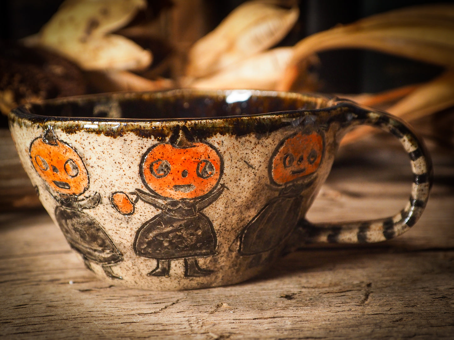 An original, fire glazed ceramic coffee mug by Idania Salcido, Danita Art. Inspired by Halloween, Danita created a beautiful ceramic container for your favorite pumpkin spice coffee, a warm cup of tea or maybe to keep your favorite sweets to enjoy with your favorite trick-or-treaters.