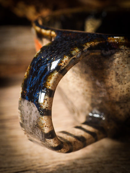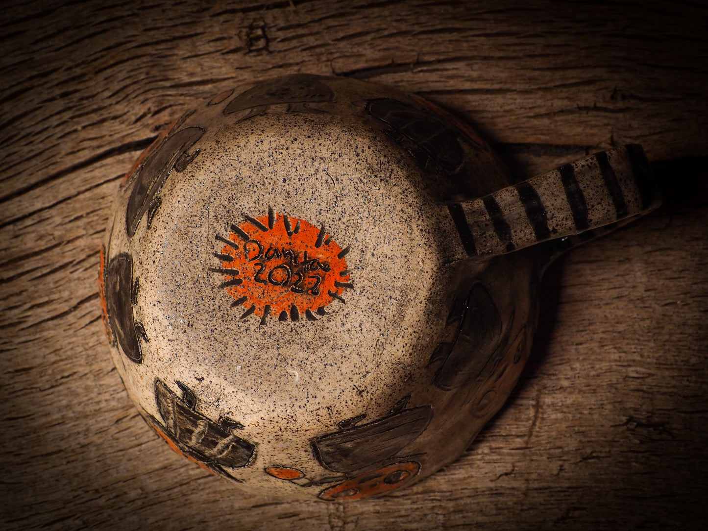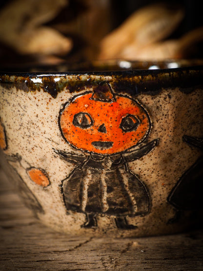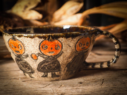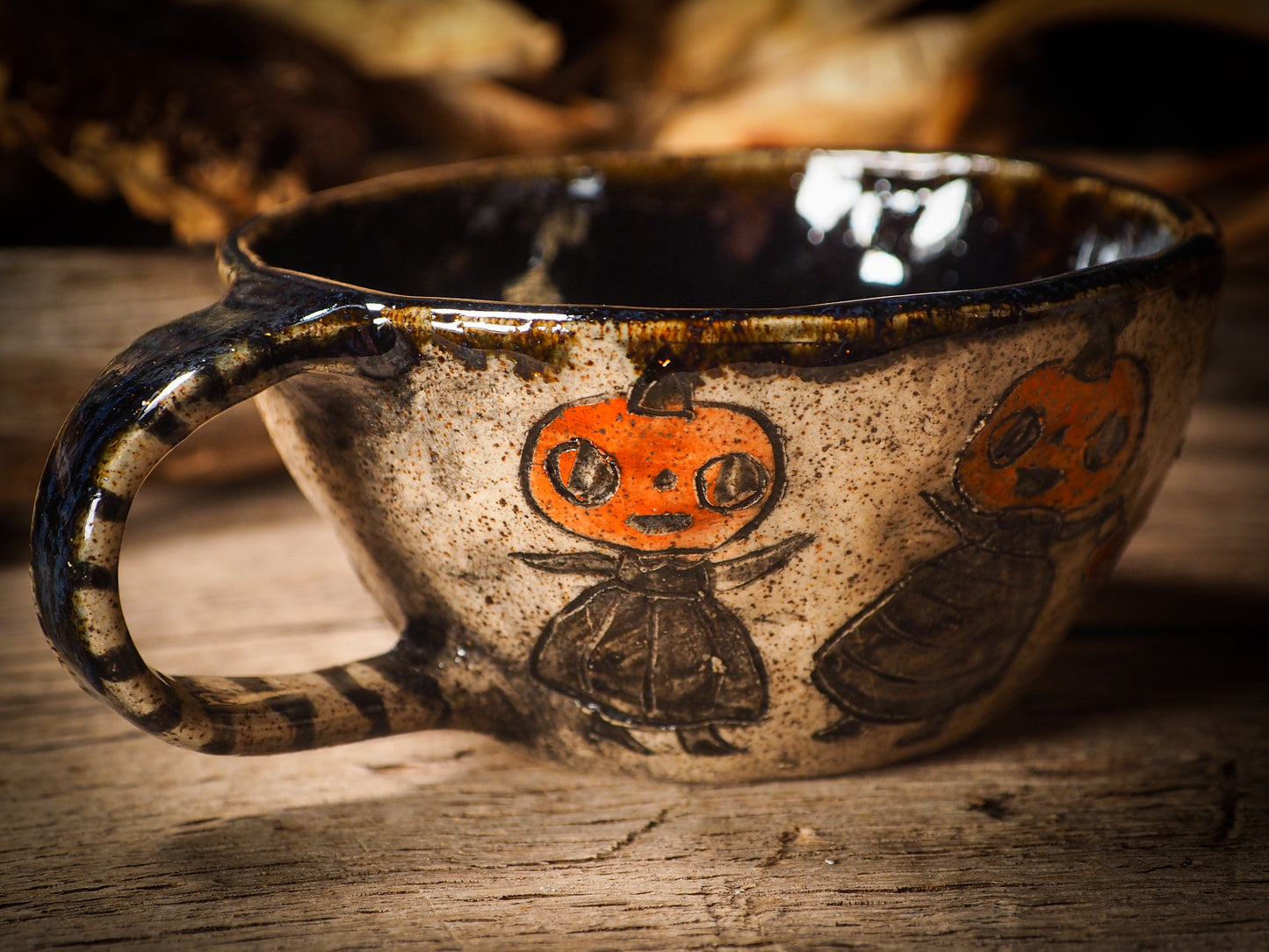 The mug is hand carved with Halloween motives like ghosts, skeletons, witches, ghouls, black cats and more come to life as hand carvings on the sides, with an inside covered in a beautiful food safe glaze with intricate swirls of colors to discover as you enjoy your favorite drink on it.