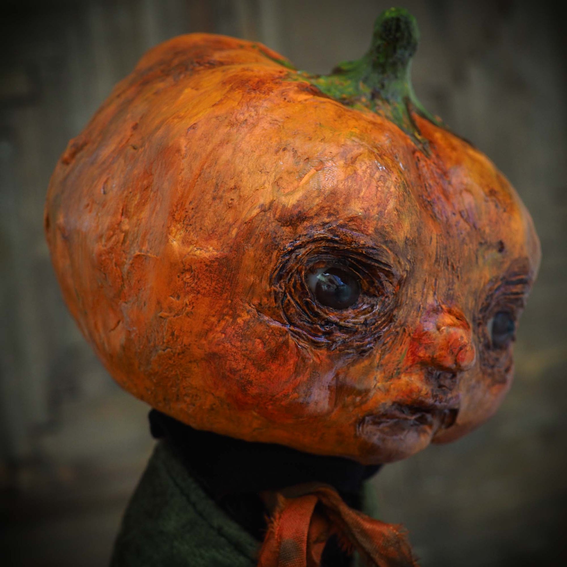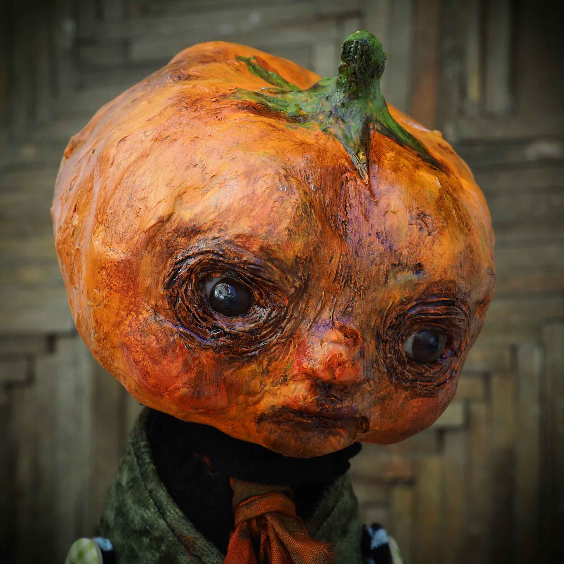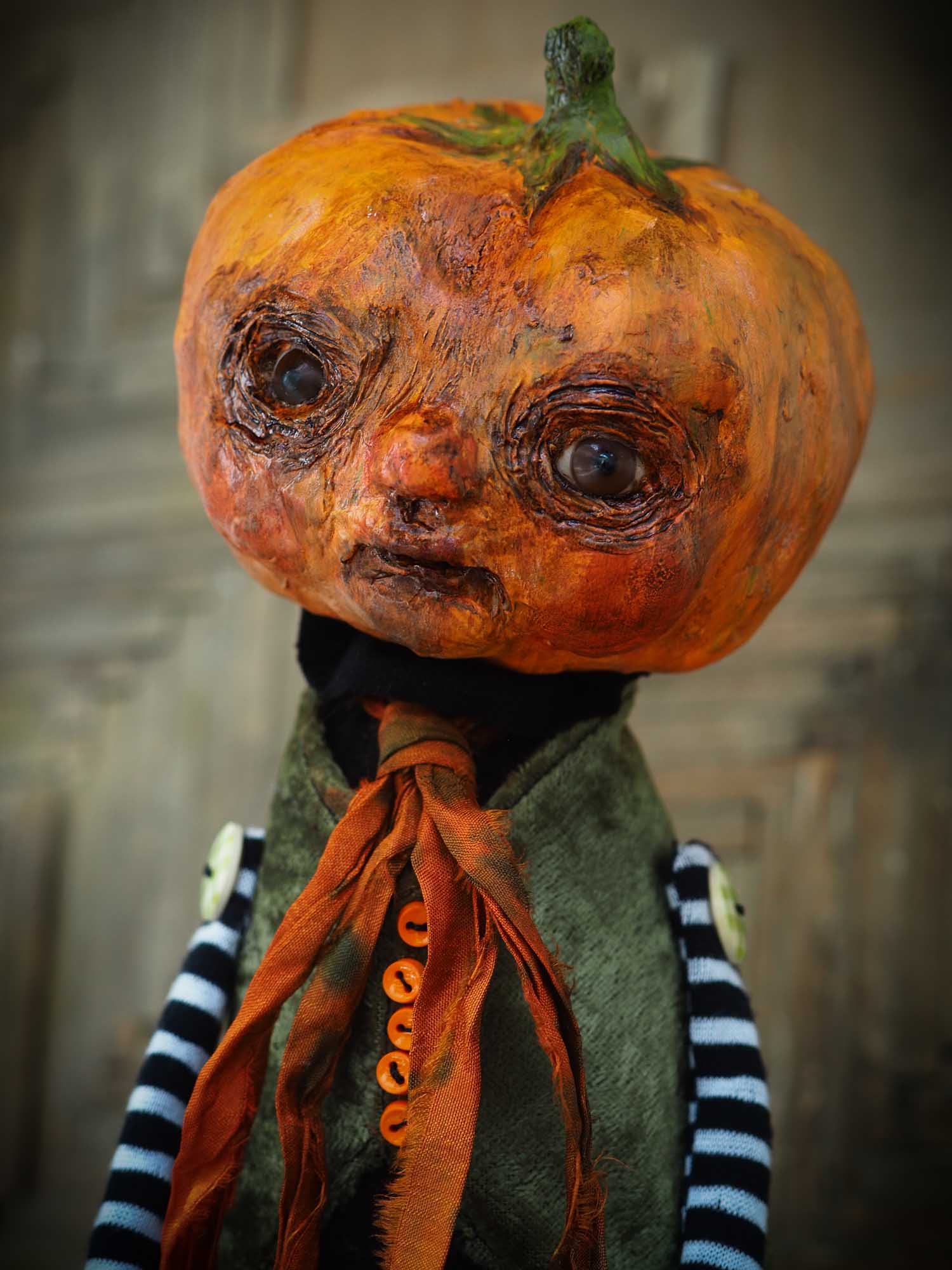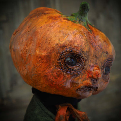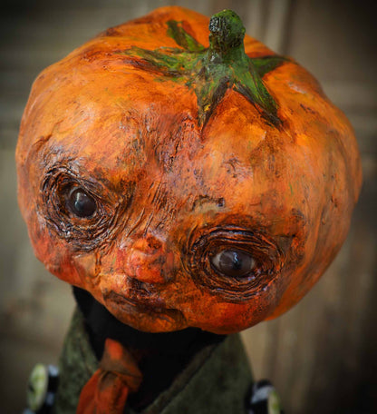 His head is made of paper clay, with astonishing glass eyes that look right back at you when gaze on them. There is a lot of detail on the pumpkin's facial expression with sculpted features around the eyes and mouth.