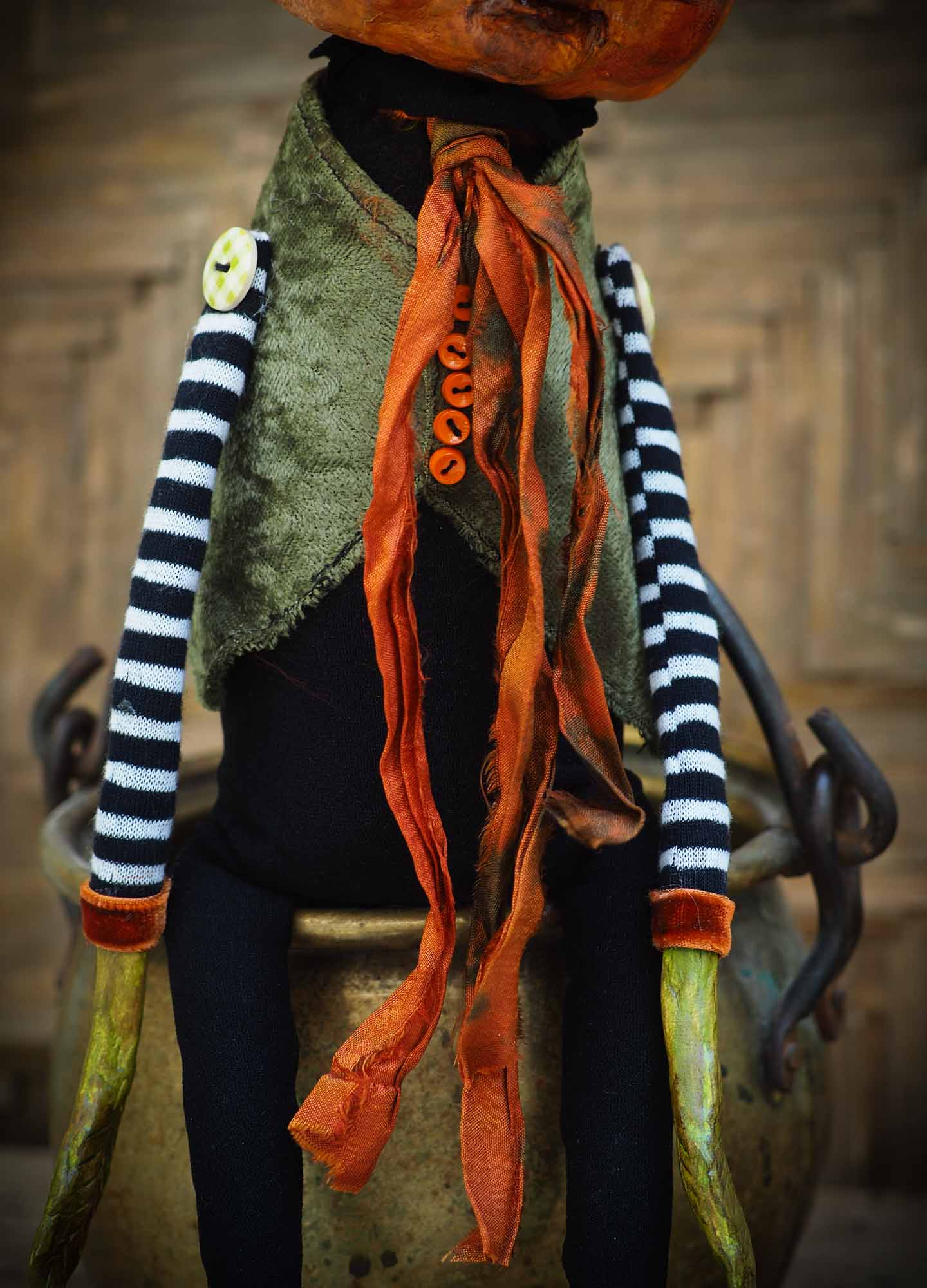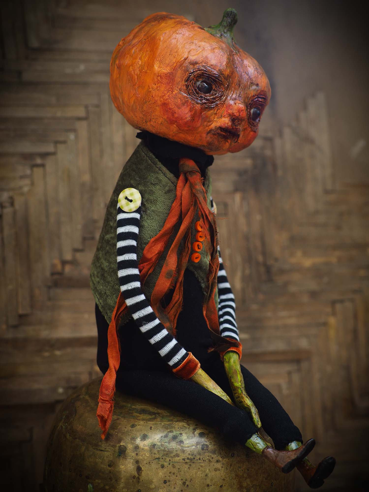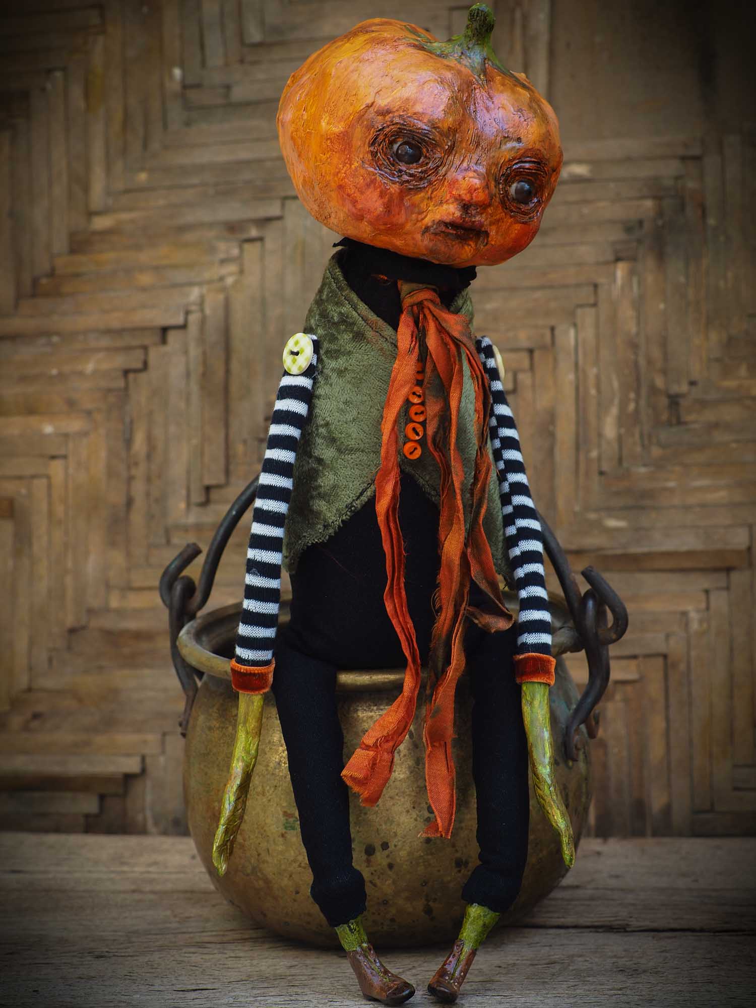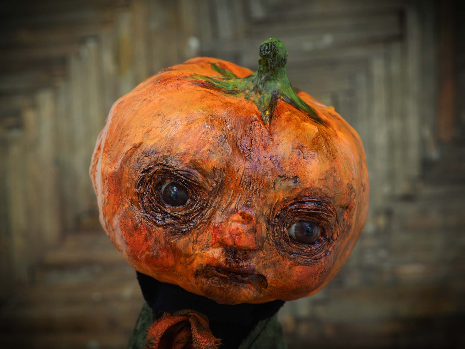 His head is made of paper clay, with astonishing glass eyes that look right back at you when gaze on them. There is a lot of detail on the pumpkin's facial expression with sculpted features around the eyes and mouth.