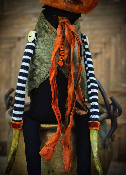 And now, this pumpkin boy is living on Danita's studio while he looks for a forever home. It is an amazing handmade Halloween jack-o-lantern pumpkin doll.