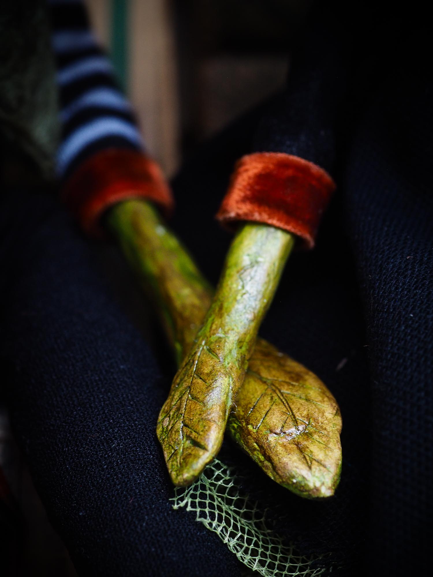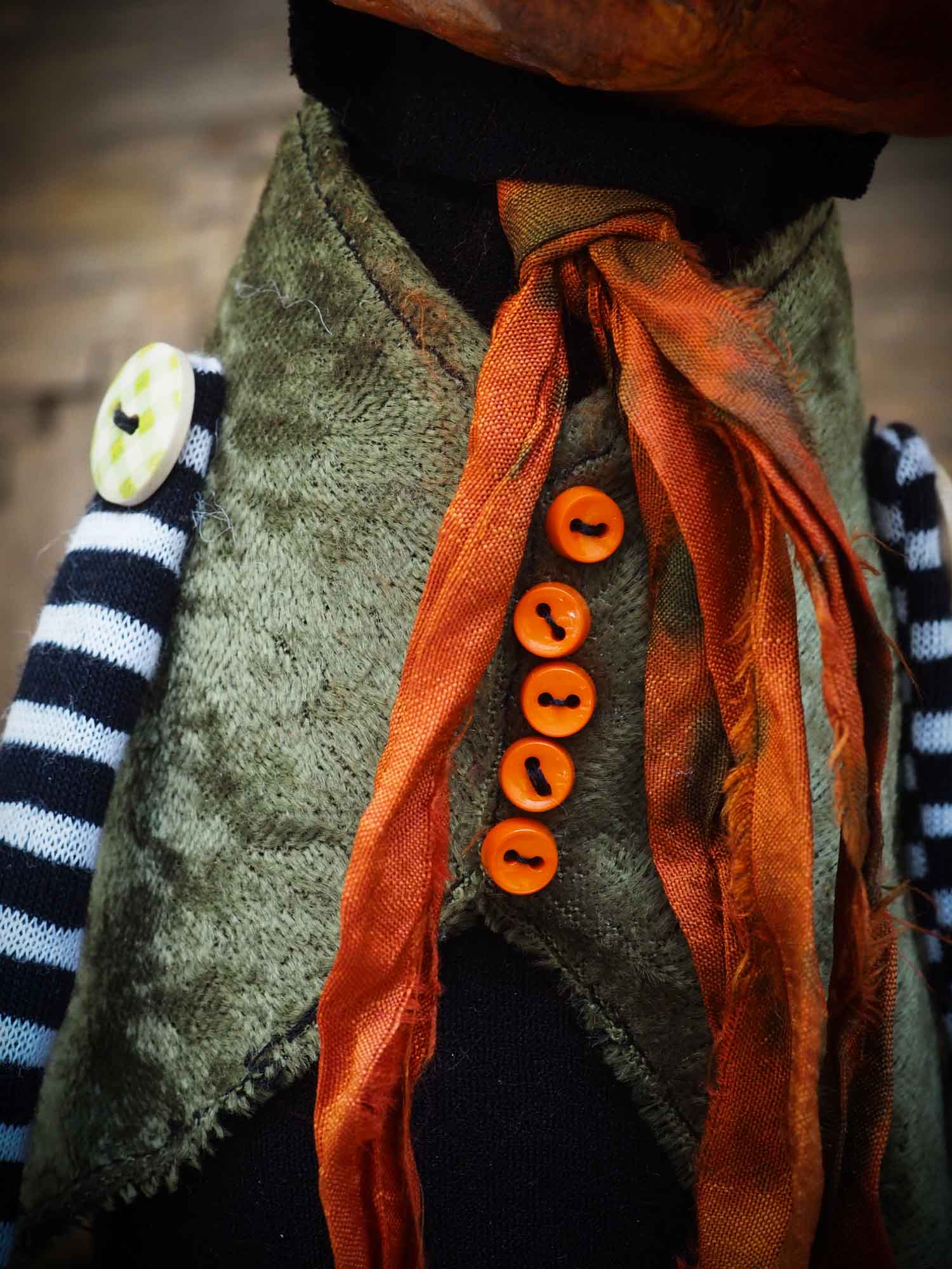He is wearing a handmade green velvet vest with tiny orange buttons, and a ragged scarf on his neck.