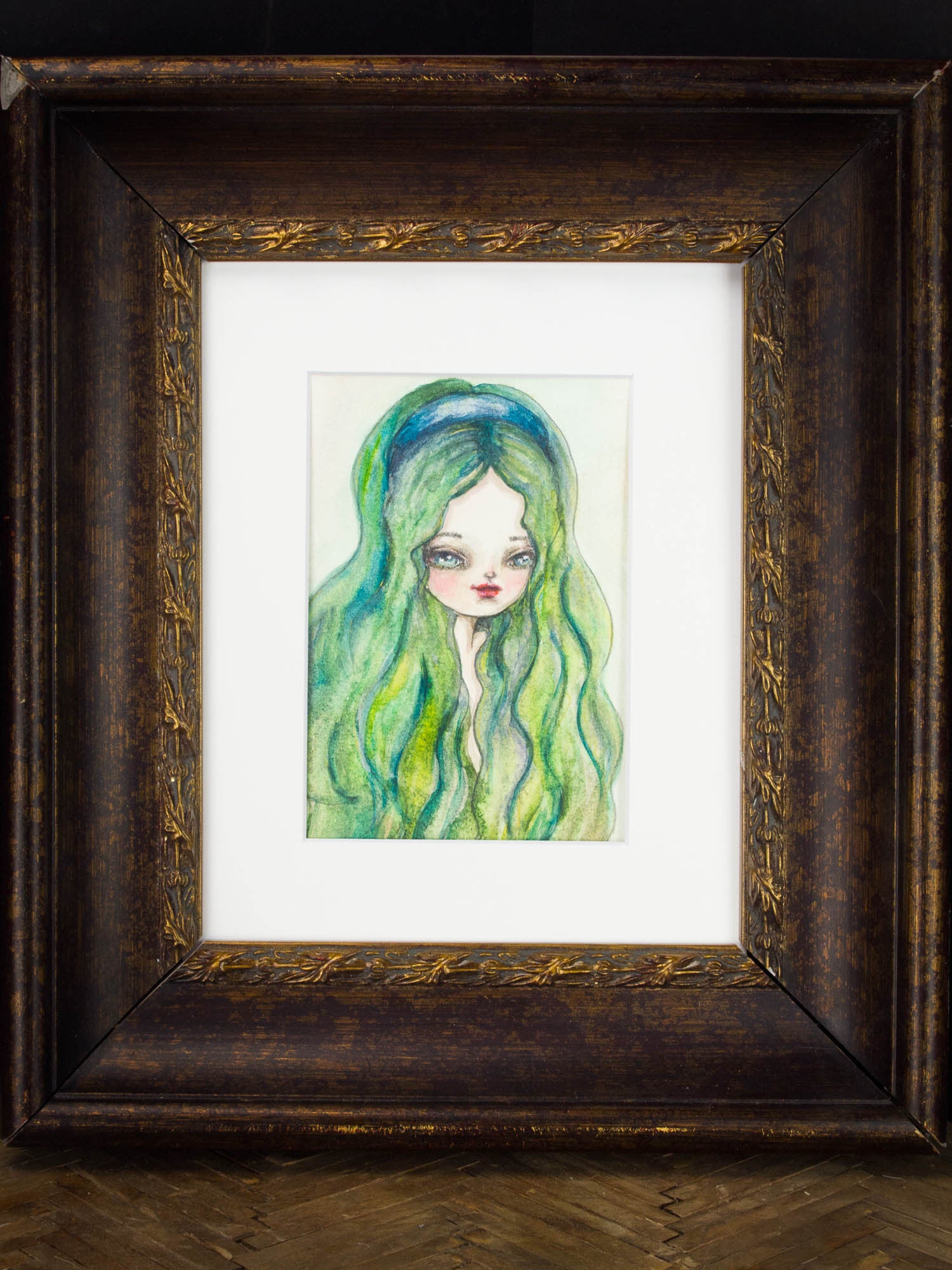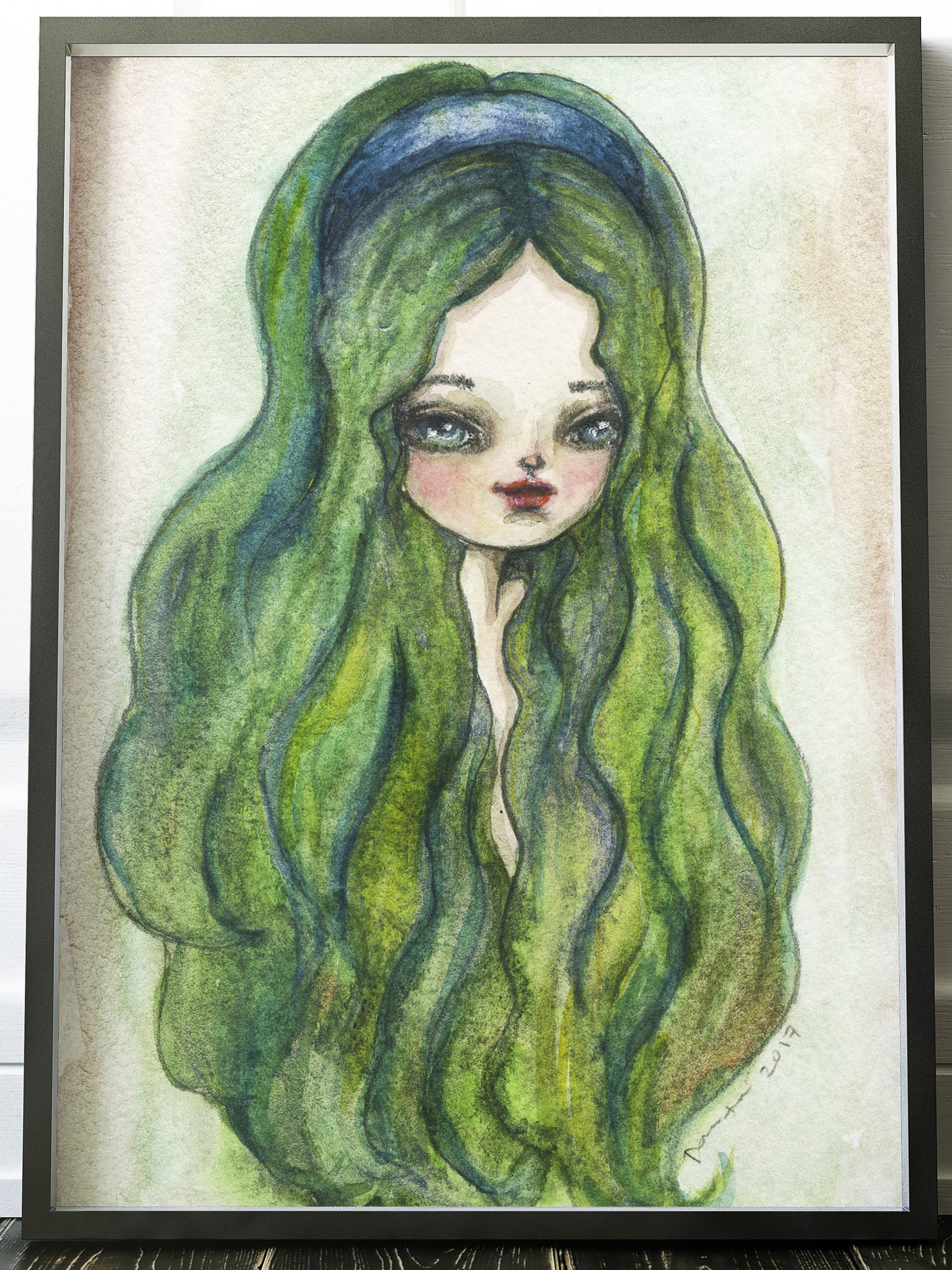 I was thinking about the beautiful semiprecious stone, emerald, while I was doodling, and I wondered how would it look if one day it turned into a woman. Se turned out seductive, attractive and mysterious. And you can see the traces of real minerals on the paints I used for her gold and green details on her hair.