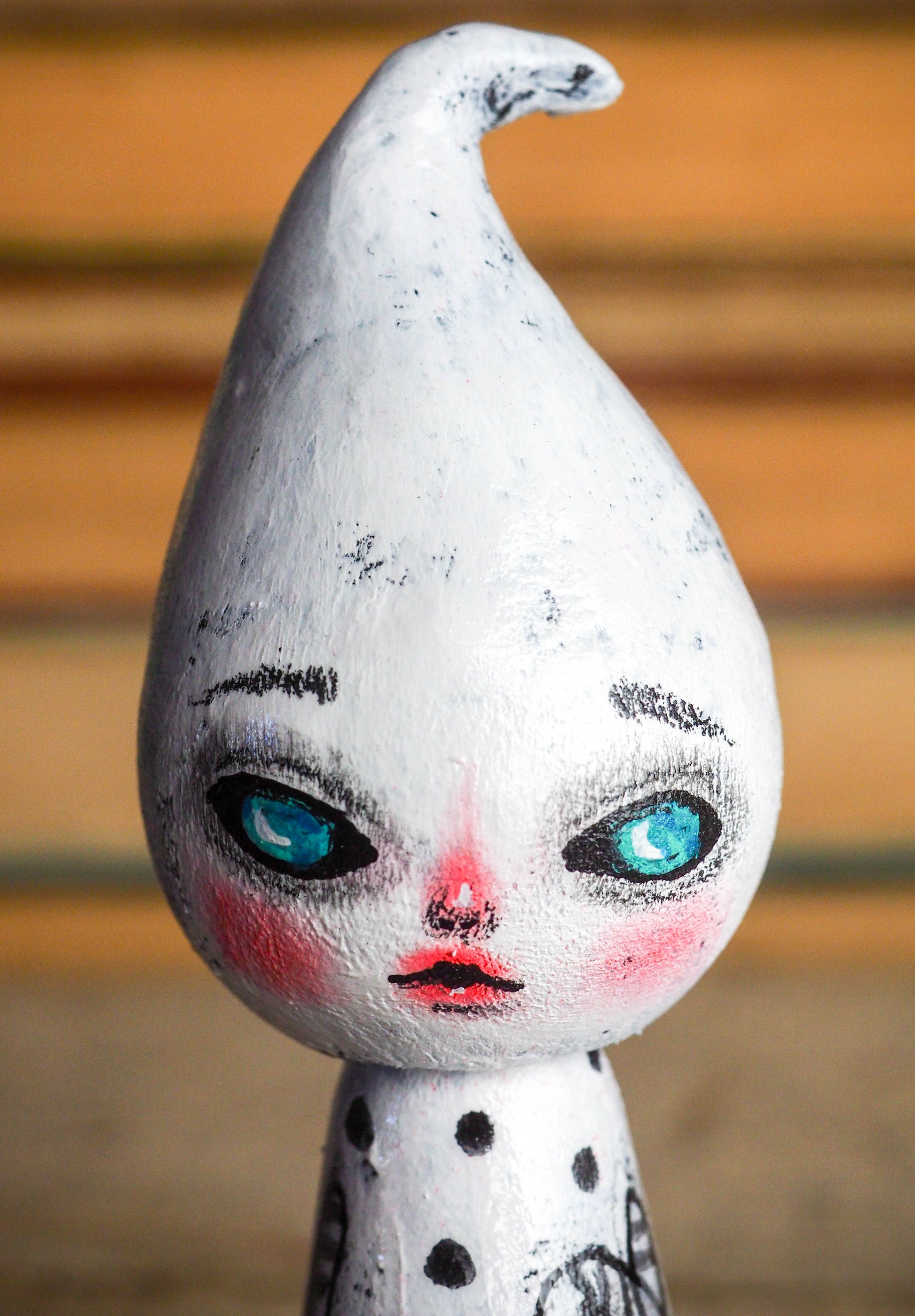This little ghost girl started out like a wooden peg doll, hand painted and sculpted with air clay to turn her into a ghost. A jack-o-lantern in her hands and the most beautiful melancholic blue eyes in her face.