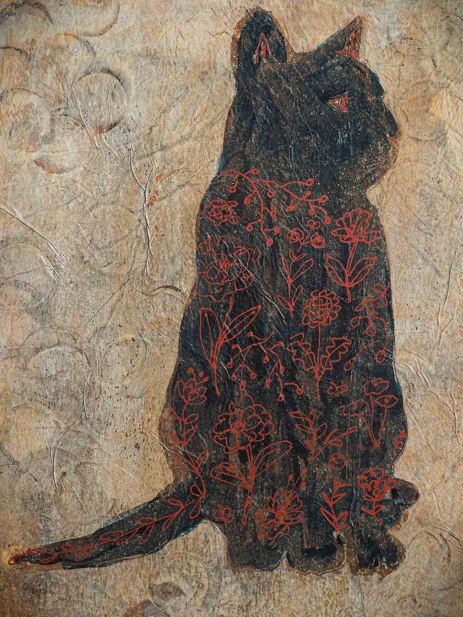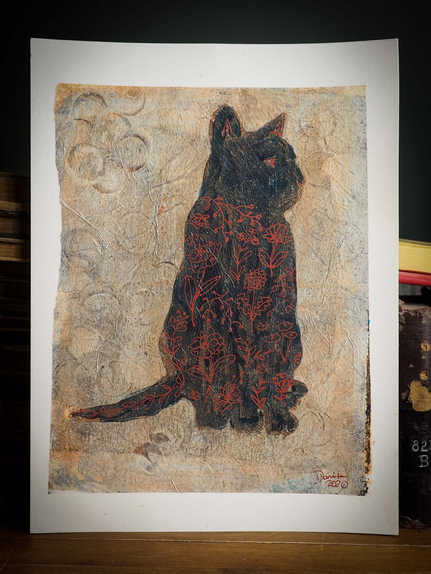 Created from an original illustration transfer to paper by Danita on her studio, this cat themed abstract artwork is a delight to look at.