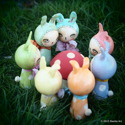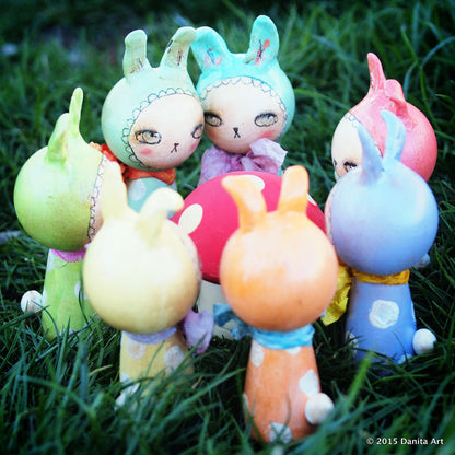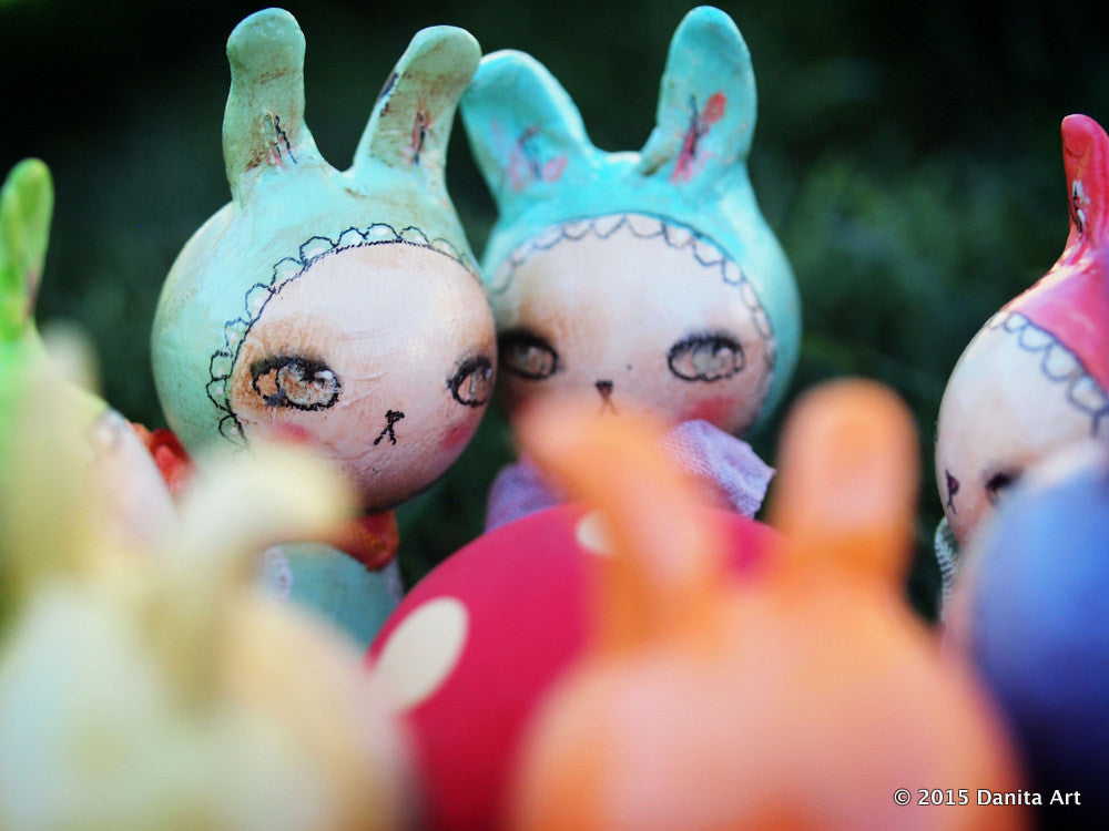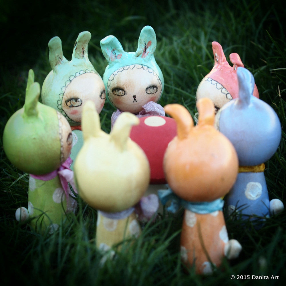 Since Spring has sprung early here at Danita Art, I decided to create a pack of wild Easter kokeshi bunny rabbit dolls, and they have made my shop their home while they are waiting to be adopted. don't worry, they may be wild but they can easily be tamed with love and candy bribes. They are already taking over my heart, and I am sure each one of them will steal your heart too.