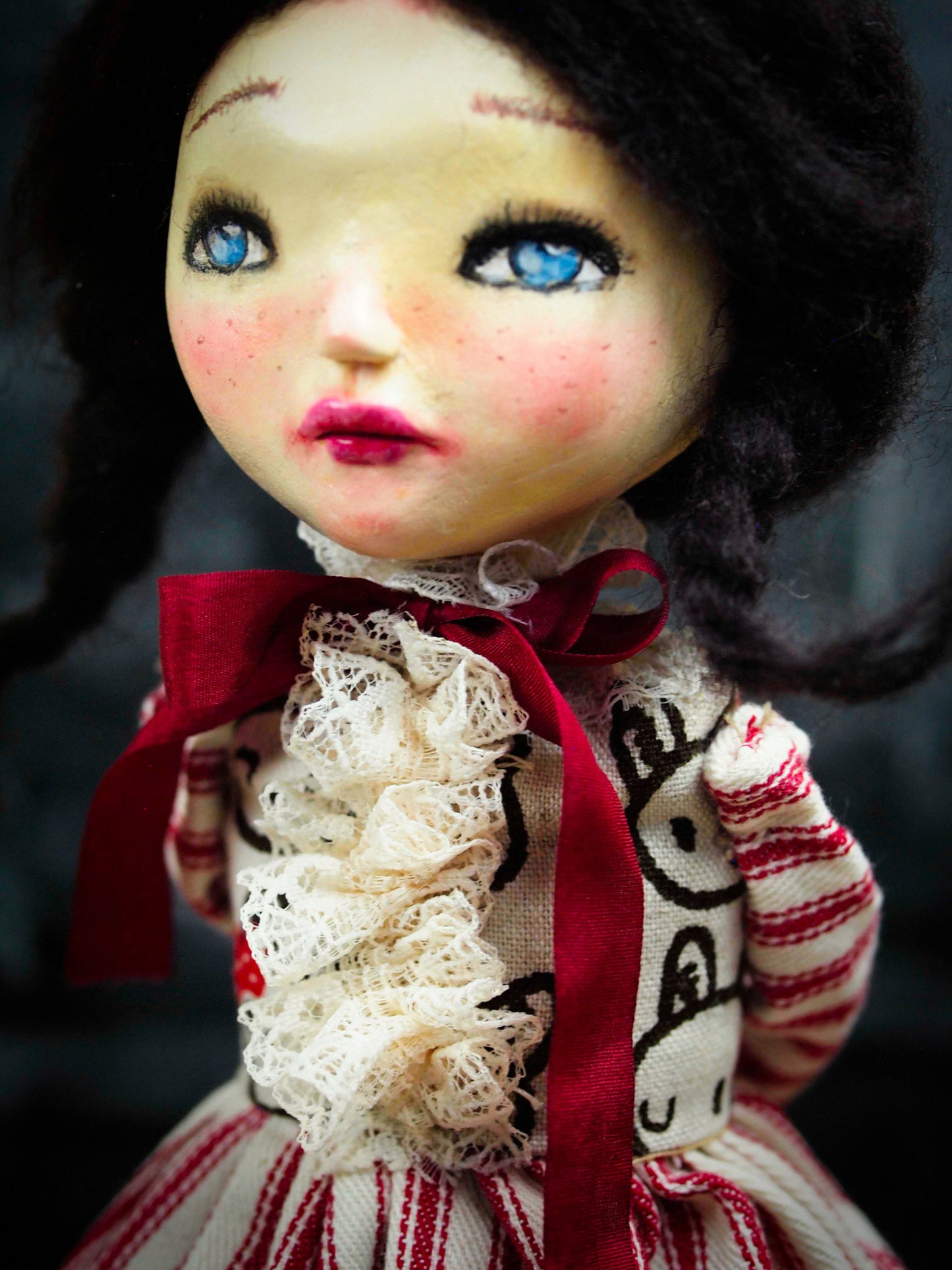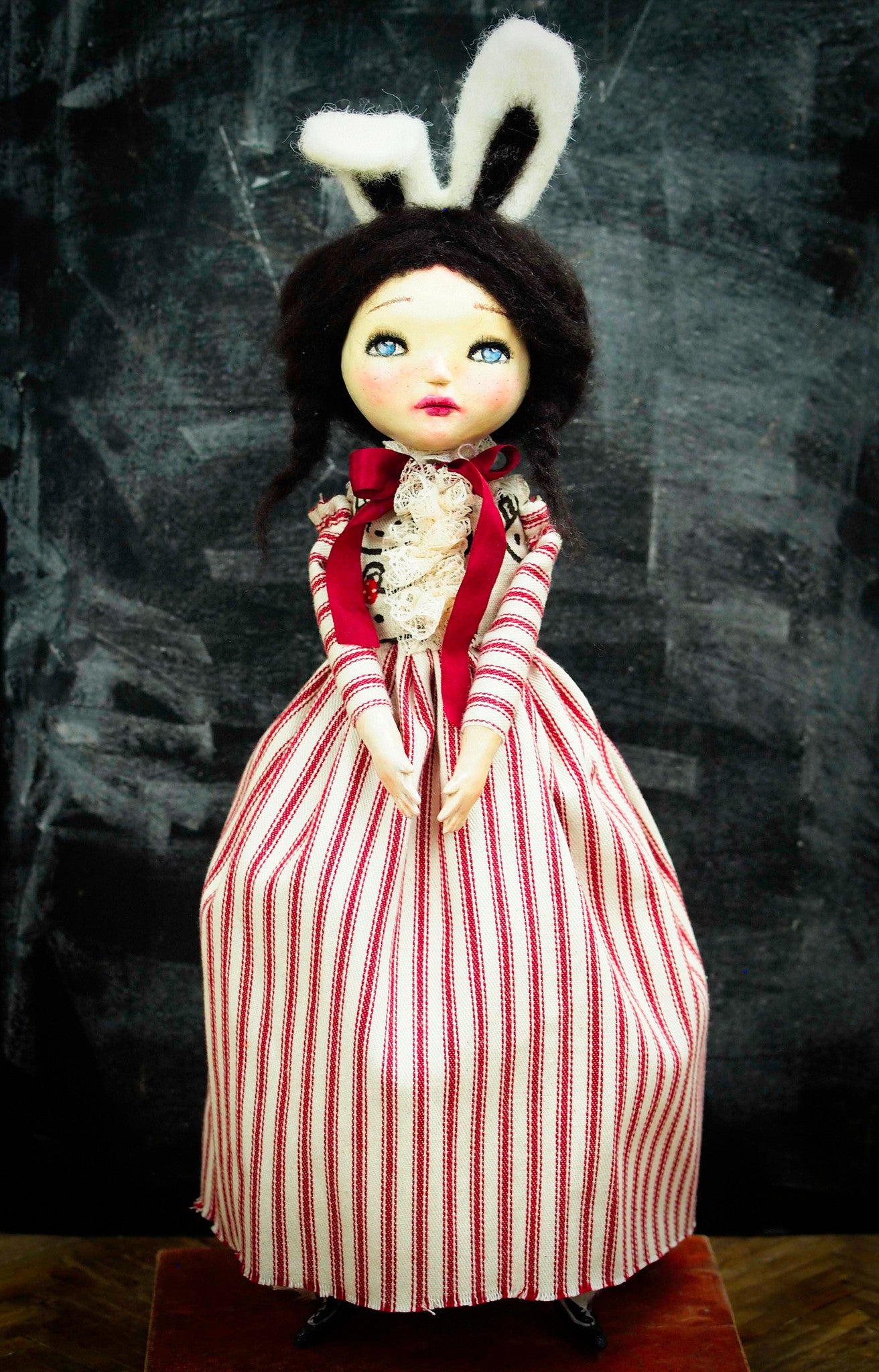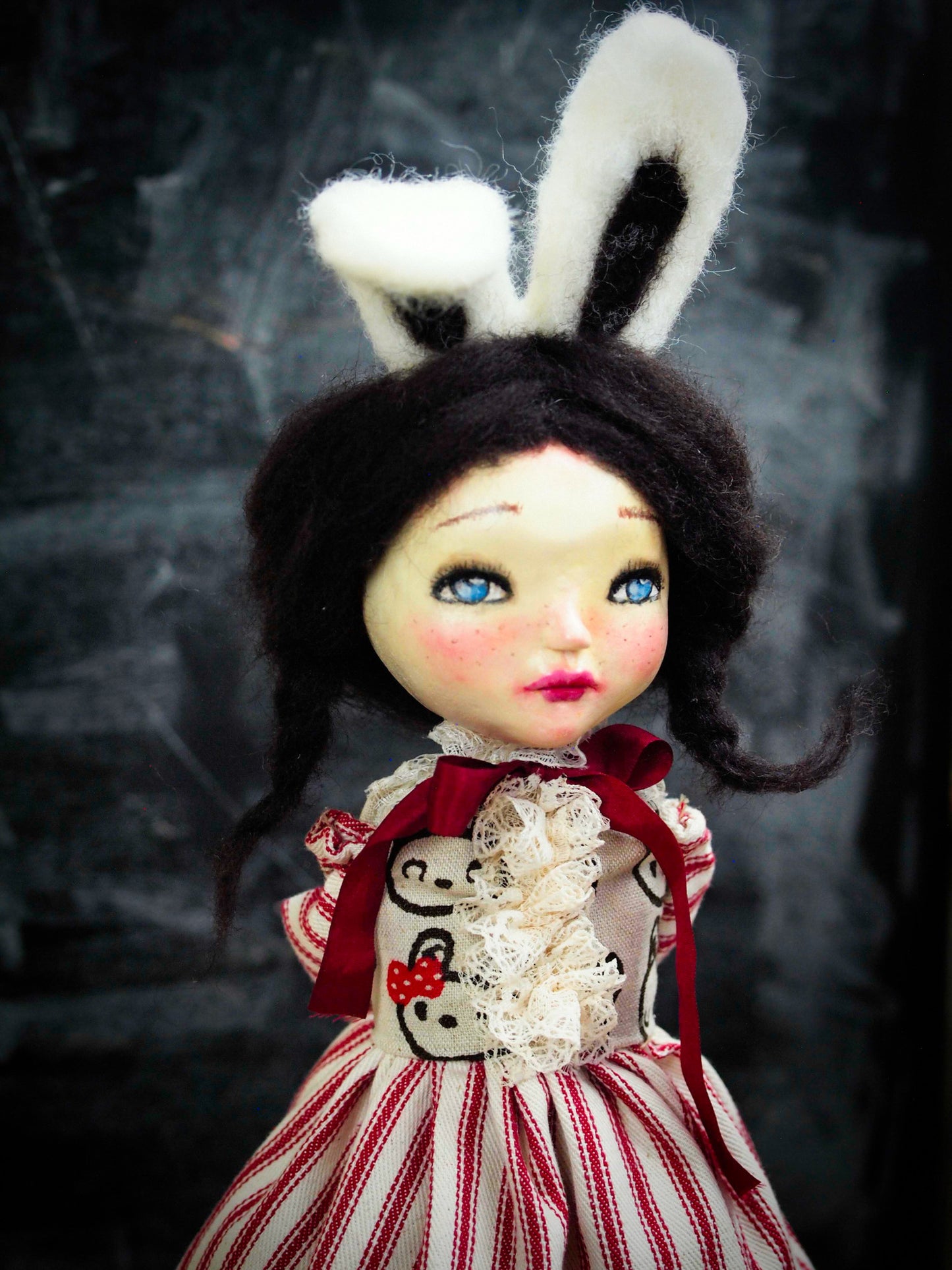 Little miss bunny is an original handmade art doll by me, Danita Art. She measures approximately 11 inches tall from her head to bottom of her soft fabric body. Her head is hand sculpted out of paper clay, with a beautiful face, freckles and blue melancholic eyes that have turned into my signature feature on all my dolls, a bitter sweet expression mixing infinite love with the deepest sorrow.