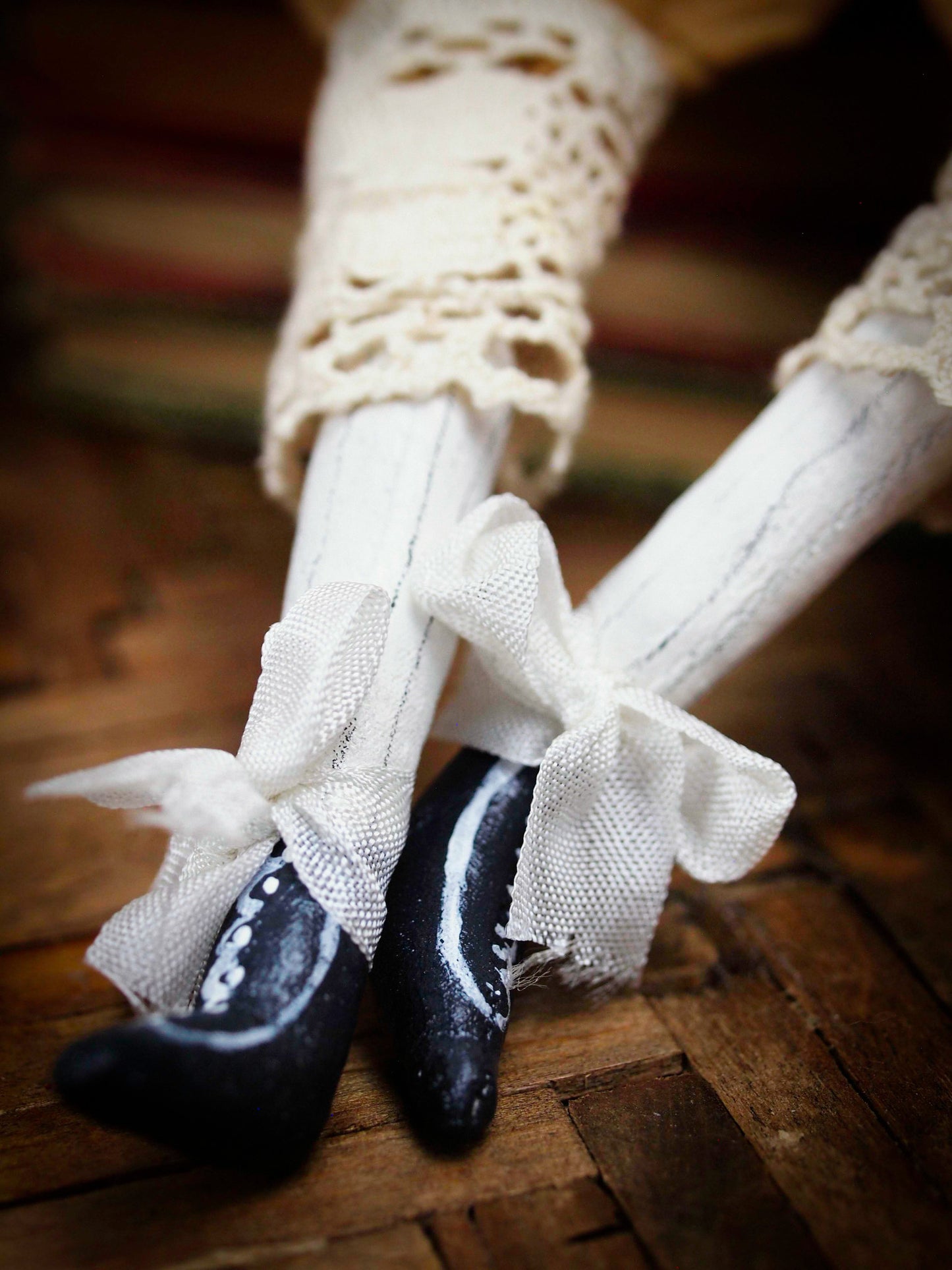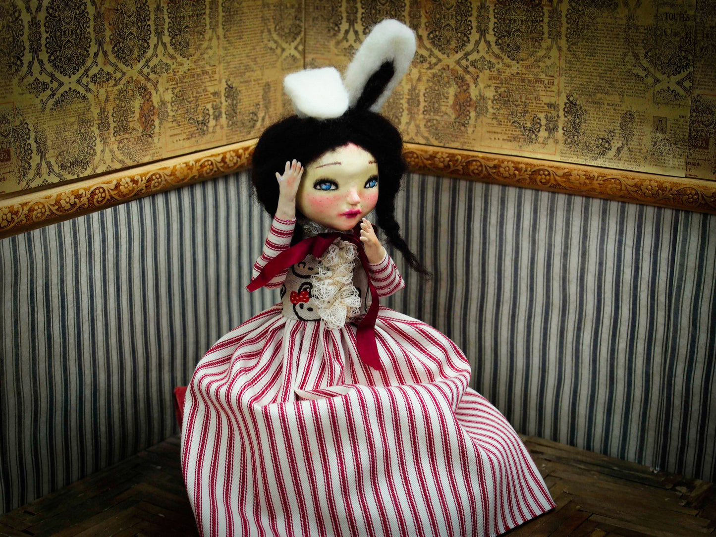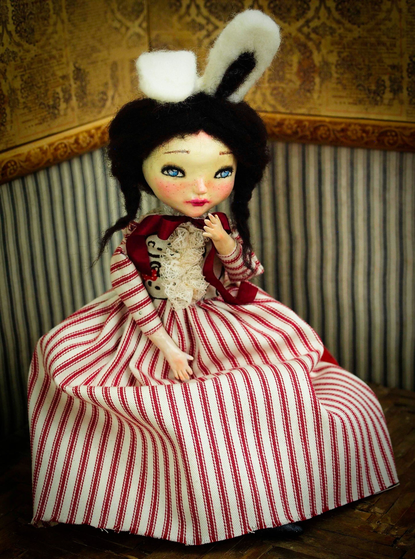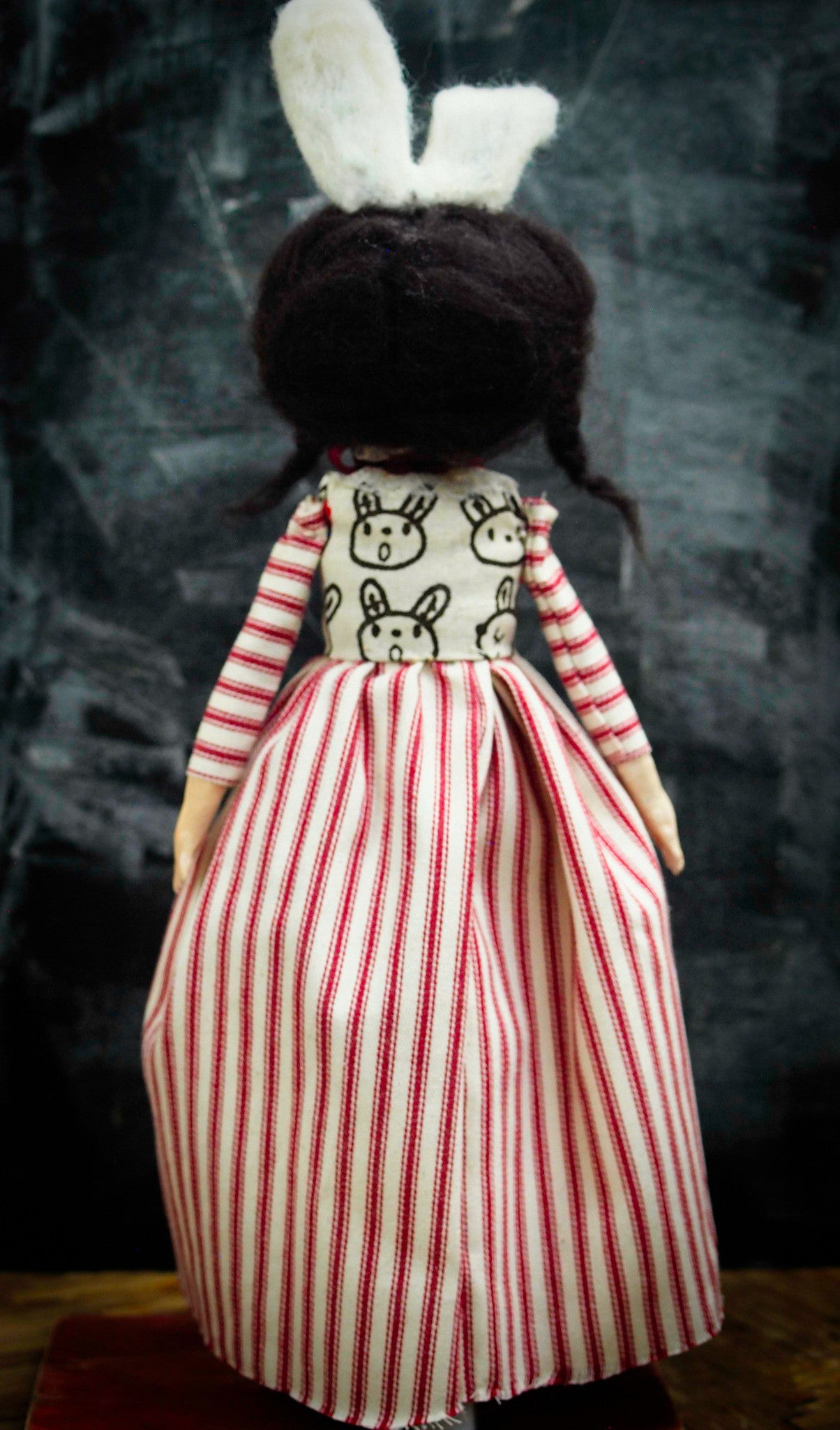 This hand made art doll is wearing a stripped dress of my own design, with a blouse made with a rabbit patterned piece of cloth I found who knows where :) Full of lacy details like her blouse and boots and fluffy bunny ears, because, of course, she is me.