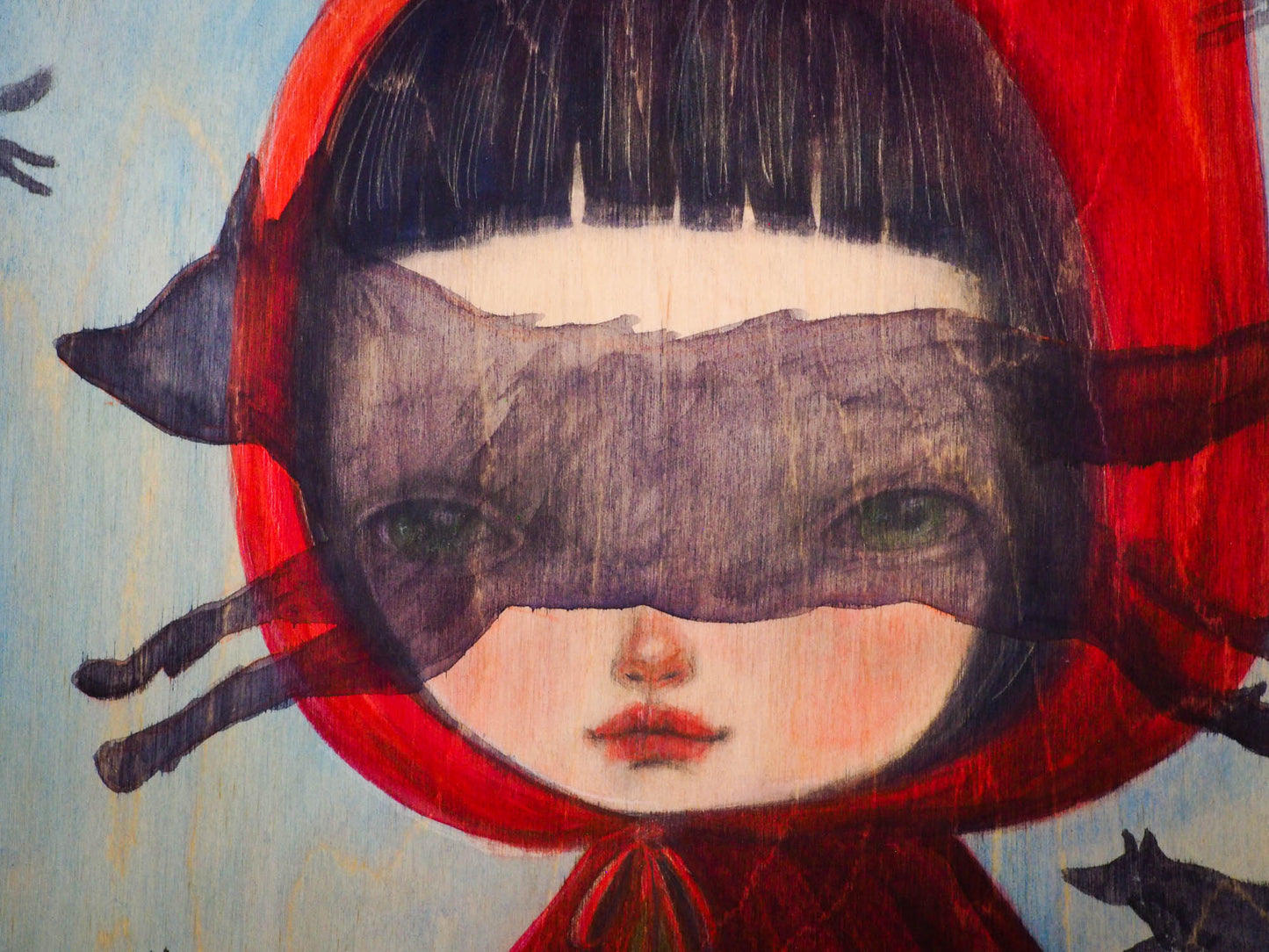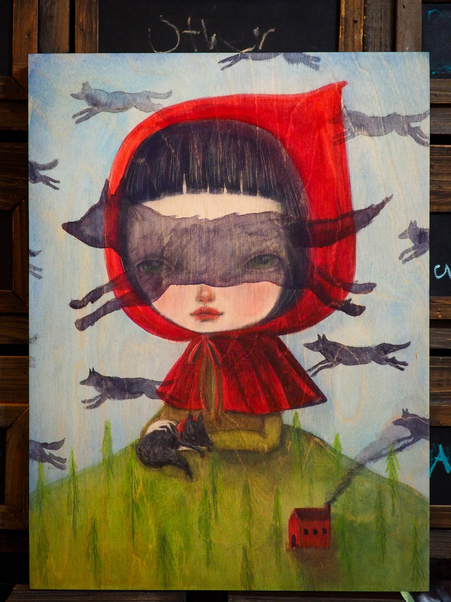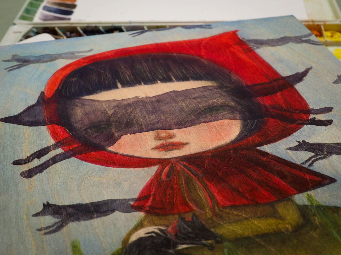 She is beautiful! I painted her on a 12" x 16" gallery style wood panel. I used different art materials like Pastel pencils, Inks, Watercolors and Gouaches and more to give Little Red Riding Hood a special Danita interpretation.