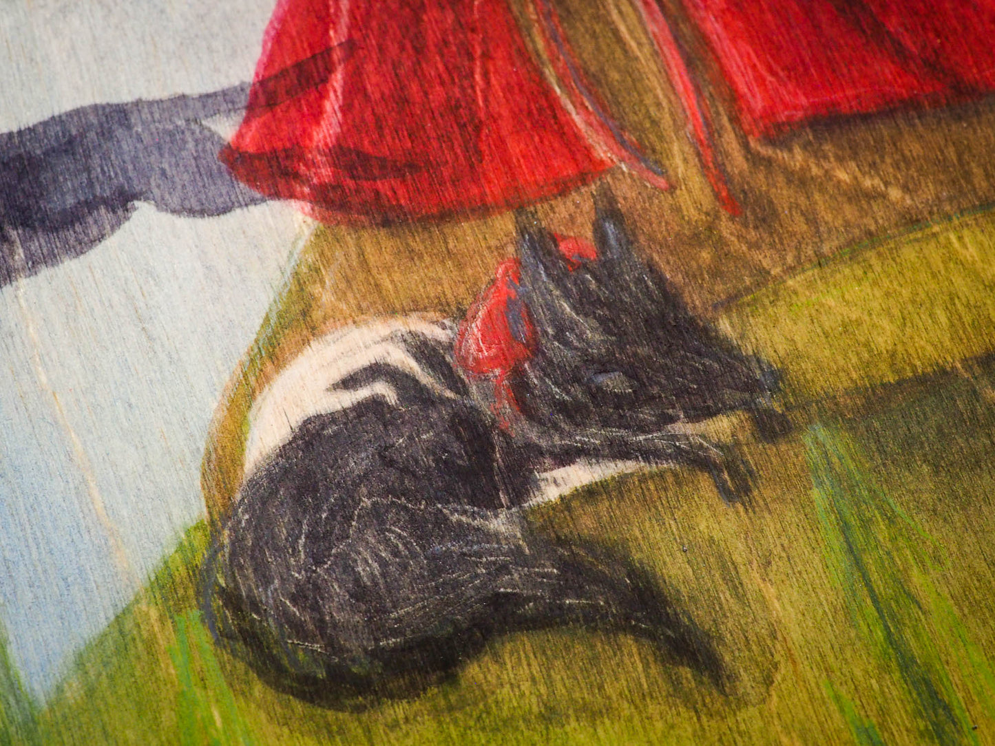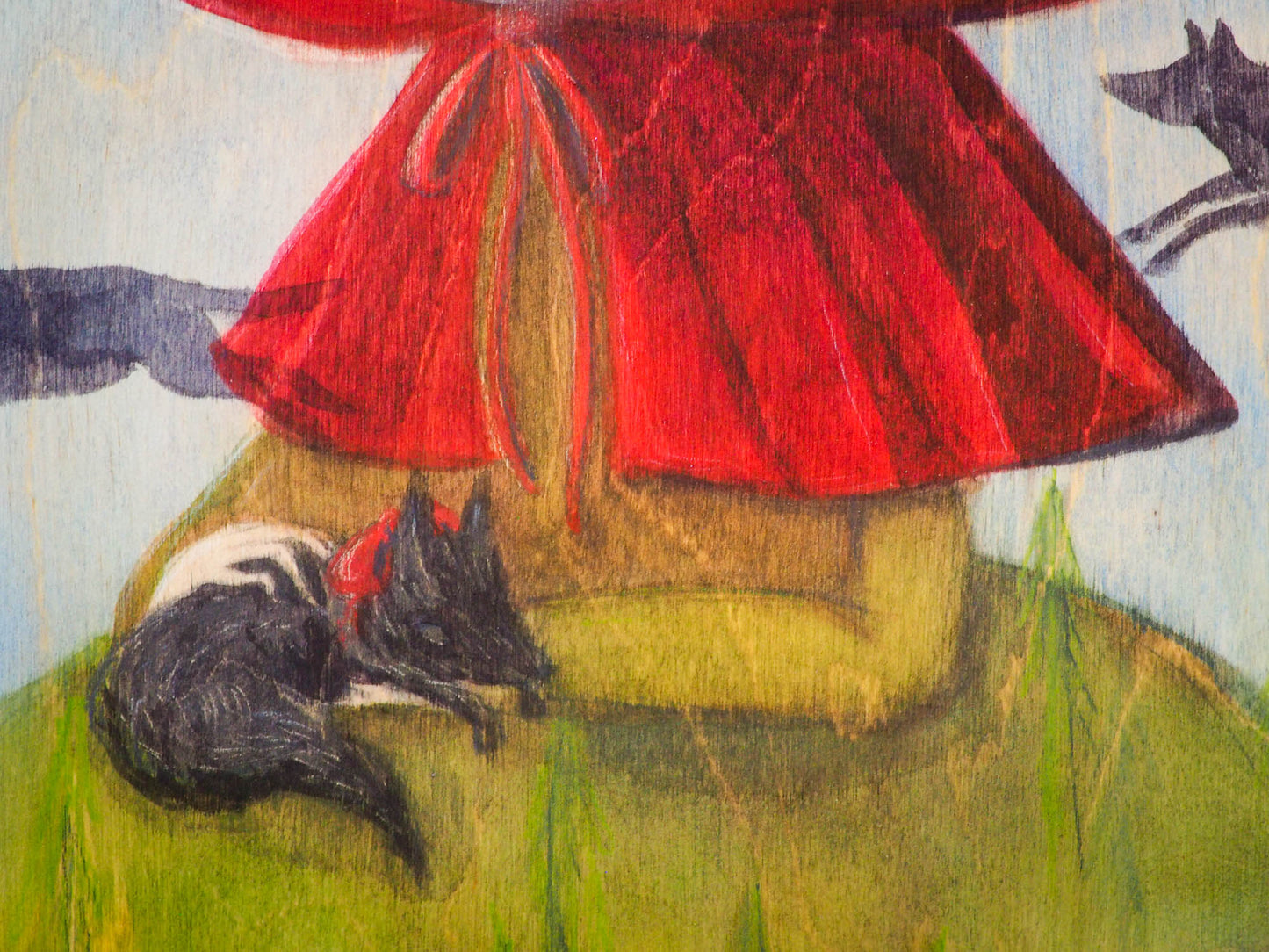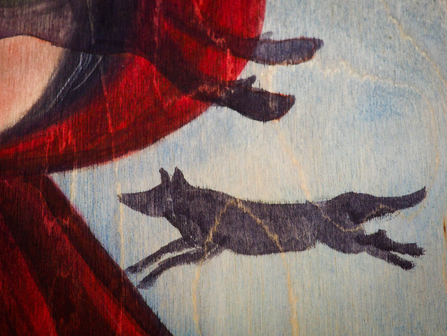 She is beautiful! I painted her on a 12" x 16" gallery style wood panel. I used different art materials like Pastel pencils, Inks, Watercolors and Gouaches and more to give Little Red Riding Hood a special Danita interpretation.