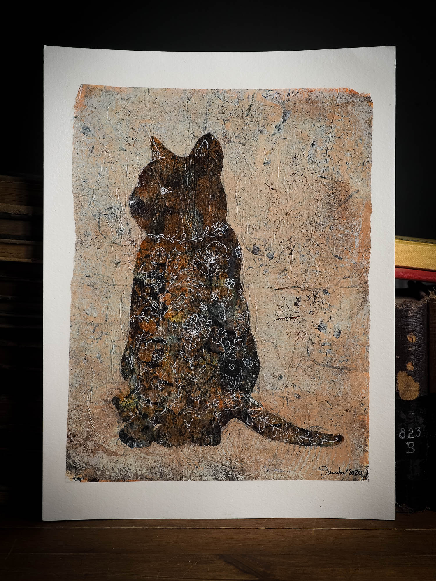 Created from an original illustration transfer to paper by Danita on her studio, this cat themed abstract artwork is a delight to look at.