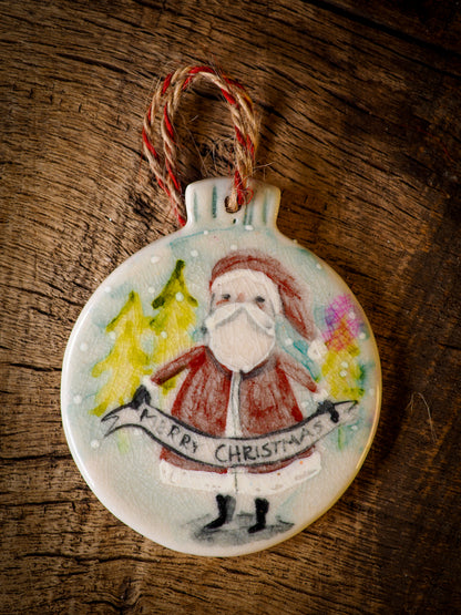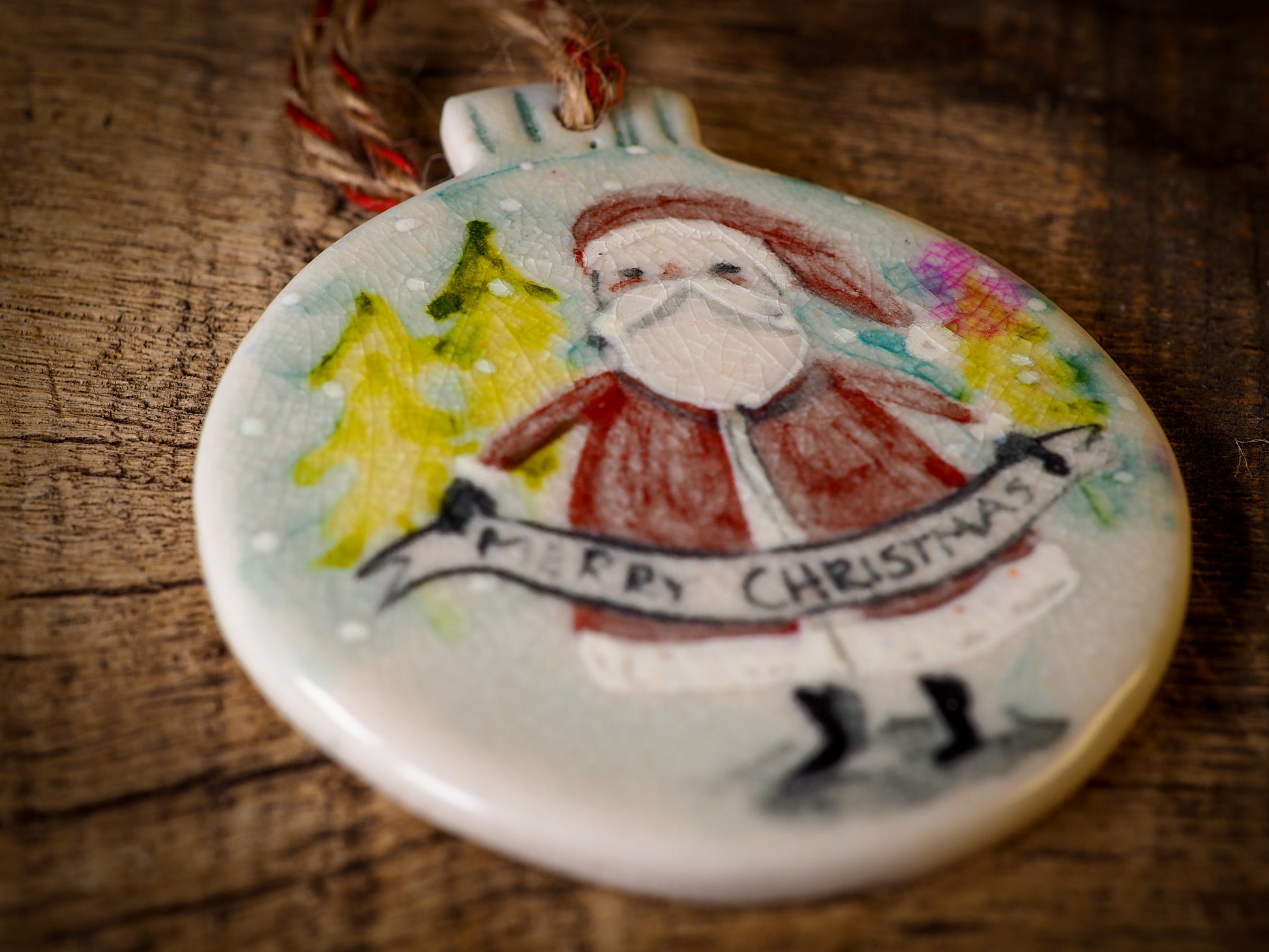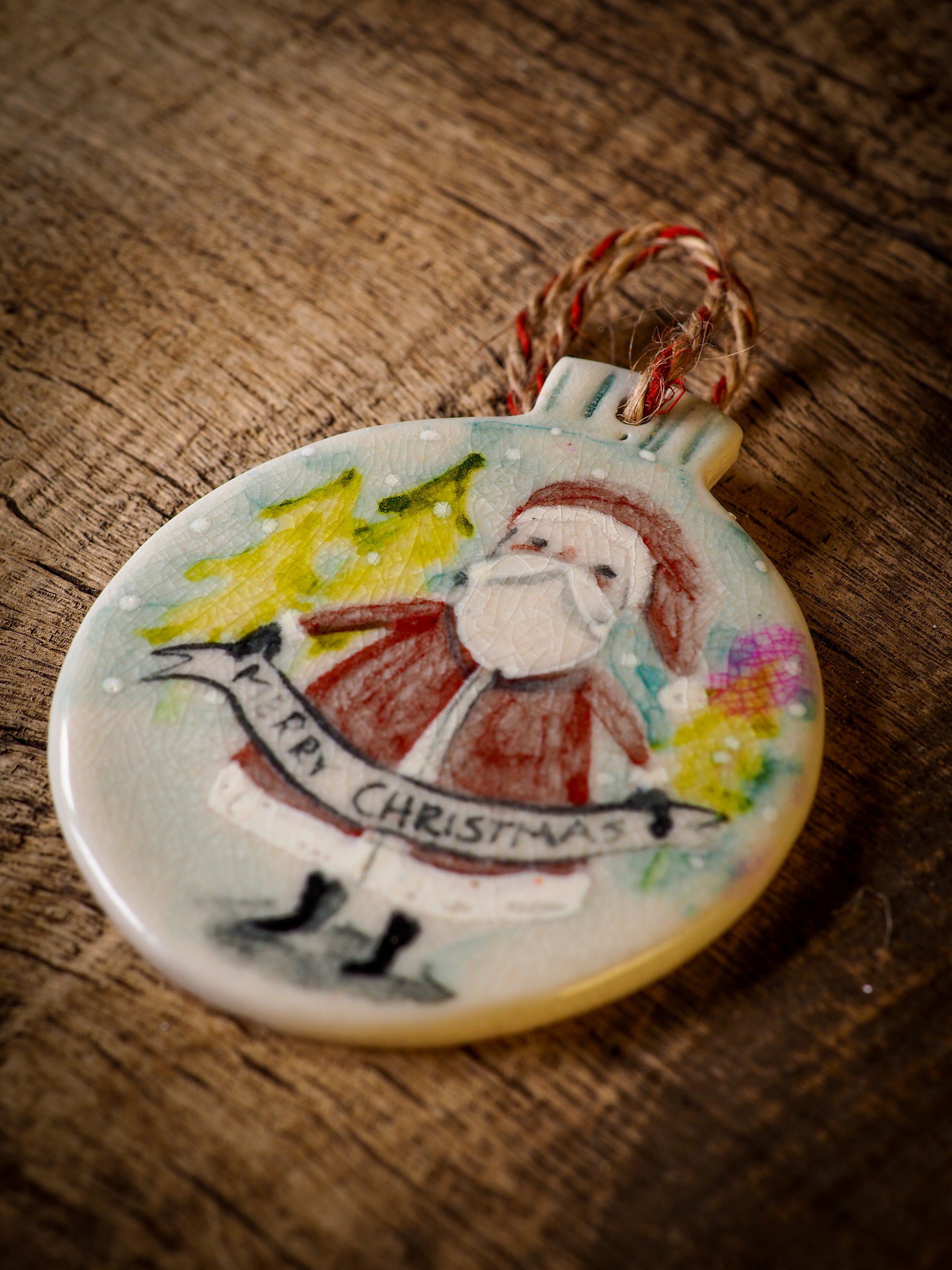 Totally hand made on my studio, each of my ornaments is hand painted, fired twice on a kiln at more than 2000 Degrees, then finished with a beautiful twine hanger.
