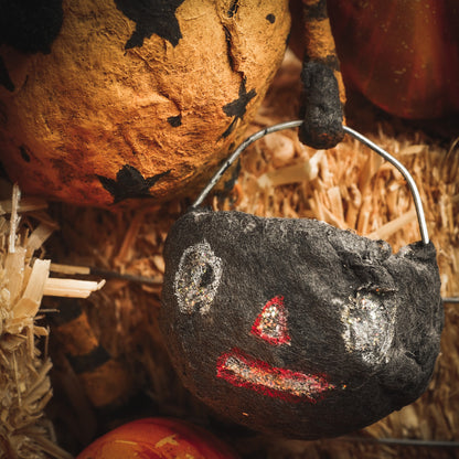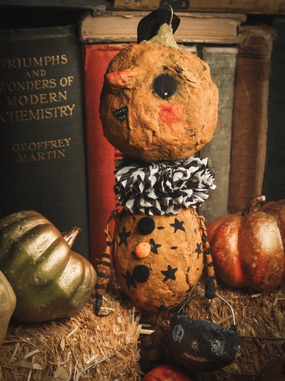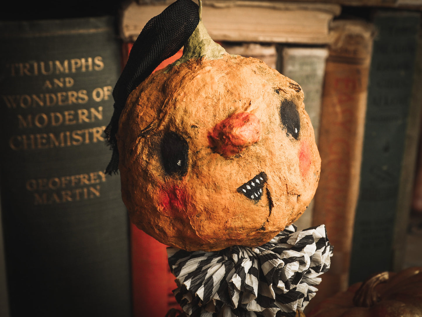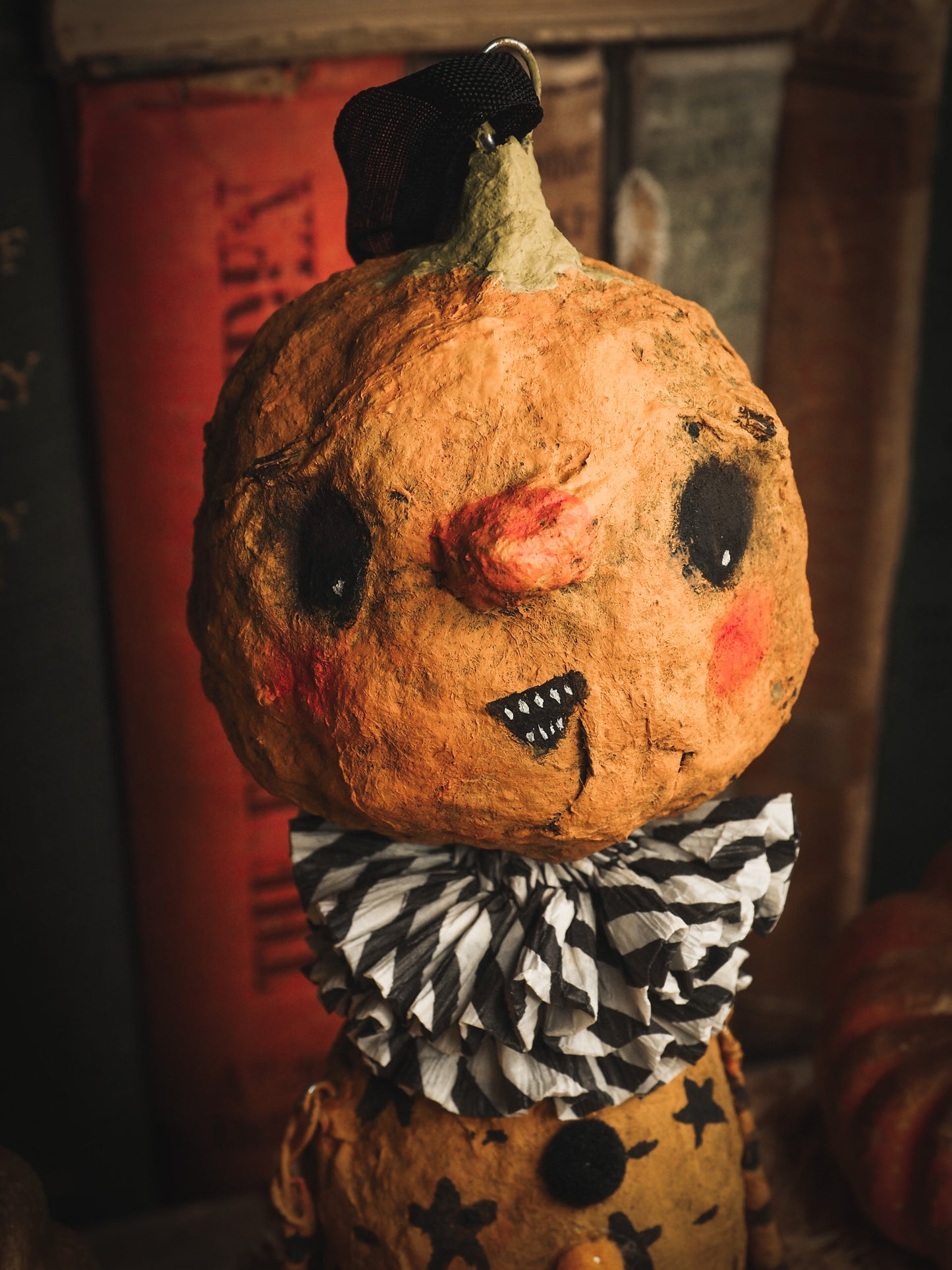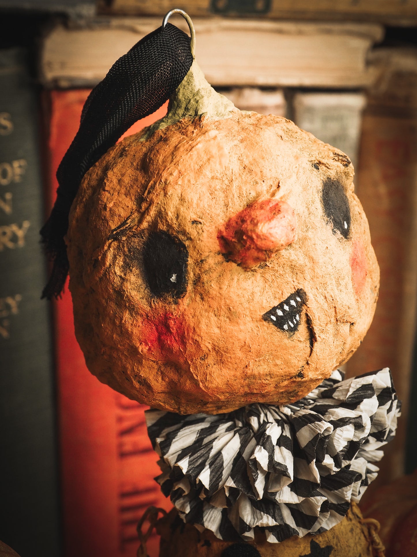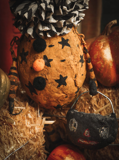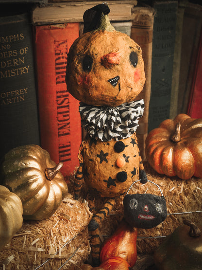 This time I created a collection of spun cotton jack-o-lantern pumpkin doll creatures with paper clothes. They have hand painted faces with super adorable details like little teeth, hand made jack-o-lantern pumpkins with glitter for their Halloween candy as they go trick-or-treat and matching collars and hats made out of paper.