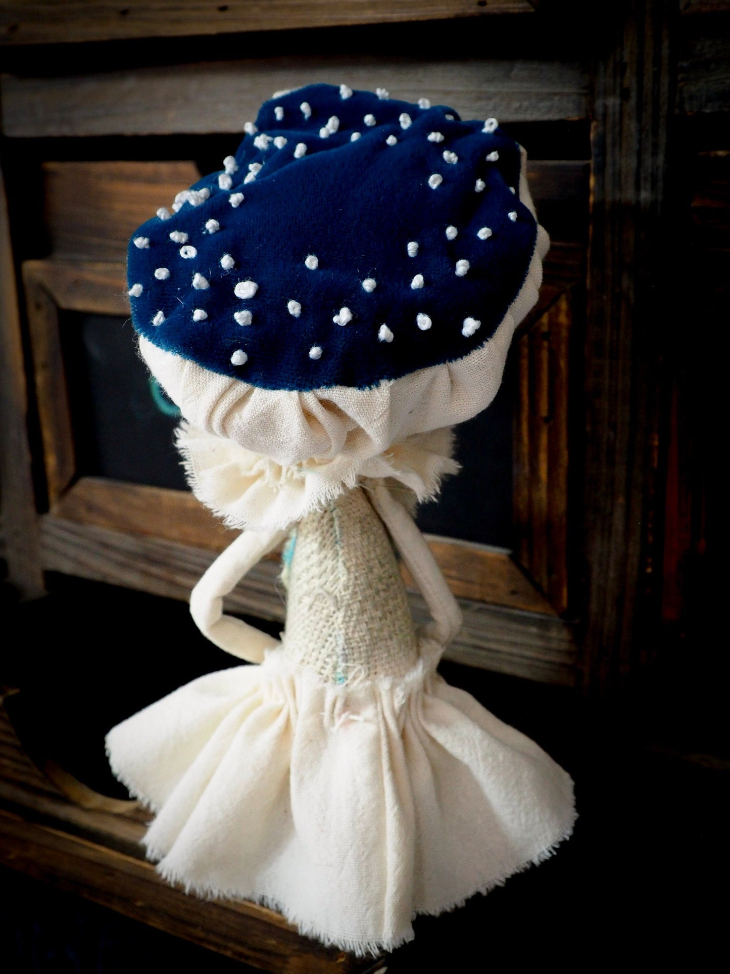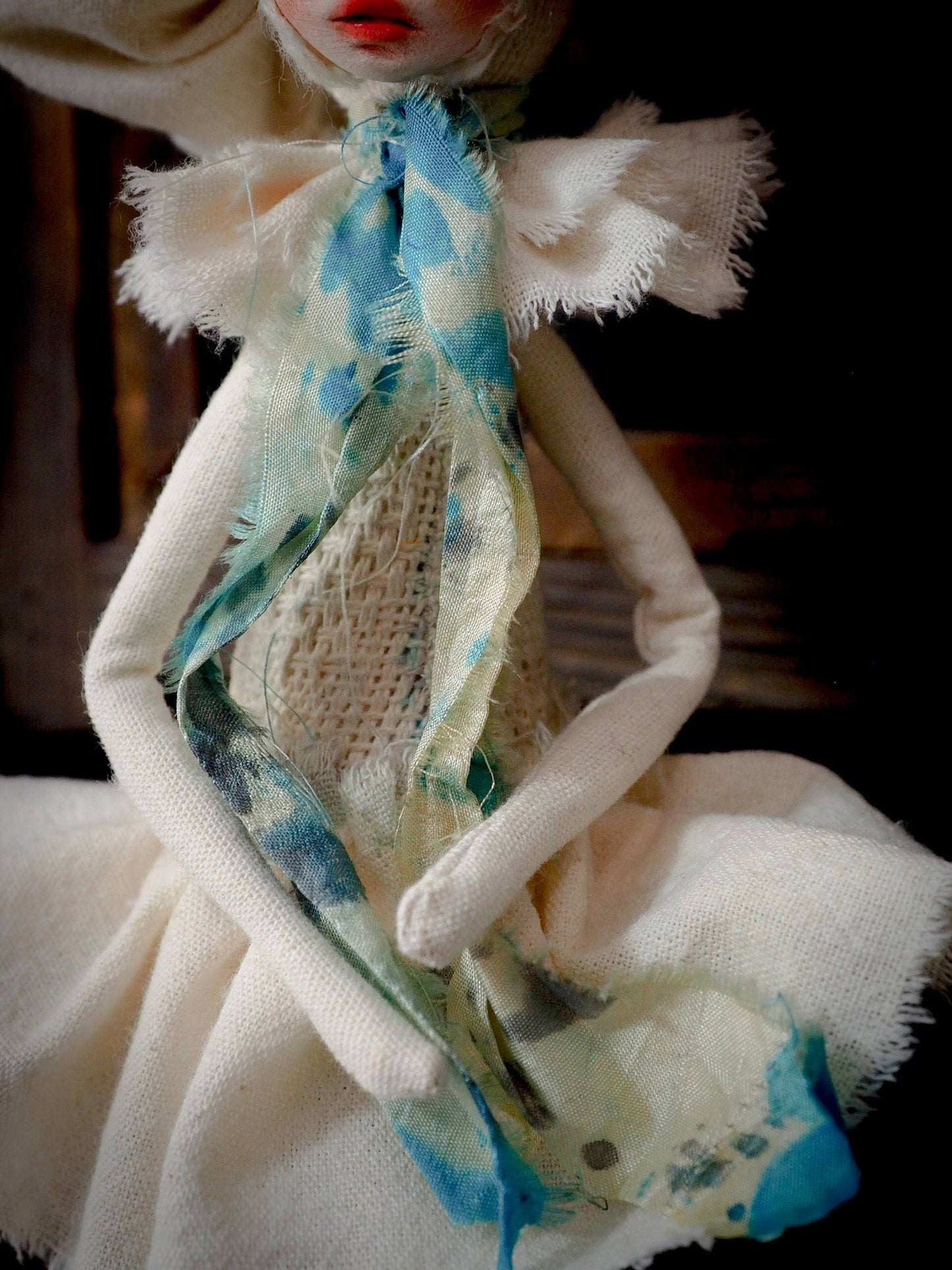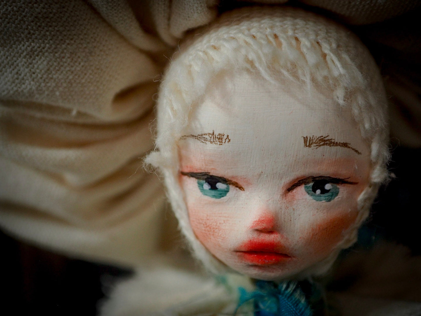 Their bodies are filled and shaped by hand, then sewn into a body that holds a beautiful air dry clay face, painted with my melancholic and mysterious eyes that you know so well, with a unique personality that makes each of them a unique piece of soft, huggable art.