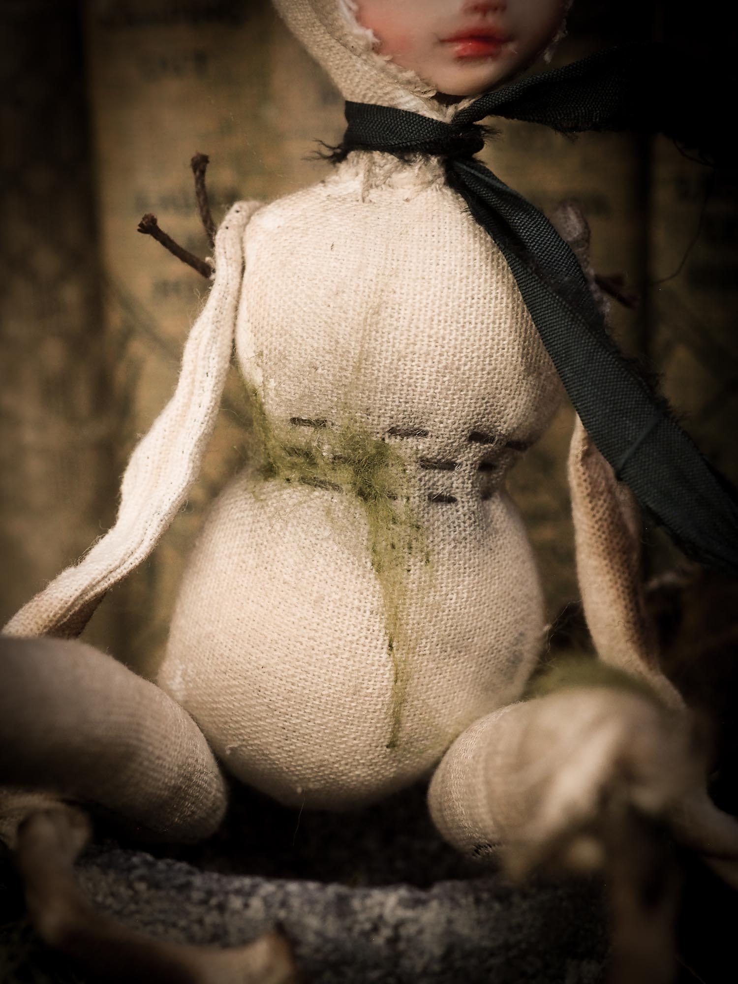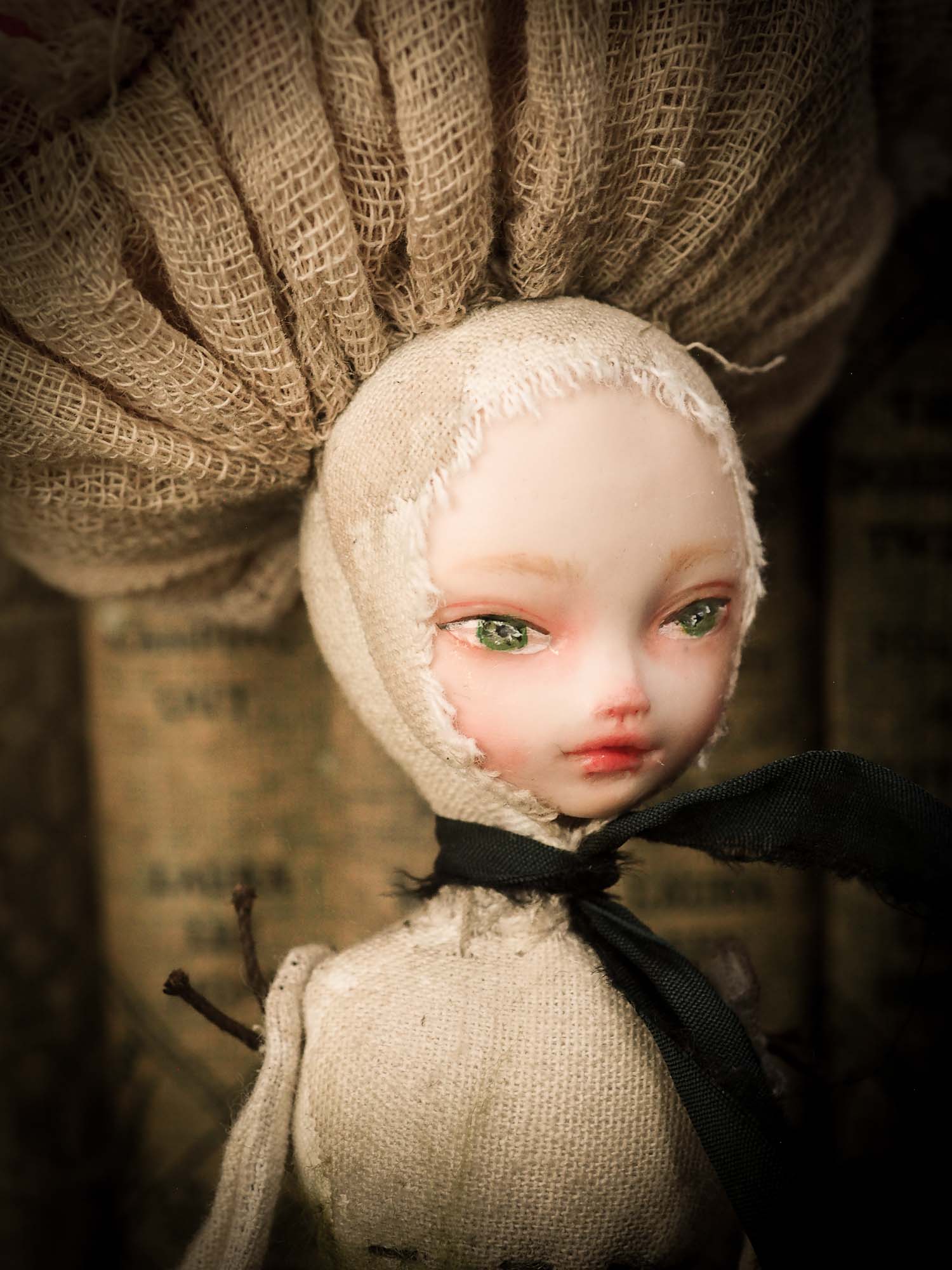 Their bodies are filled and shaped by hand, then sewn into a body that holds a beautiful air dry clay face, painted with my melancholic and mysterious eyes that you know so well, with a unique personality that makes each of them a unique piece of soft, huggable art.