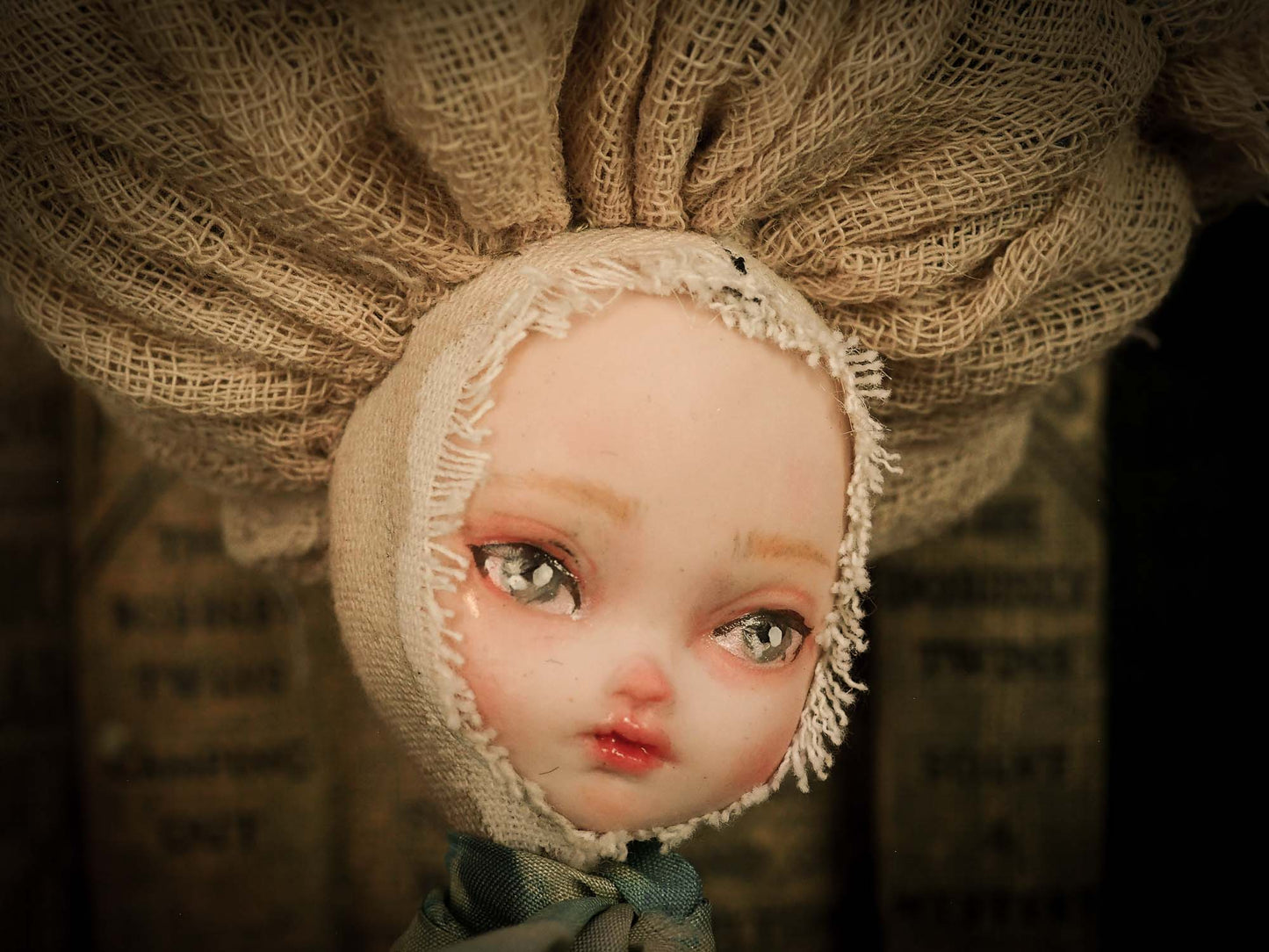 Their bodies are filled and shaped by hand, then sewn into a body that holds a beautiful air dry clay face, painted with my melancholic and mysterious eyes that you know so well, with a unique personality that makes each of them a unique piece of soft, huggable art.