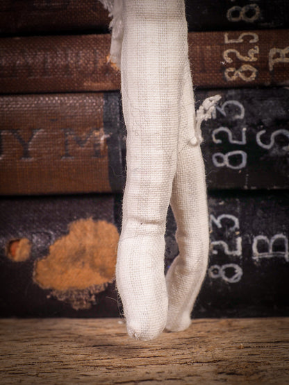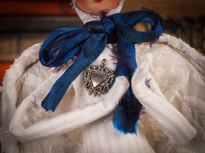 Approximately 12 Inches tall. Original art doll in hand dyed fabric with natural pigments, polymer clay face and mixed media applications.