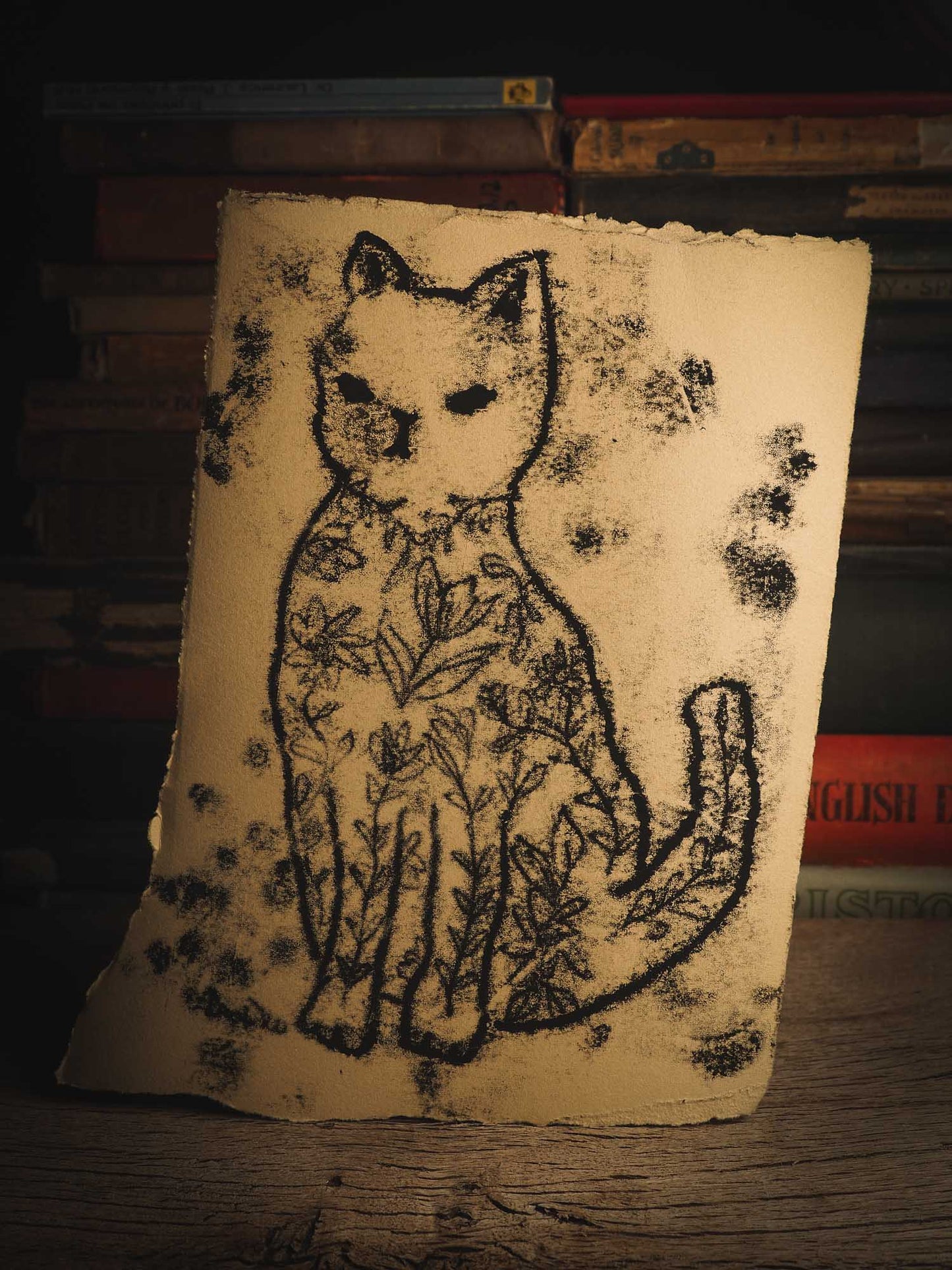 Neko, an original ink monoprint on printmaking paper by Idania Salcido (Danita Art) measures 9 x 7 inches, ready to be mounted on your favorite frame!