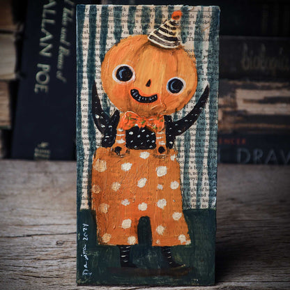 An adorable pumpkin ready for Halloween Night! With his orange polka dot trousers, his striped hat and a black shirt, I'm sure he will bring life to every Halloween reunion you choose to display him.